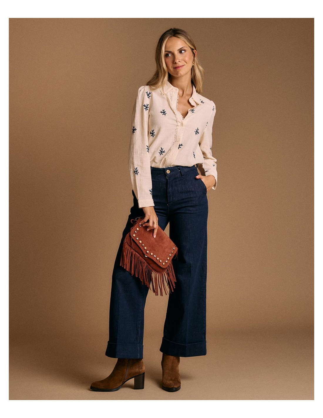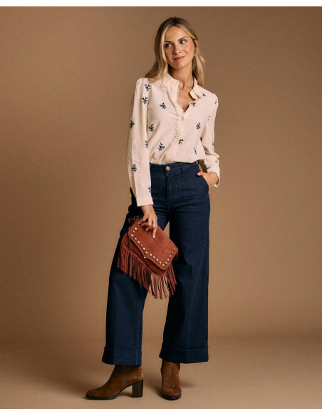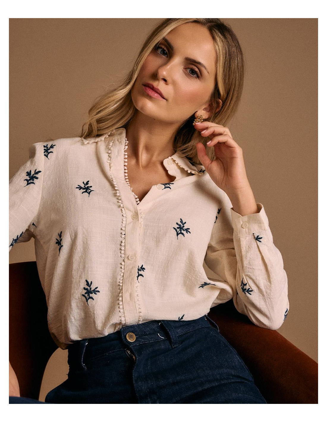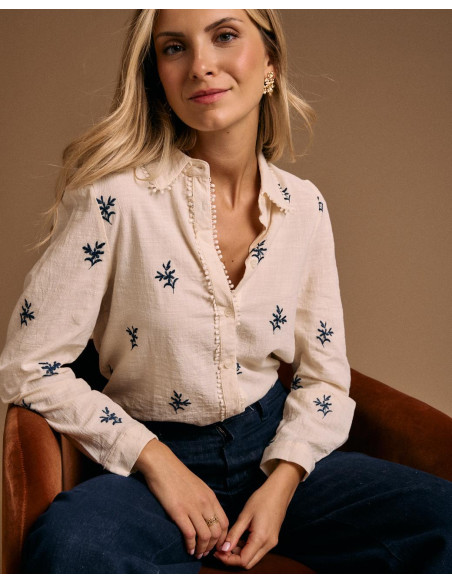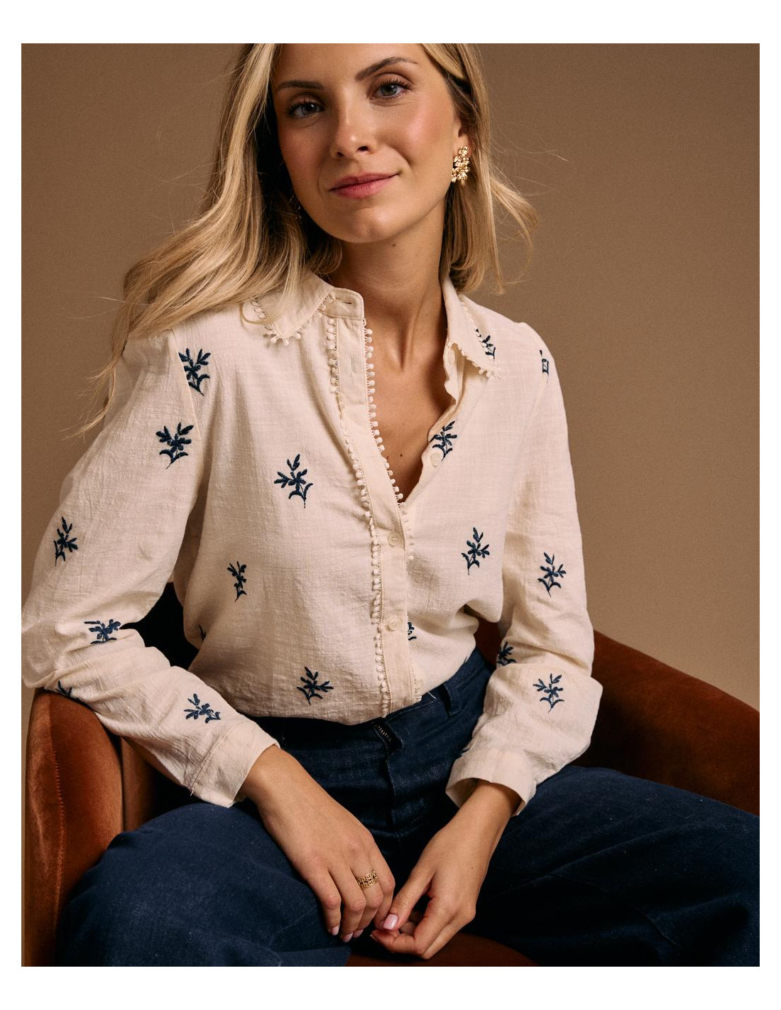 <p><span style="font-size: 10pt; font-family: Arial;">Camisa en color crudo con bordados en contraste. Diseño con cuello camisero adornado con puntilla, cierre de botones y manga larga con puños abotonados.</span></p>