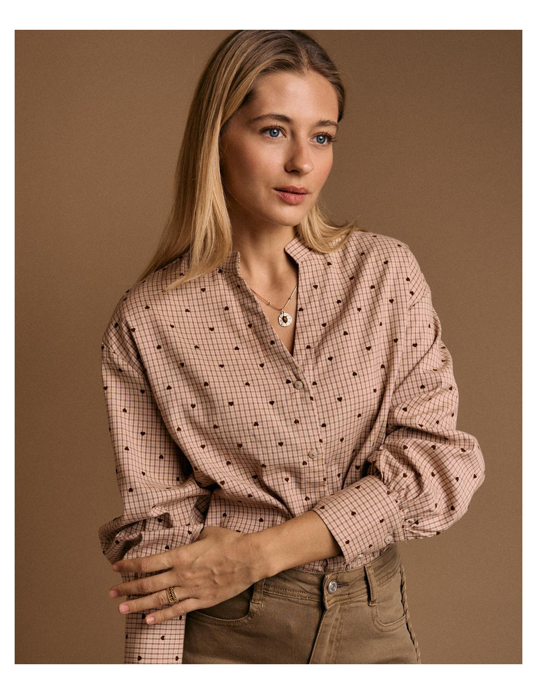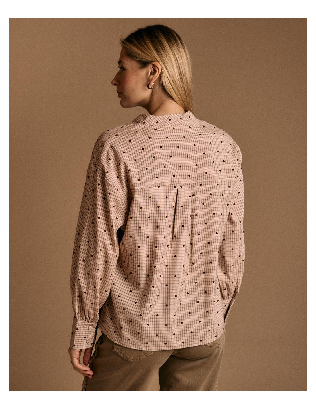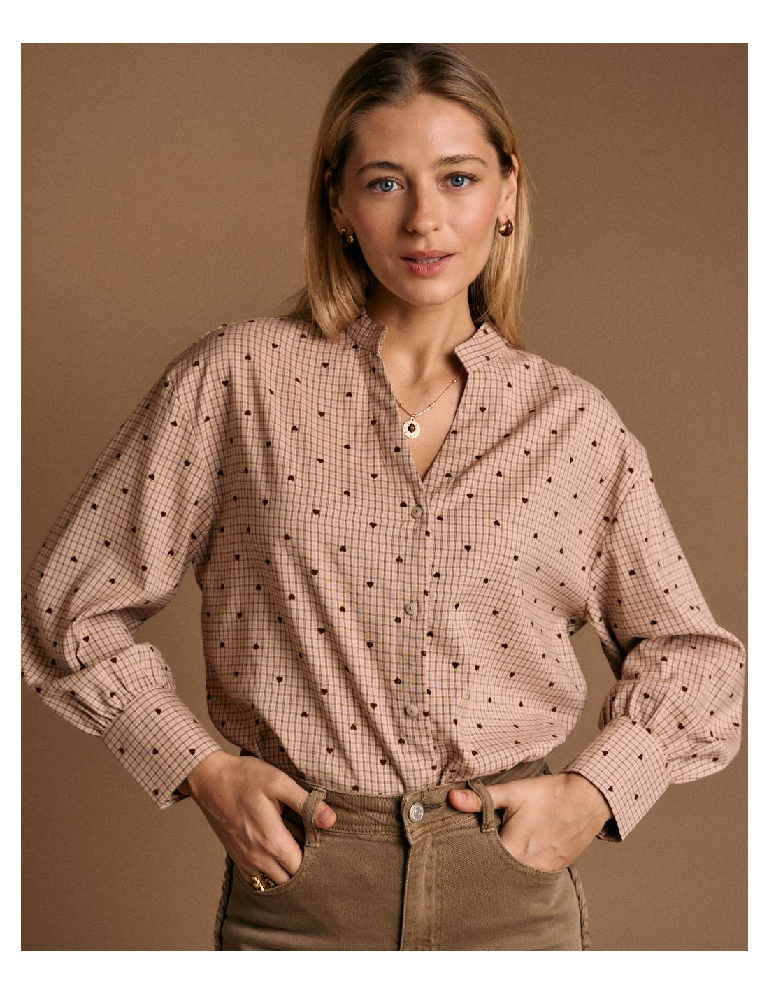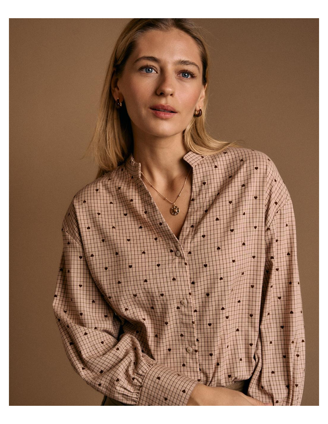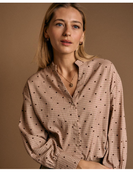<p><span style="font-size: 10pt; font-family: Arial;">Camisa de manga larga con estampado de cuadros y pequeños corazones en tonos marrones. escote en pico y cierre de botones en la parte delantera.</span></p>
