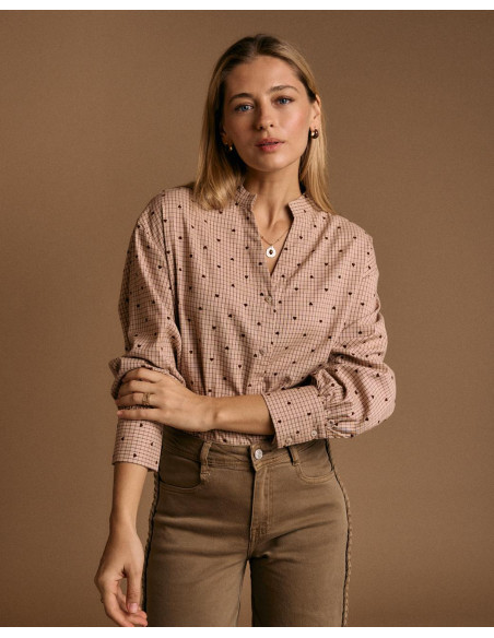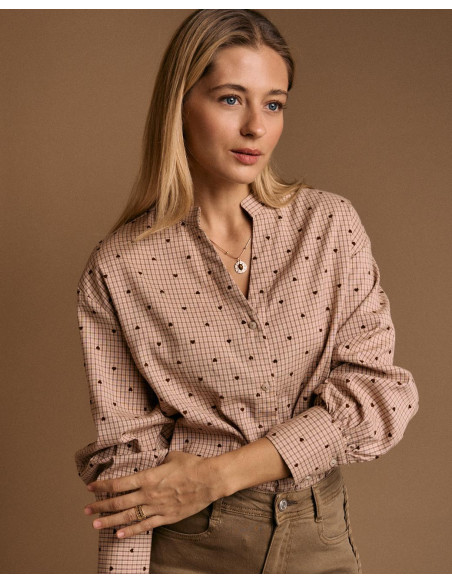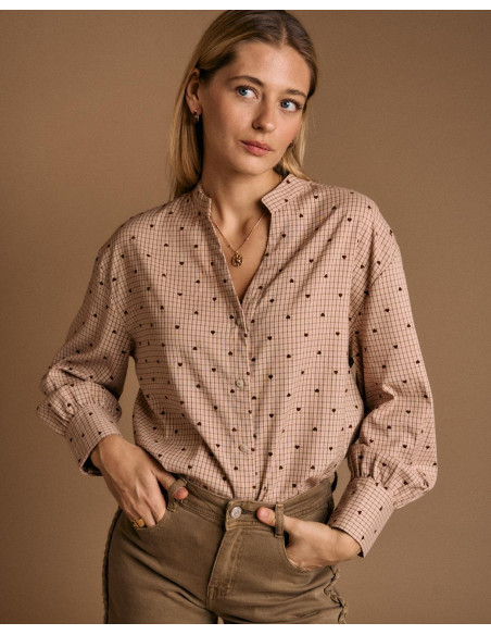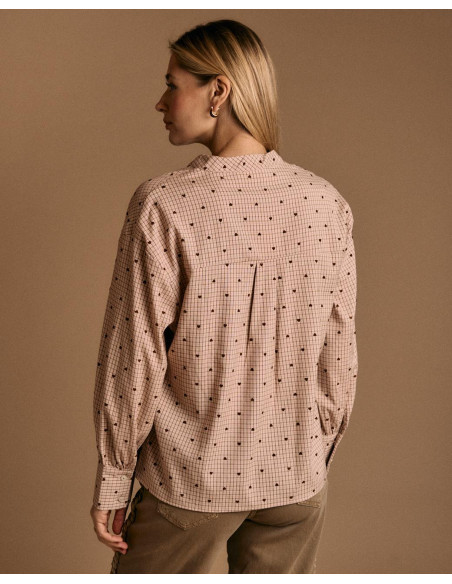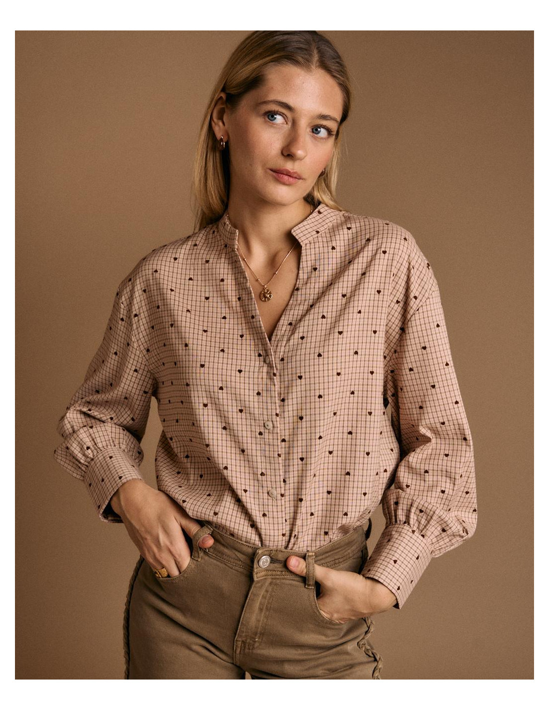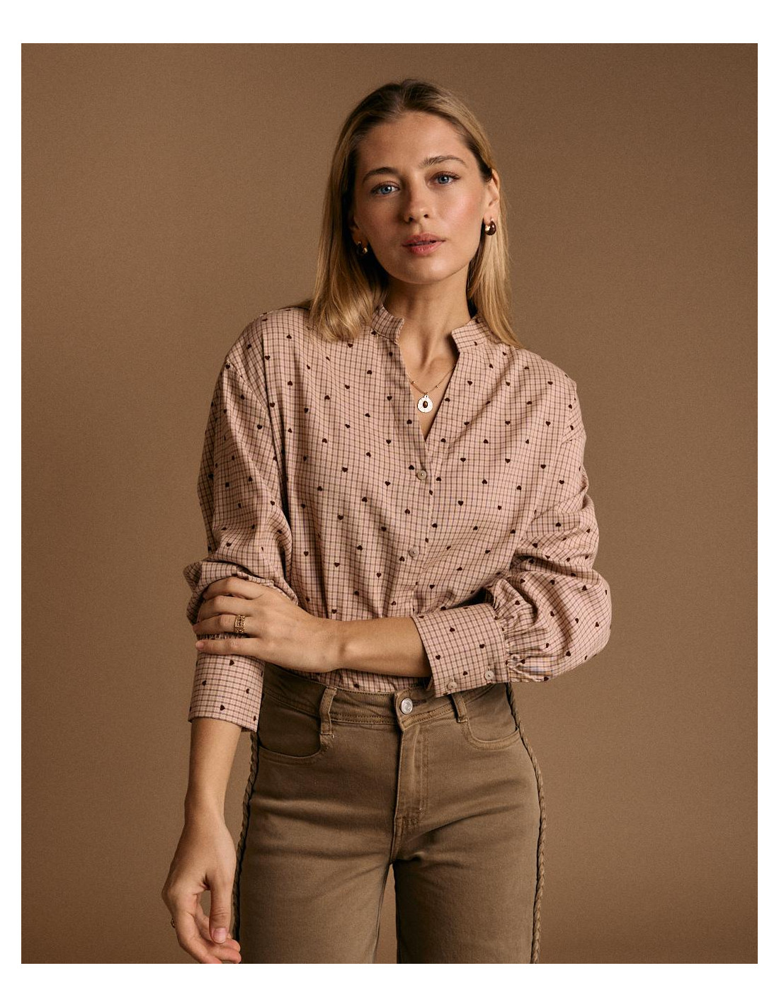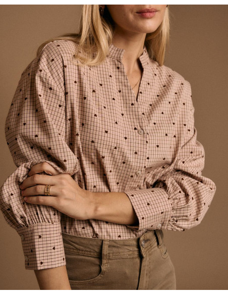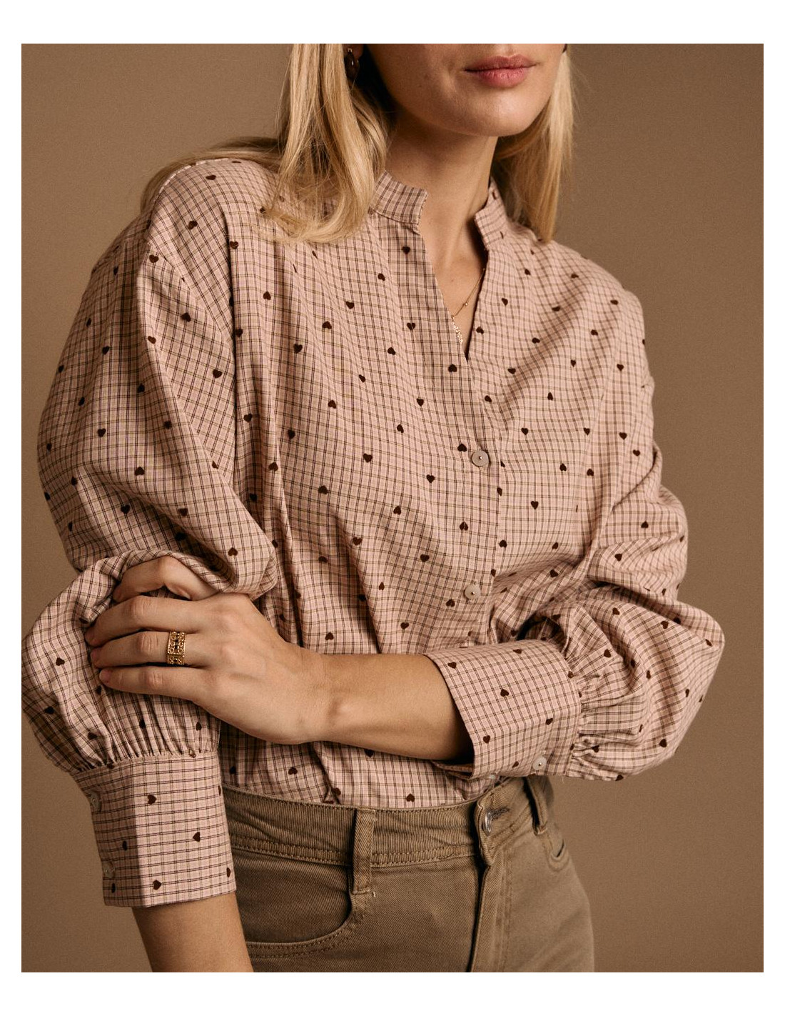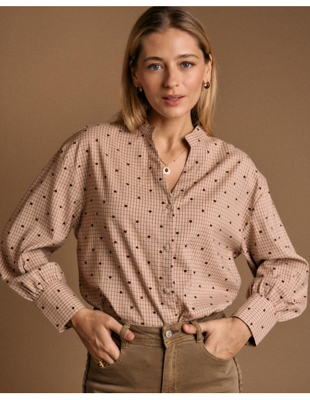 <p><span style="font-size: 10pt; font-family: Arial;">Camisa de manga larga con estampado de cuadros y pequeños corazones en tonos marrones. escote en pico y cierre de botones en la parte delantera.</span></p>