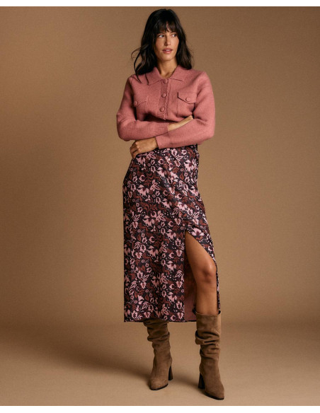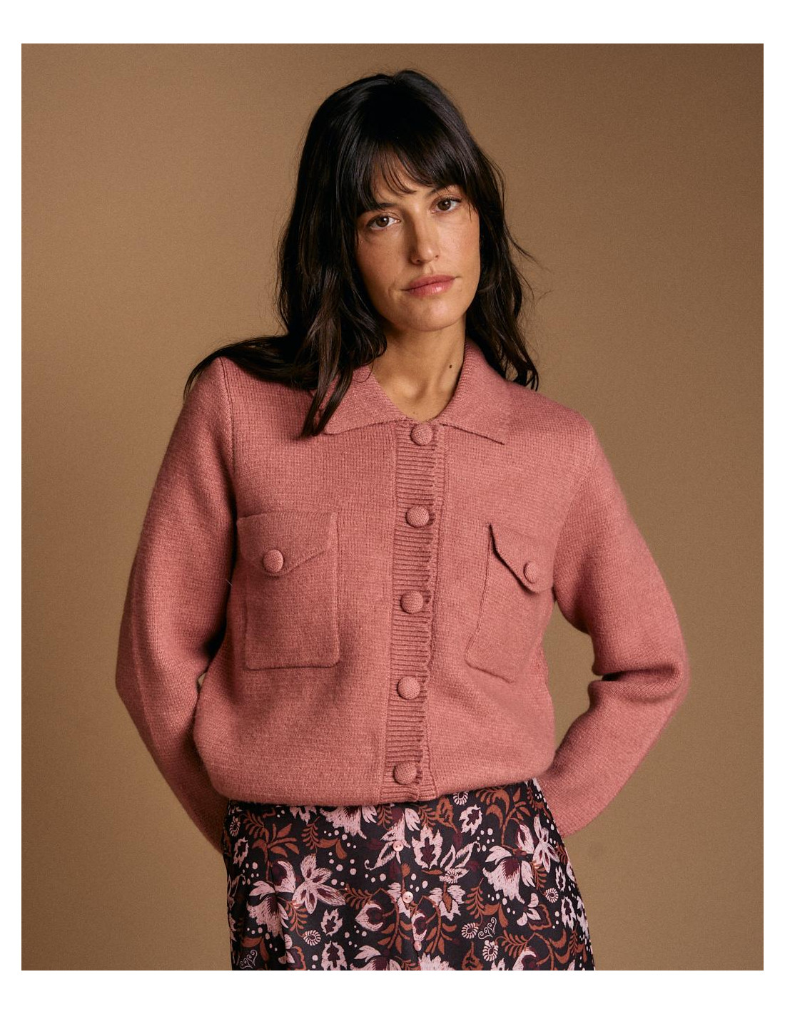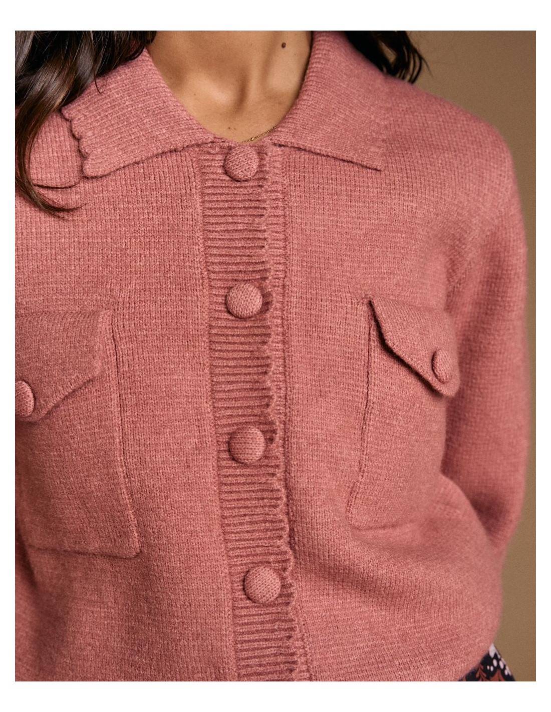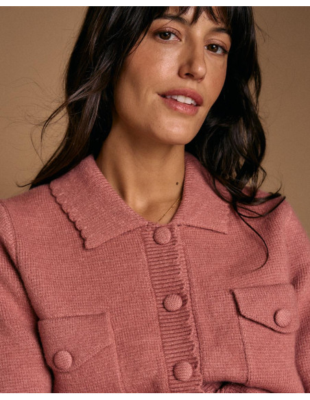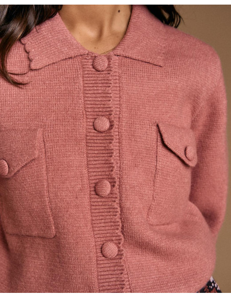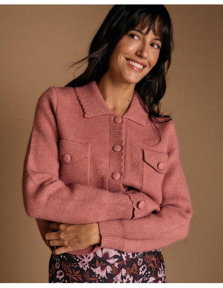 <p><span style="font-size: 10pt; font-family: Arial;">Cárdigan en color rosa. Diseño con cuello de solapa, cierre de botones en la parte delantera y bolsillos frontales con solapa.</span></p>