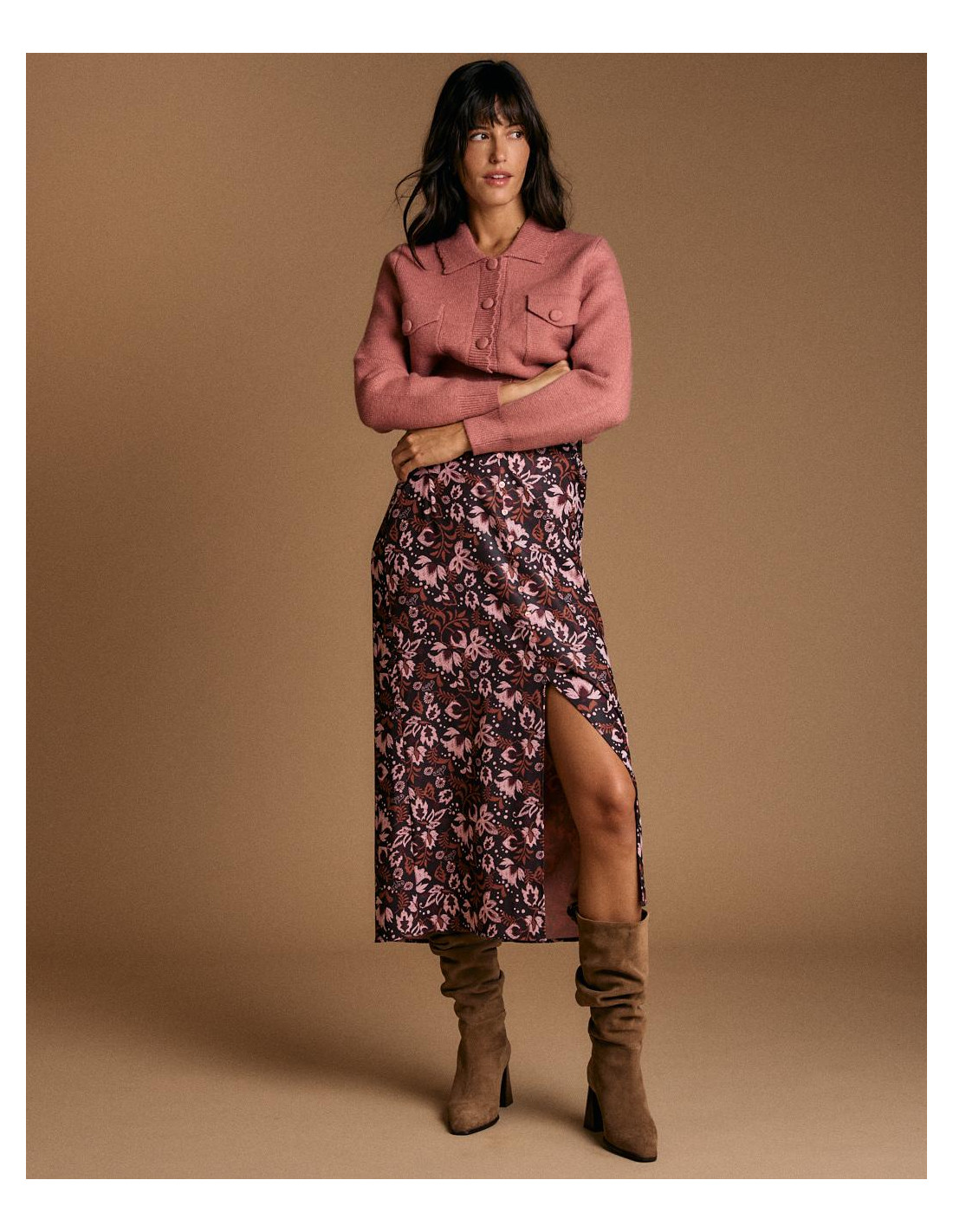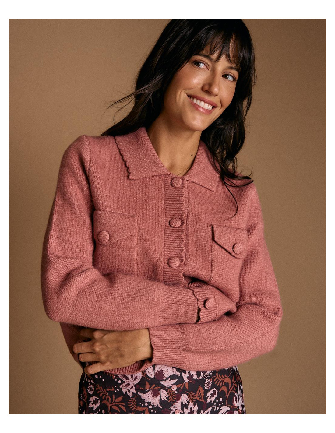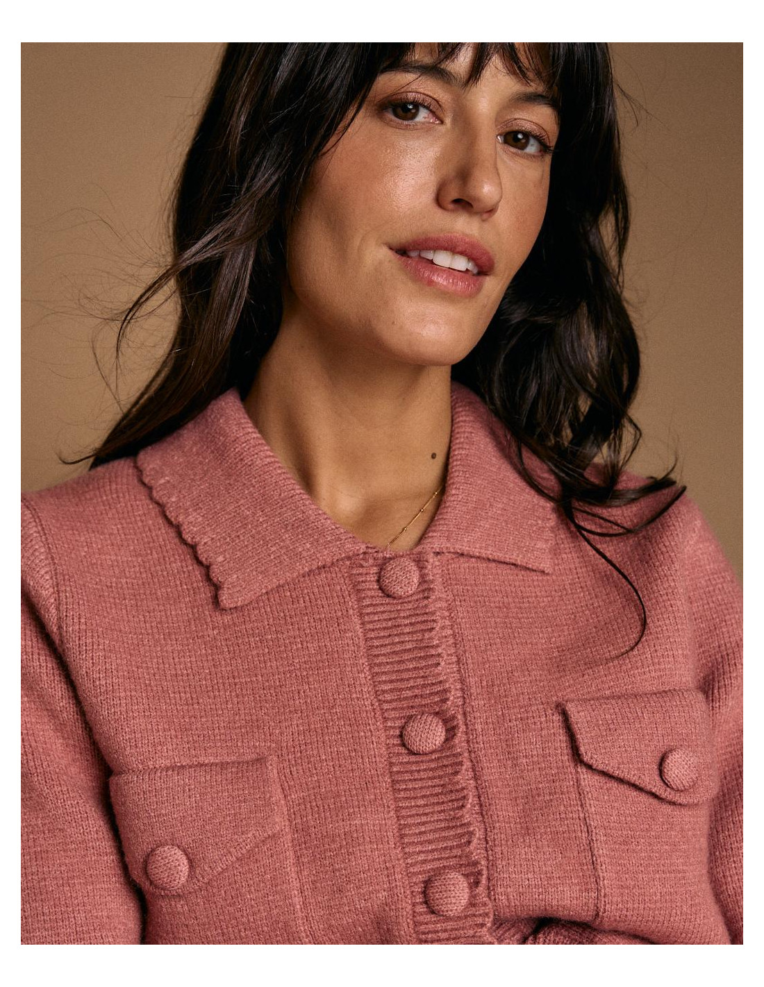 <p><span style="font-size: 10pt; font-family: Arial;">Cárdigan en color rosa. Diseño con cuello de solapa, cierre de botones en la parte delantera y bolsillos frontales con solapa.</span></p>