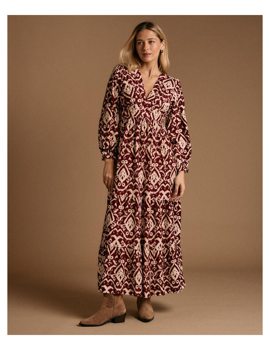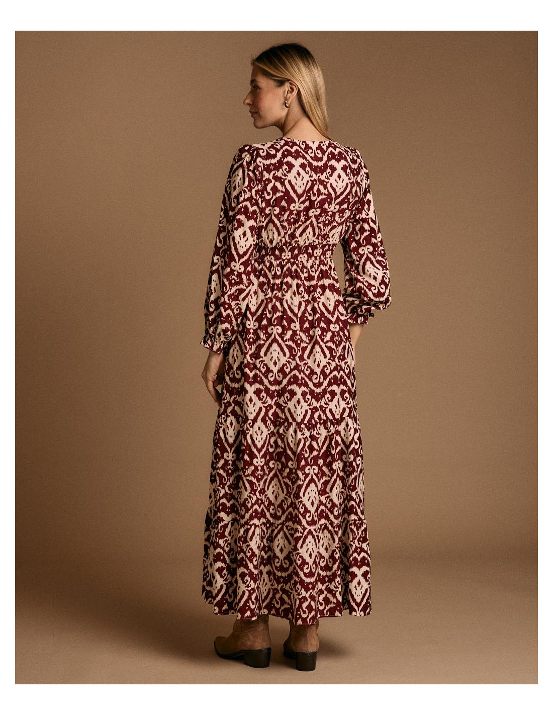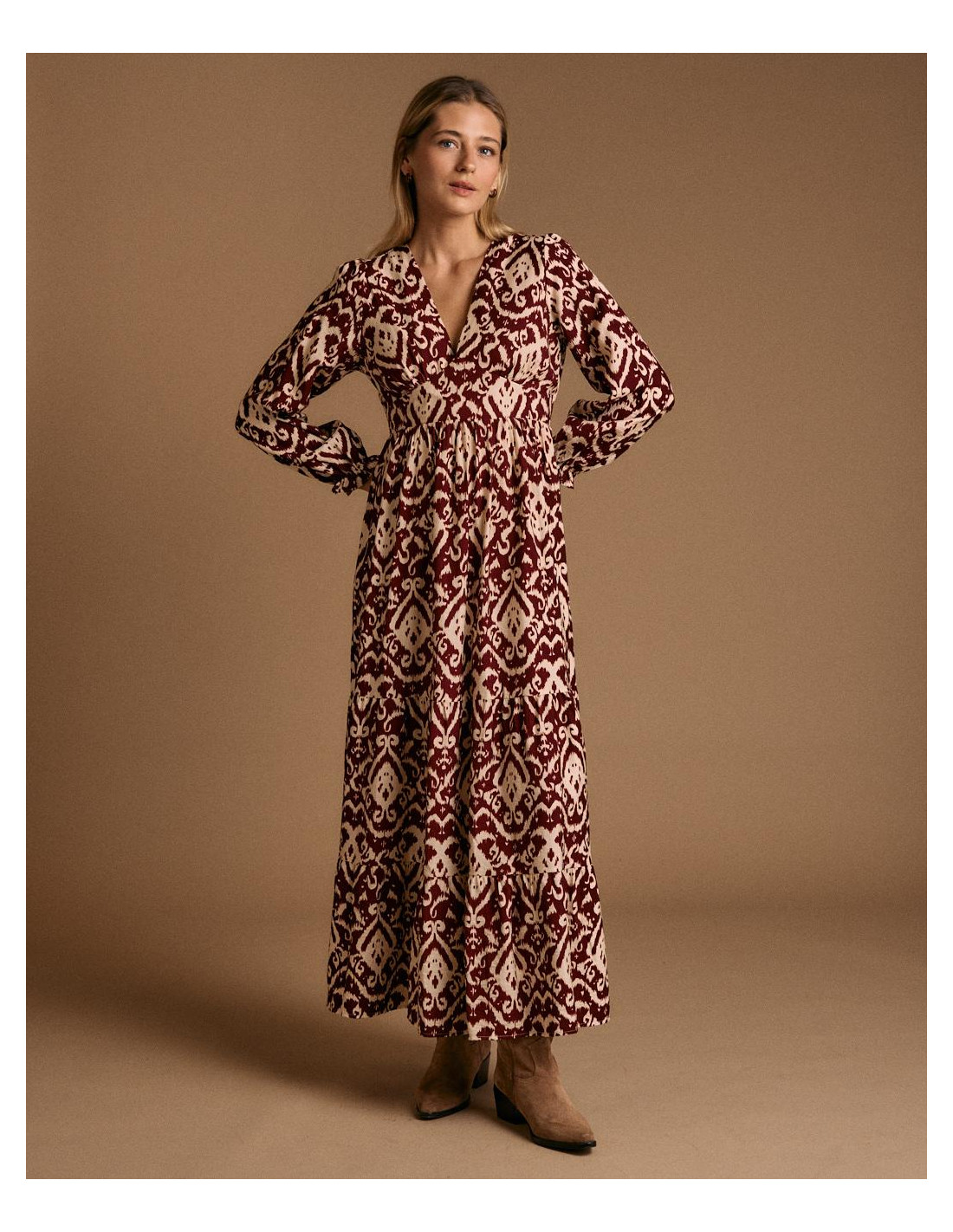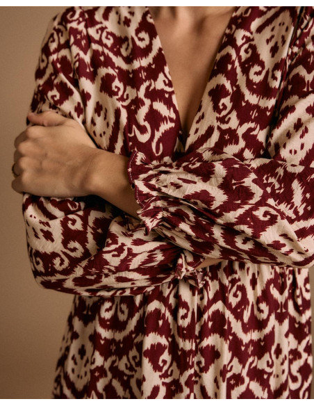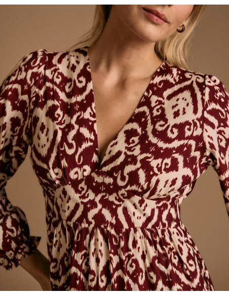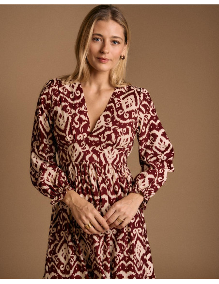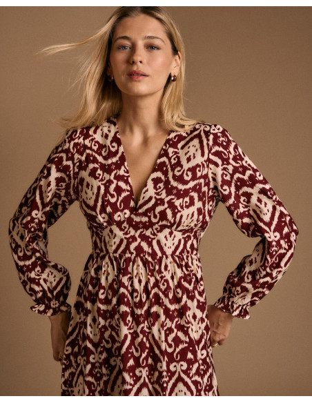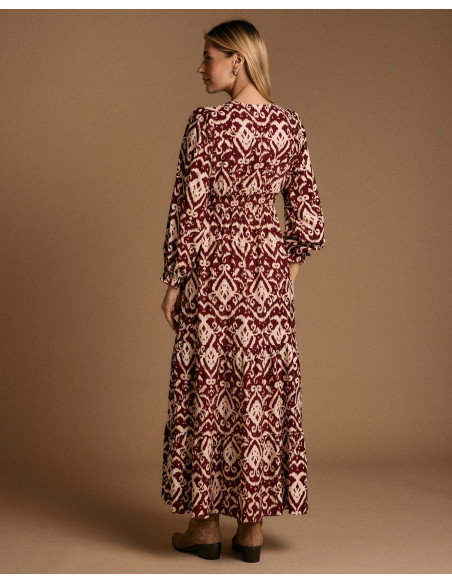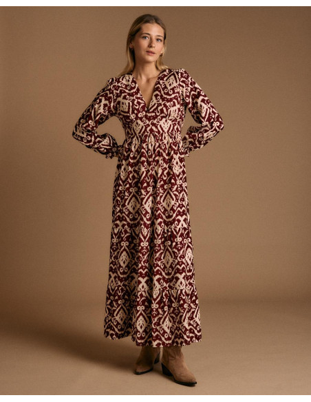 <p><span style="font-size: 10pt; font-family: Arial;">Vestido largo con estampado en tonos burdeos y beige. Diseño de manga larga abullonada, escote en pico y corte elástico en la cintura para un ajuste femenino.</span></p>