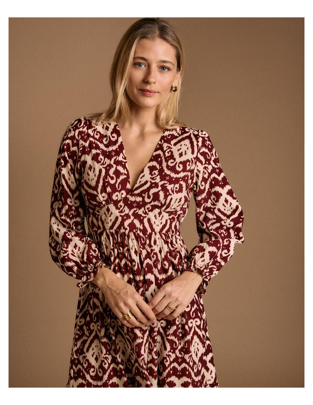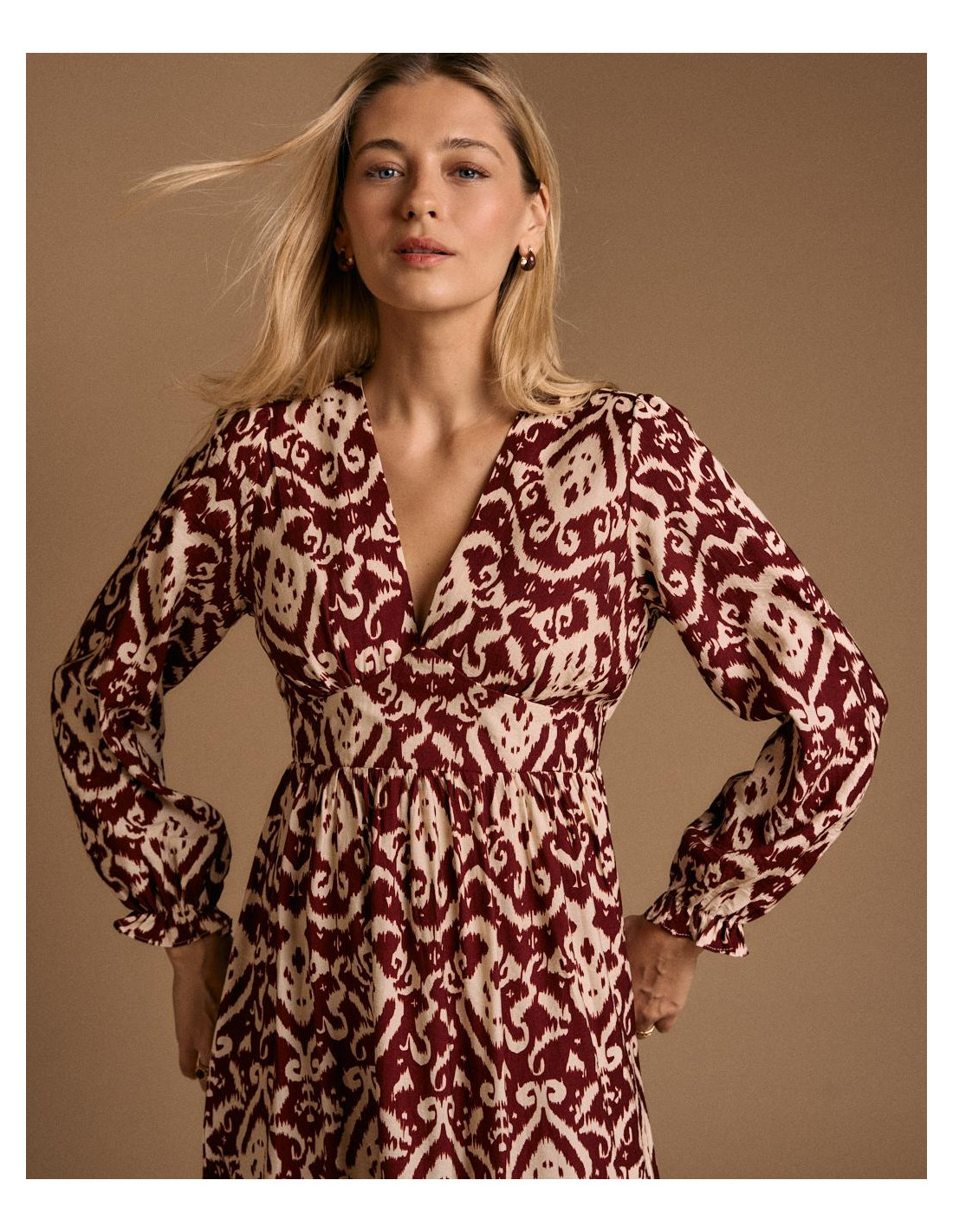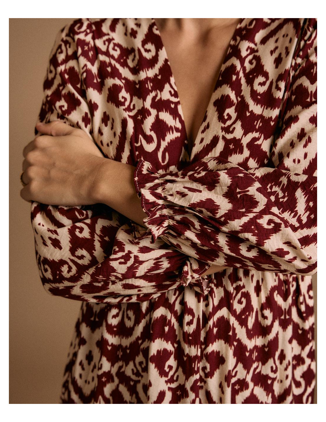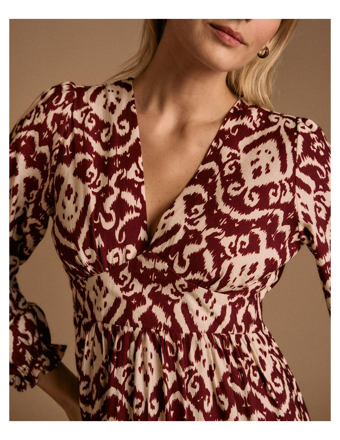 <p><span style="font-size: 10pt; font-family: Arial;">Vestido largo con estampado en tonos burdeos y beige. Diseño de manga larga abullonada, escote en pico y corte elástico en la cintura para un ajuste femenino.</span></p>