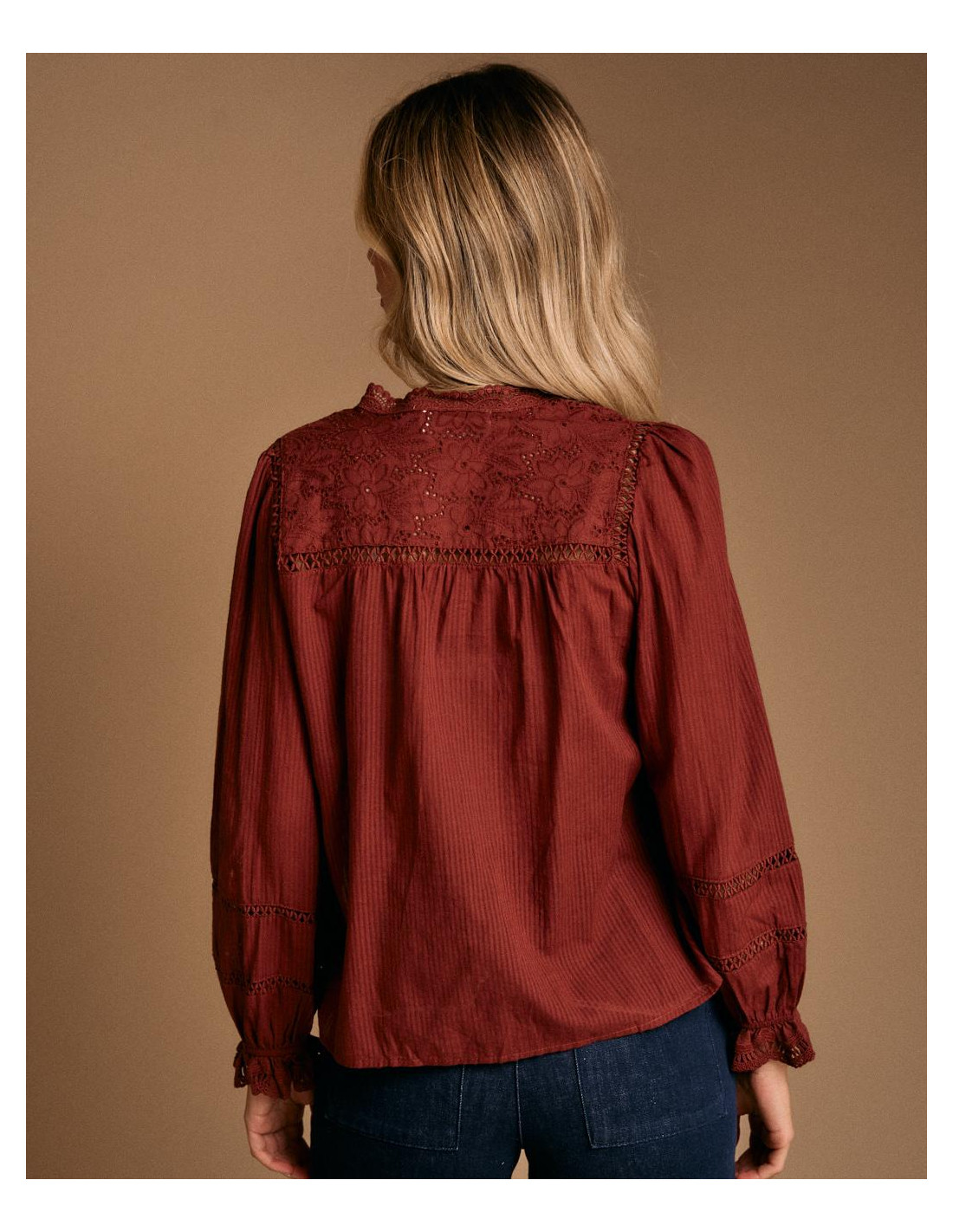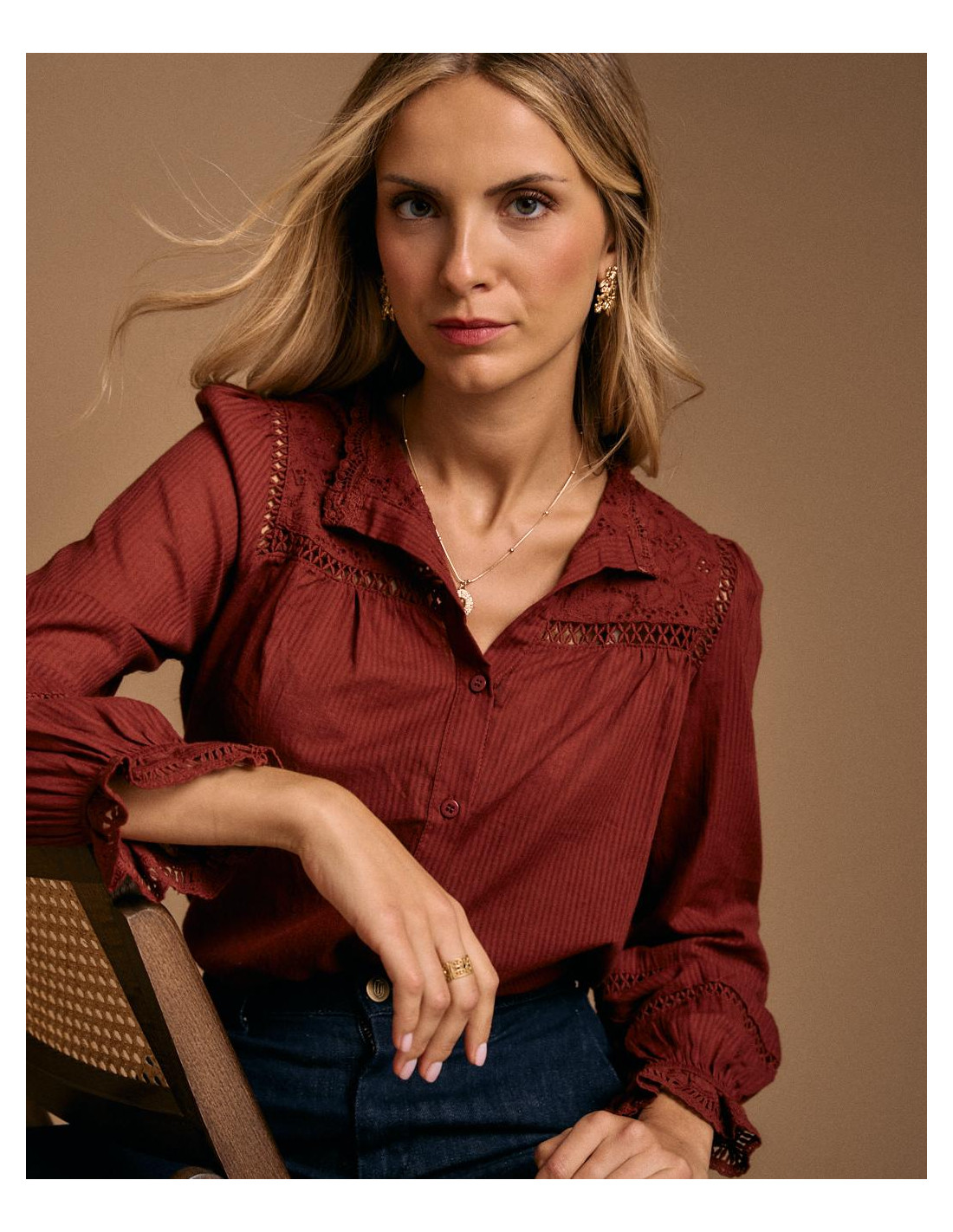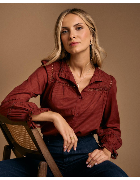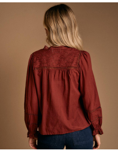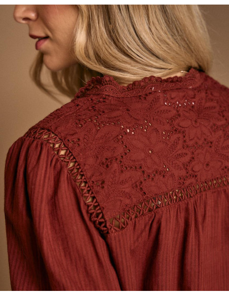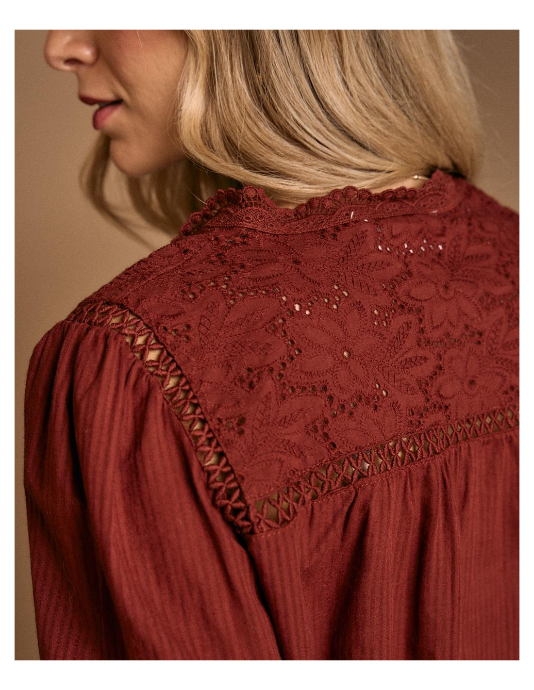 <p><span style="font-size: 10pt; font-family: Arial;">Blusa en color teja con delicados bordados al tono en la parte superior y en las mangas. Diseño con cuello redondo, cierre parcial de botones y puños fruncidos con detalle.</span></p>