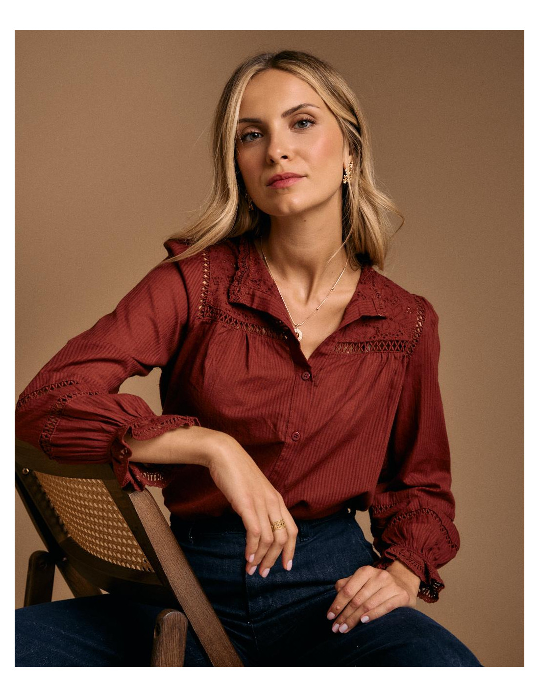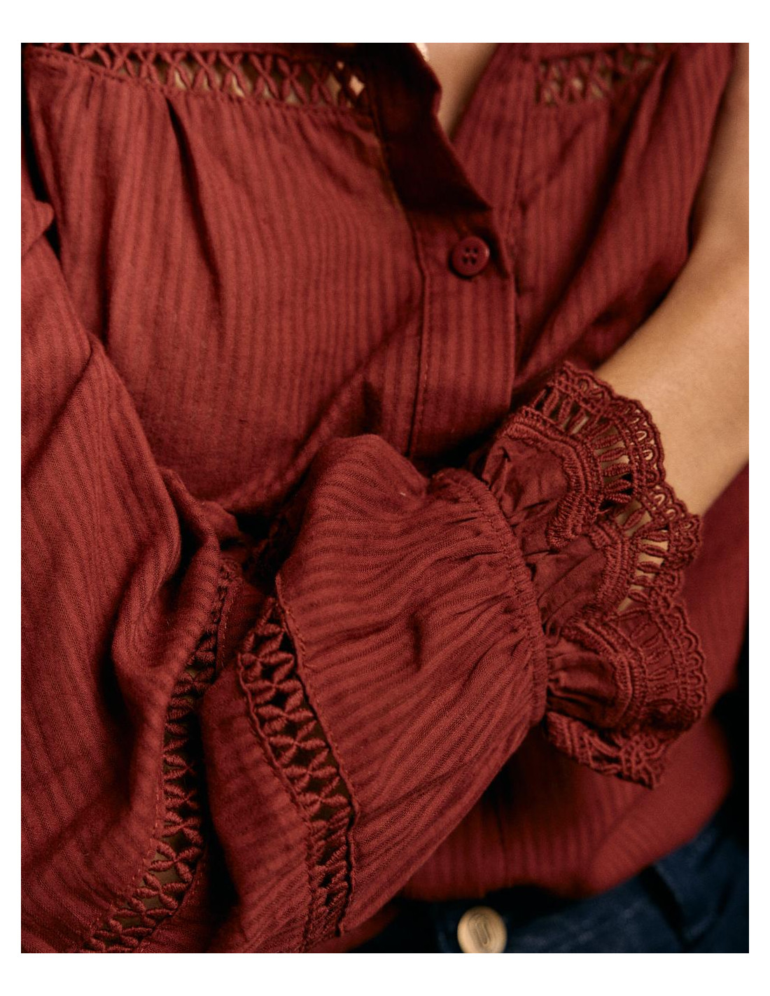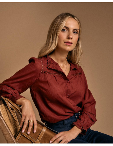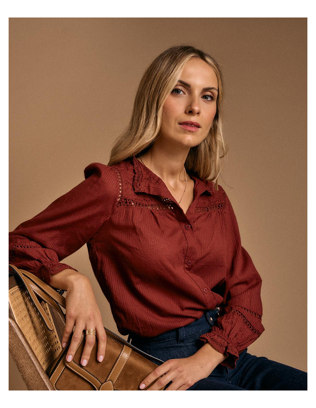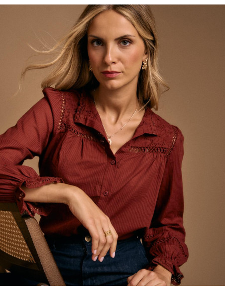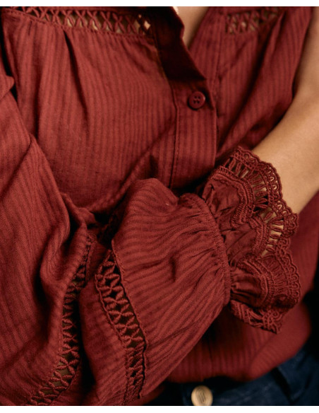 <p><span style="font-size: 10pt; font-family: Arial;">Blusa en color teja con delicados bordados al tono en la parte superior y en las mangas. Diseño con cuello redondo, cierre parcial de botones y puños fruncidos con detalle.</span></p>