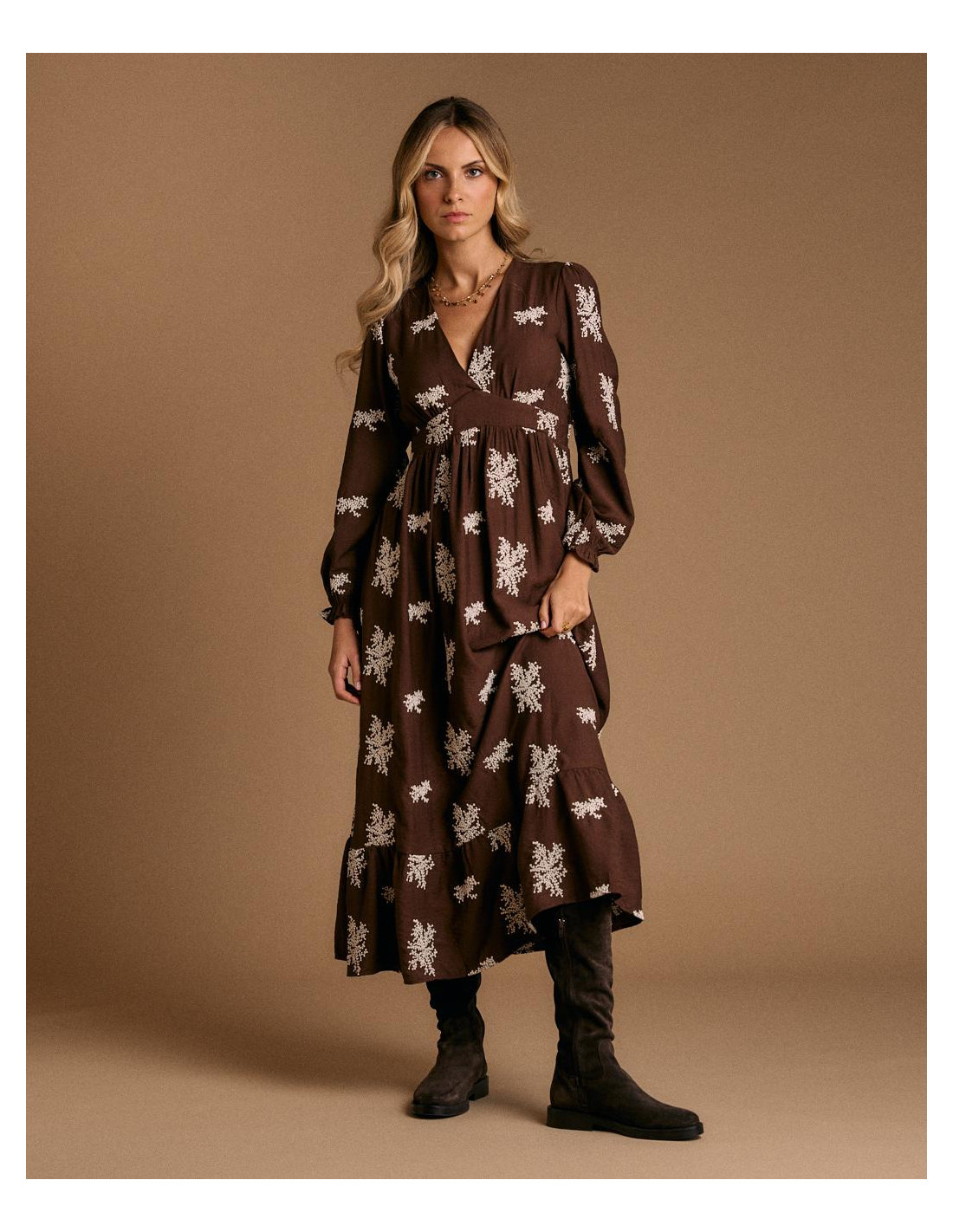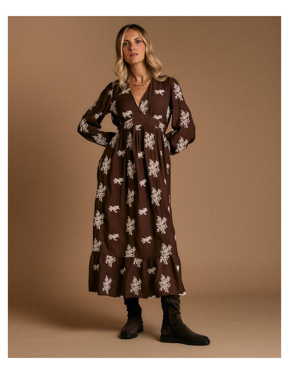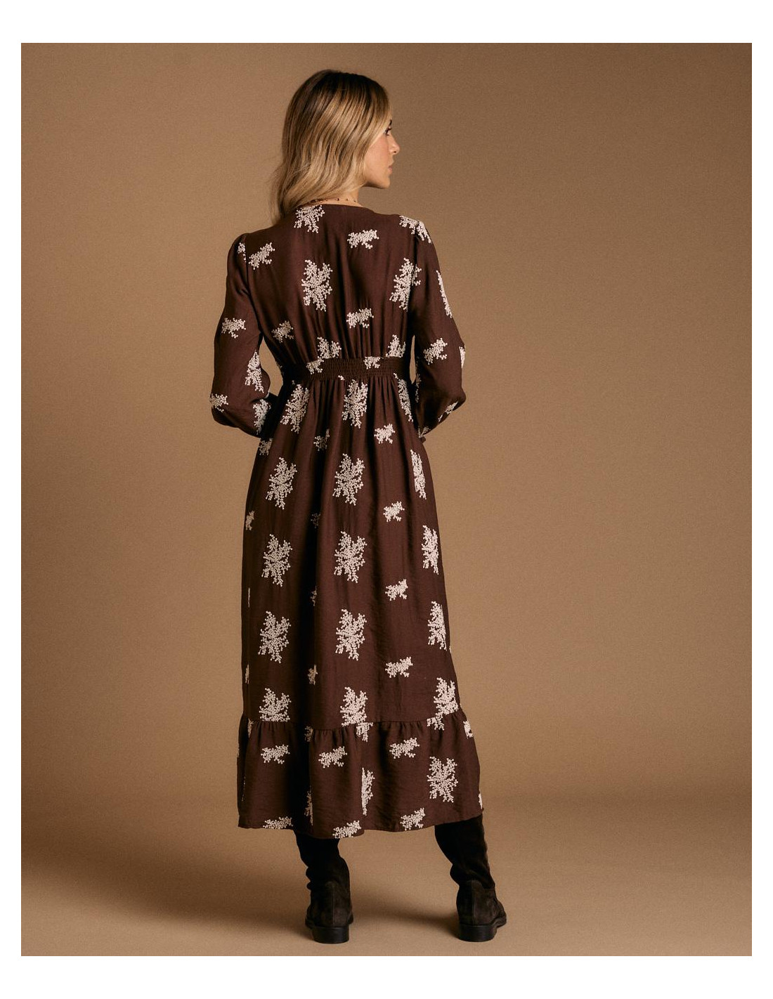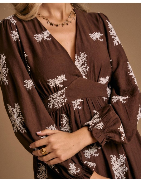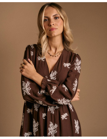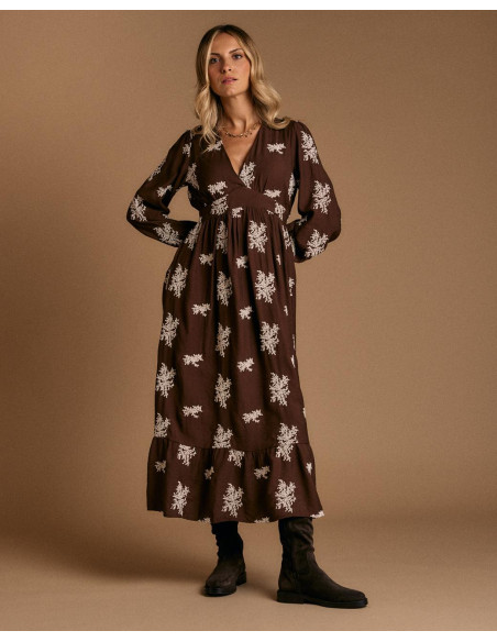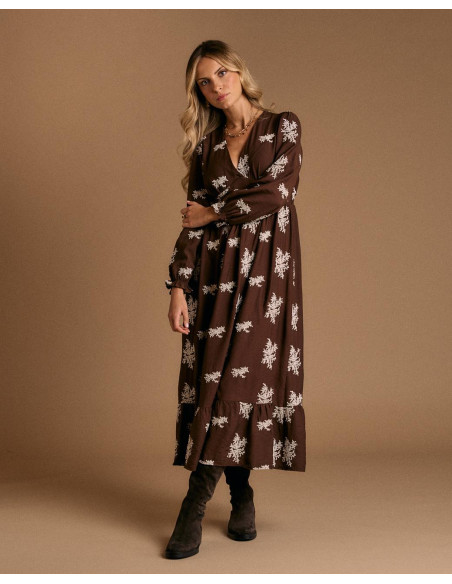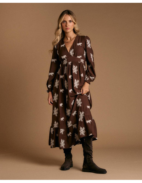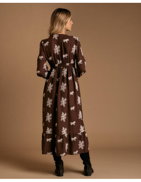 <p><span style="font-size: 10pt; font-family: Arial;">Vestido largo en color chocolate con estampado floral en tono claro. Presenta escote en pico, manga larga y ajuste elástico bajo el pecho que aporta comodidad y define la figura.</span></p>
