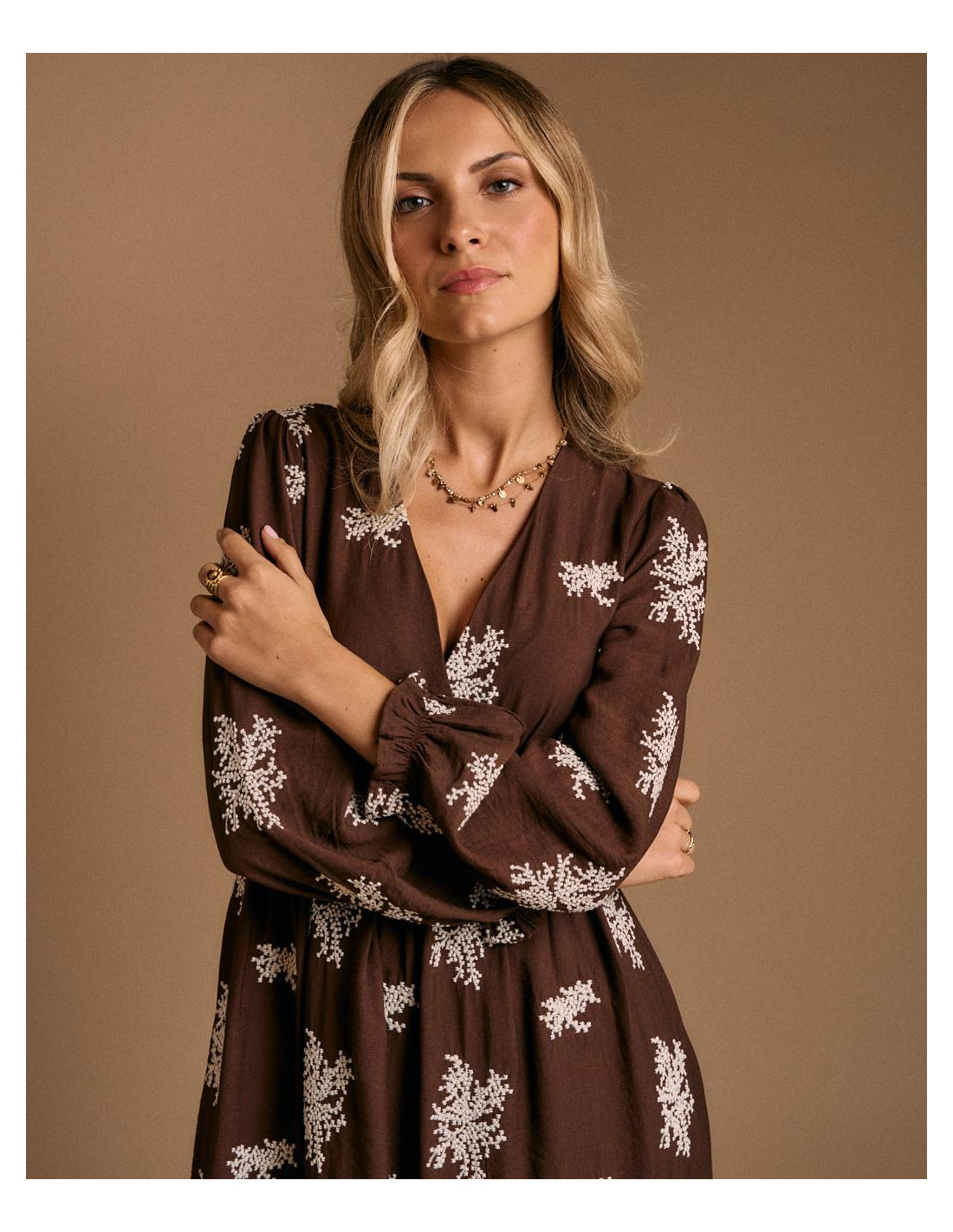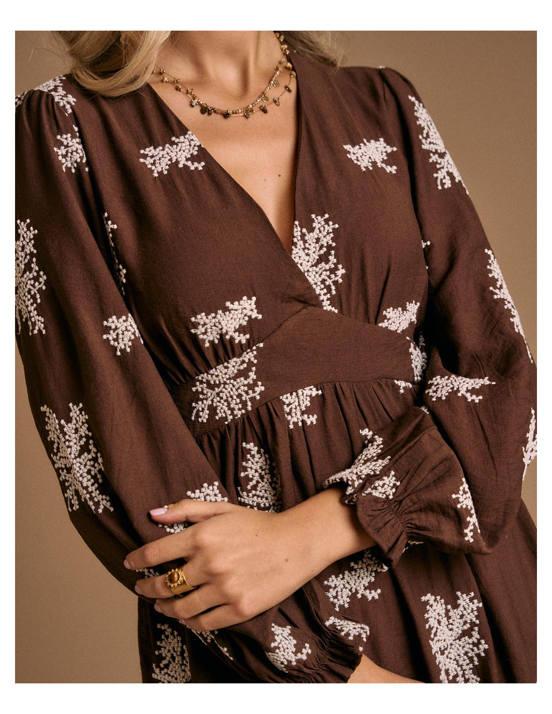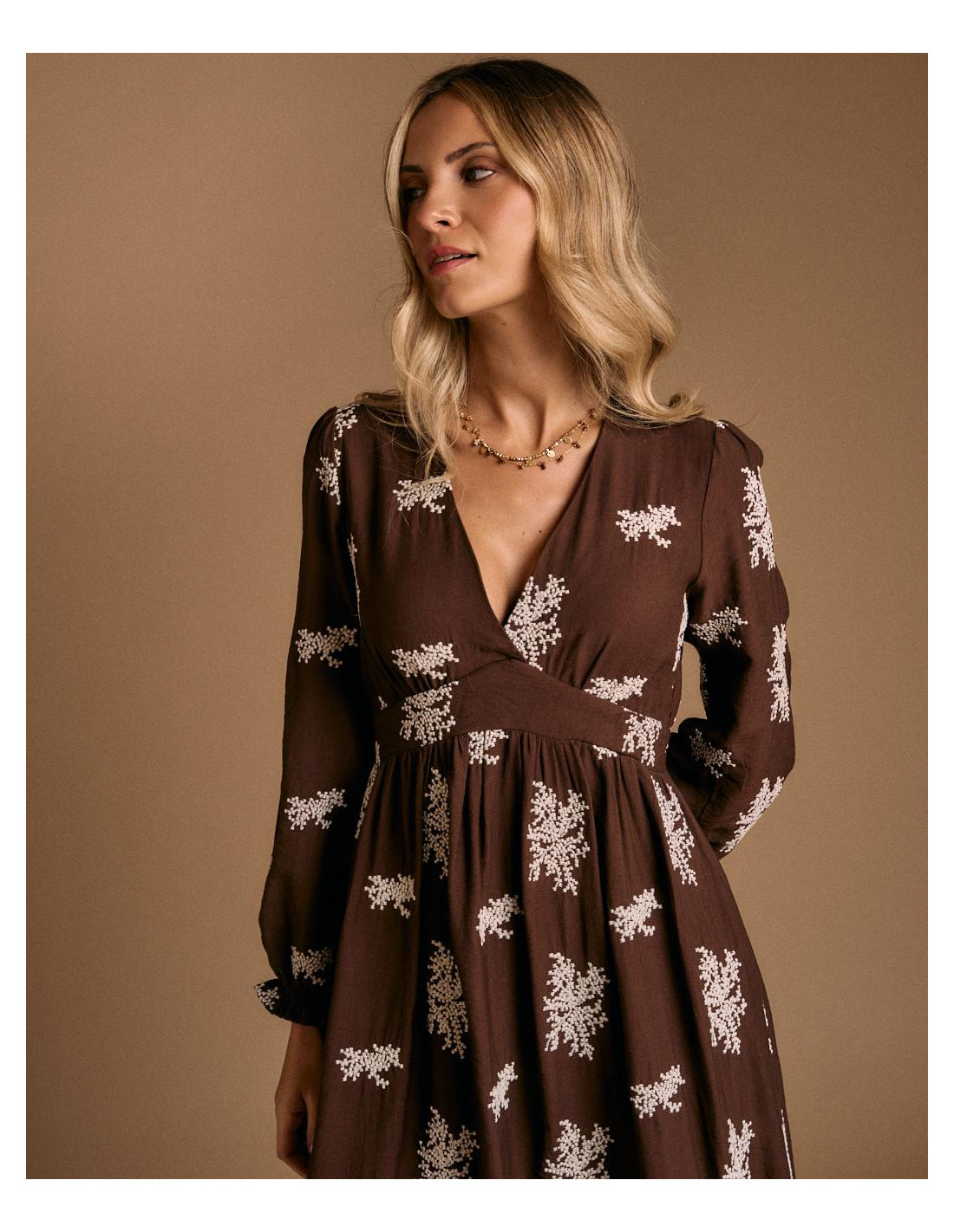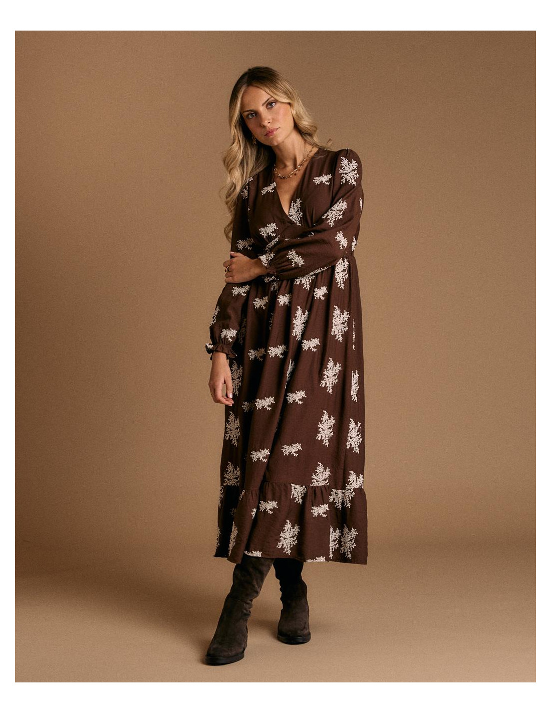 <p><span style="font-size: 10pt; font-family: Arial;">Vestido largo en color chocolate con estampado floral en tono claro. Presenta escote en pico, manga larga y ajuste elástico bajo el pecho que aporta comodidad y define la figura.</span></p>