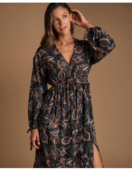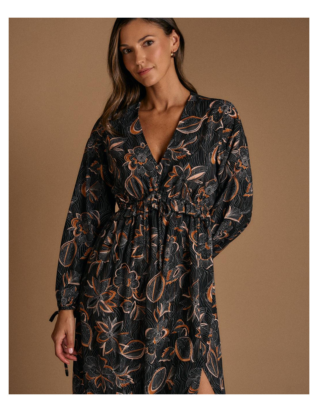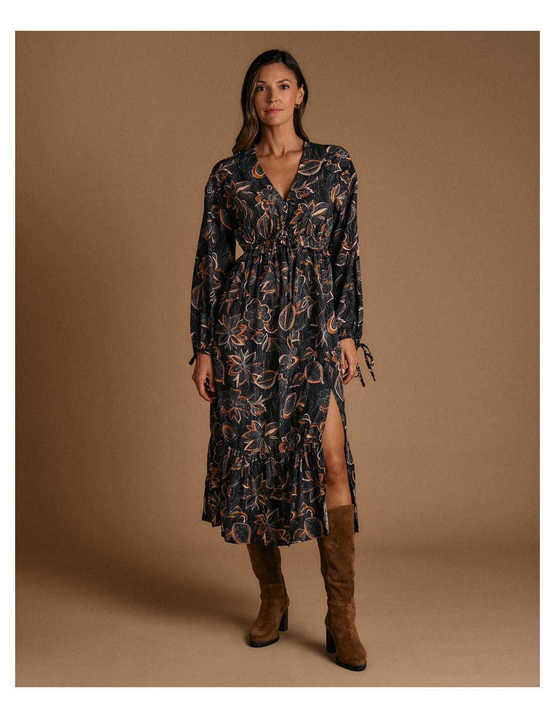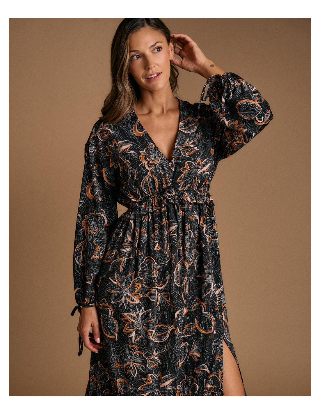 <p><span style="font-size: 10pt; font-family: Arial;">Vestido largo estampado en color negro. Presenta escote en pico, cintura elástica y manga larga ligeramente abullonada. Su tejido fluido realza la silueta y aporta movimiento al caminar.</span></p>