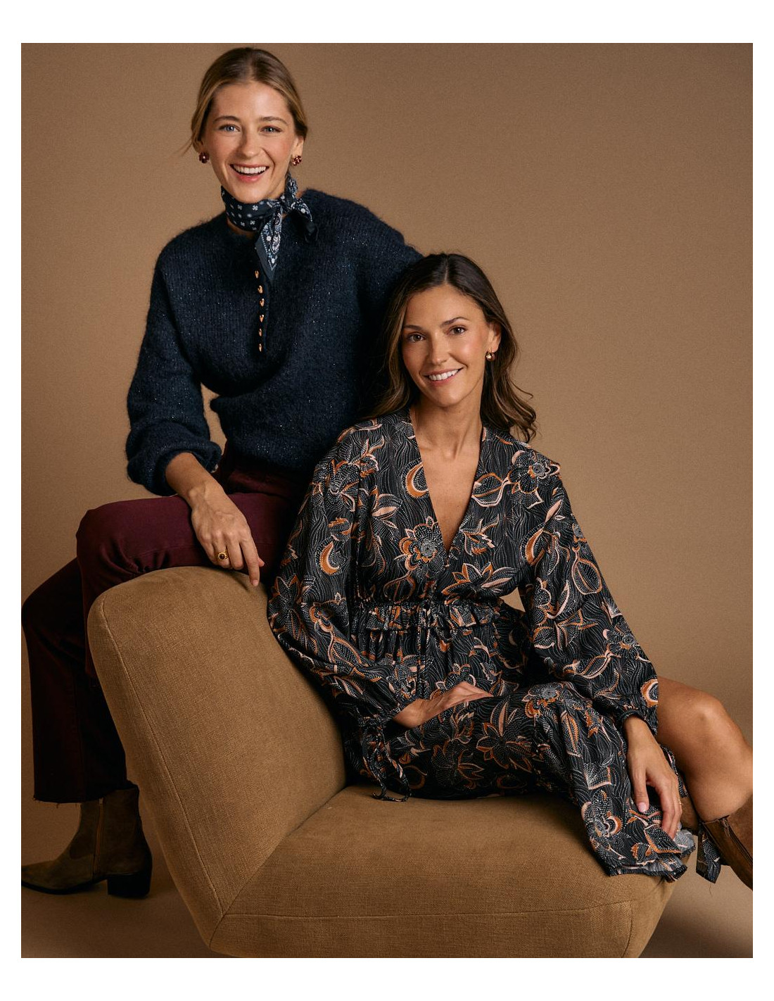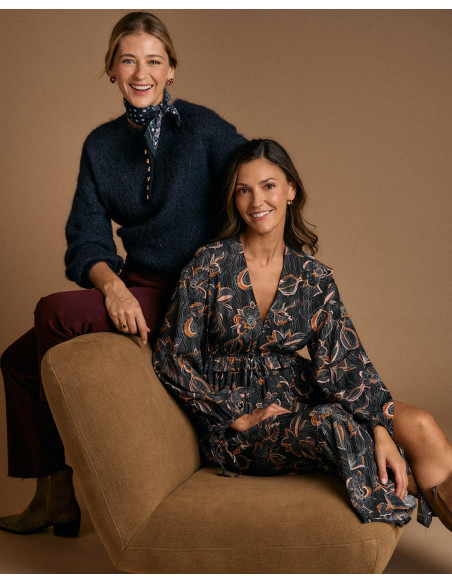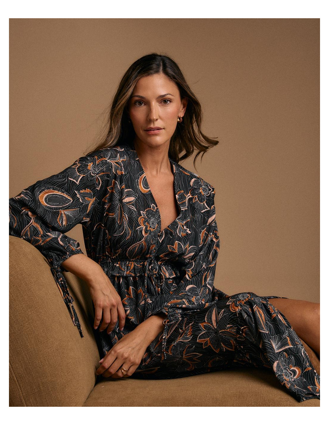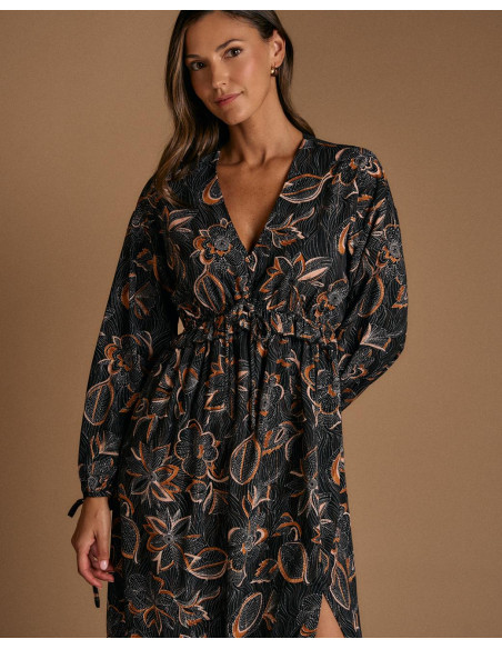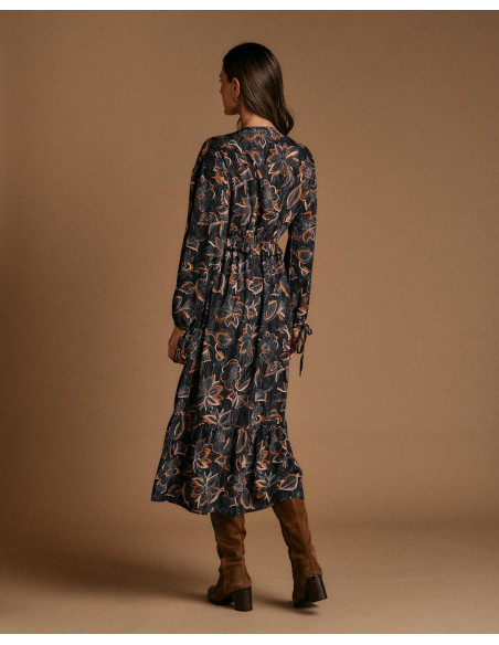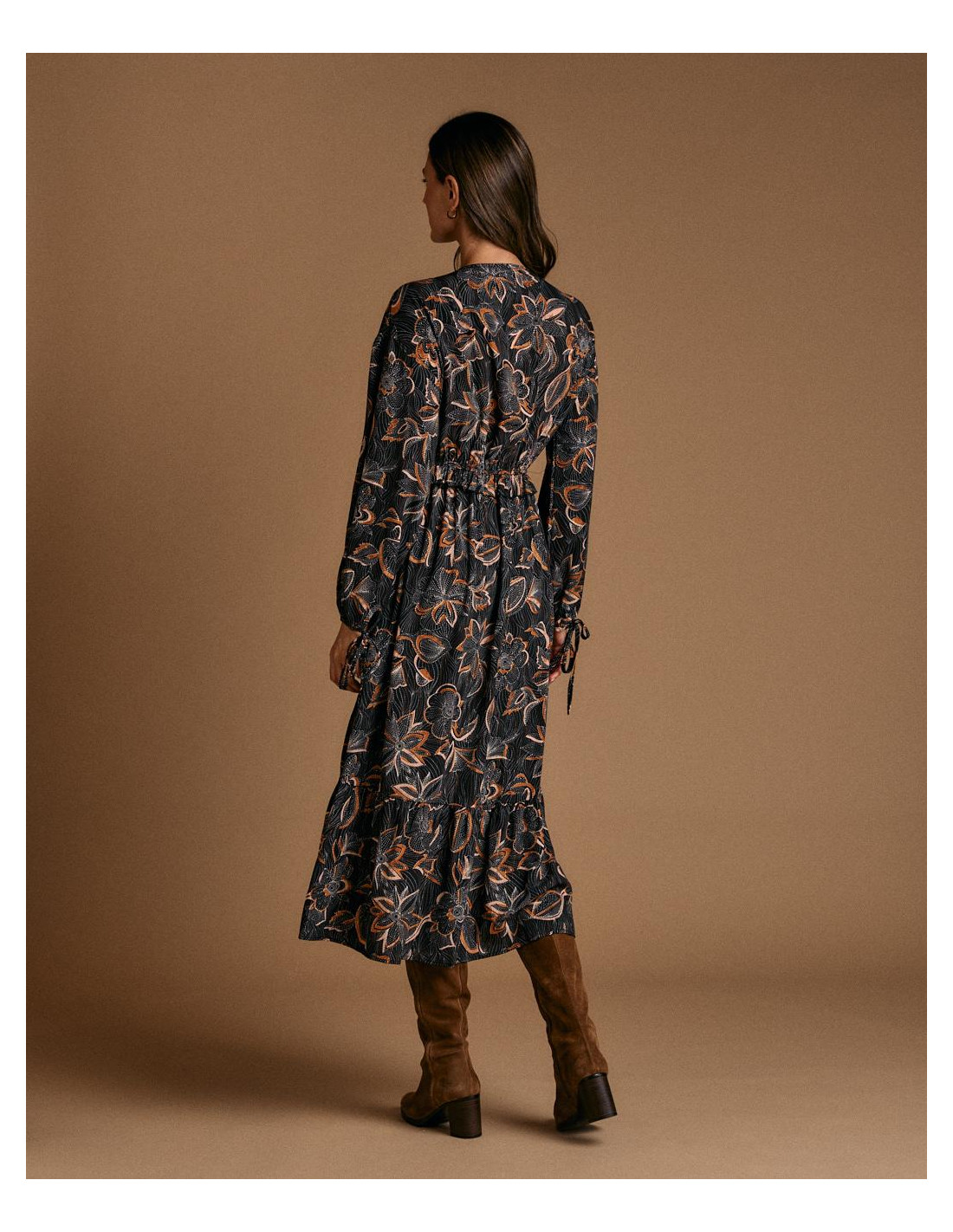 <p><span style="font-size: 10pt; font-family: Arial;">Vestido largo estampado en color negro. Presenta escote en pico, cintura elástica y manga larga ligeramente abullonada. Su tejido fluido realza la silueta y aporta movimiento al caminar.</span></p>