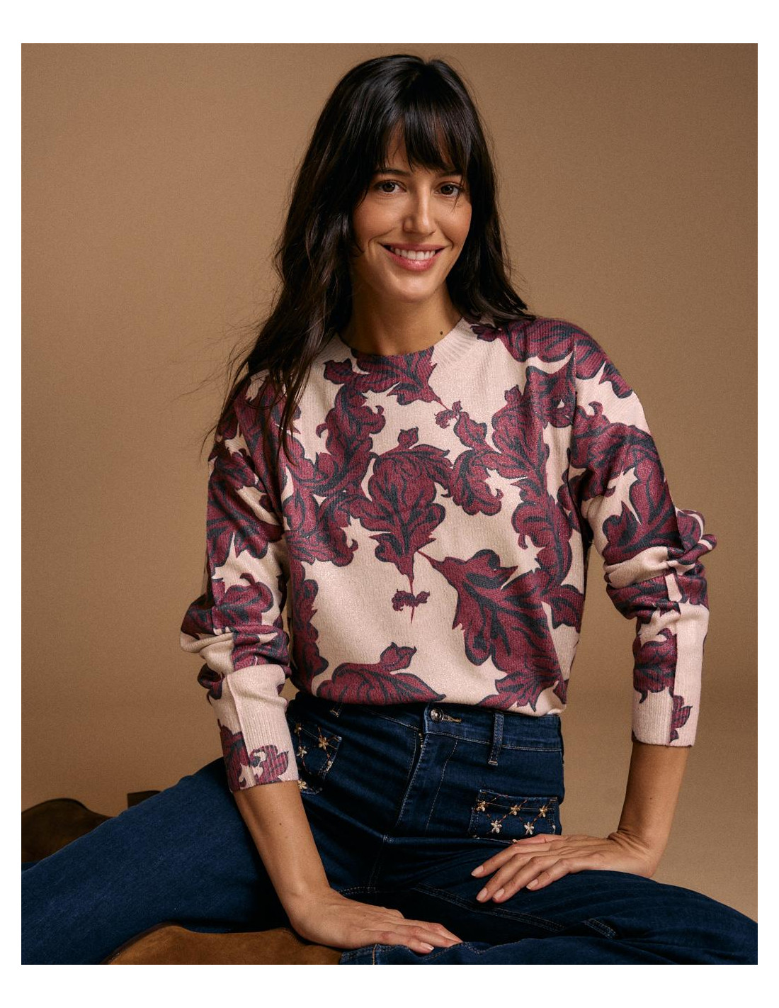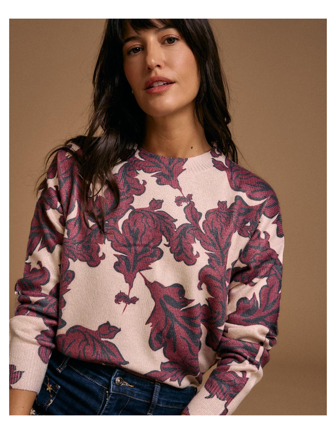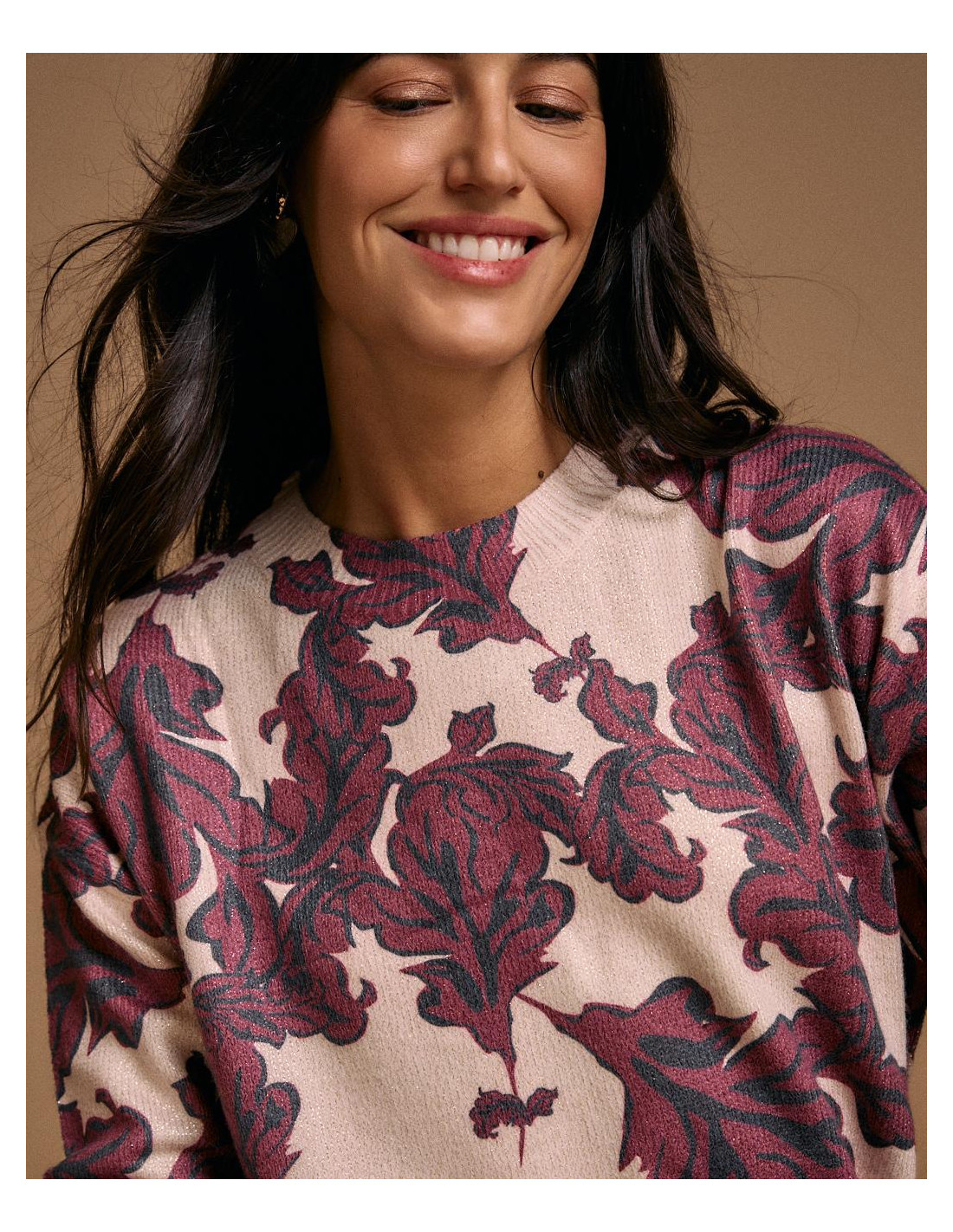 <p><span style="font-size: 10pt; font-family: Arial;">Jersey en color burdeos con estampado de hojas y sutiles hilos de lúrex que aportan un ligero brillo. Presenta cuello redondeado, manga larga y un acabado recto.</span></p> <p><span style="font-size: 10pt; font-family: Arial;">Perfecta para combinar con faldas o pantalones.</span></p>