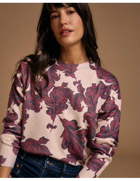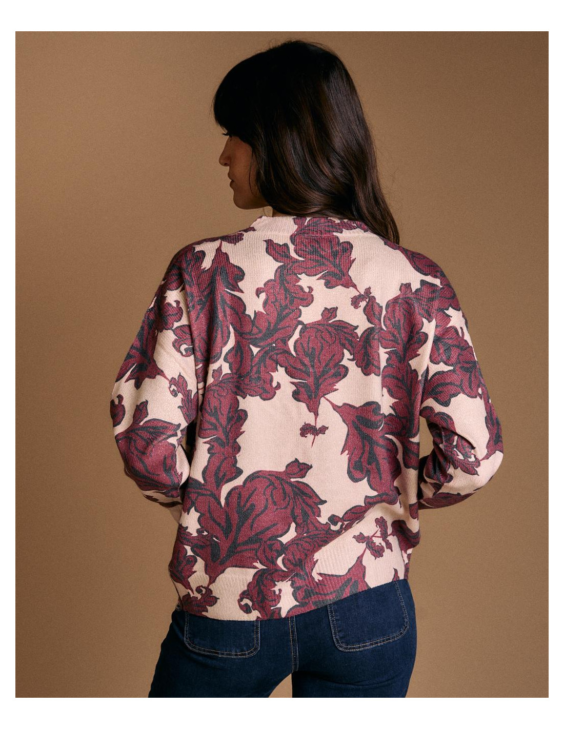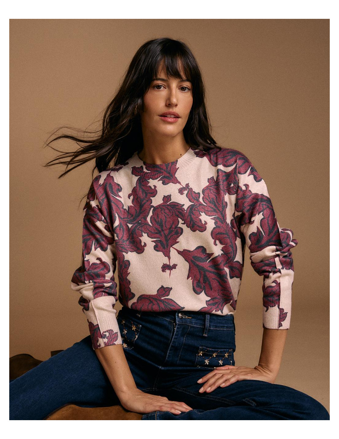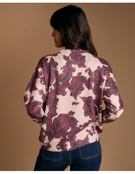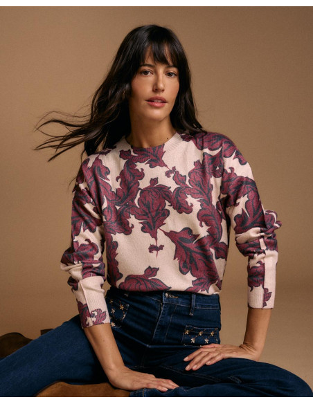 <p><span style="font-size: 10pt; font-family: Arial;">Jersey en color burdeos con estampado de hojas y sutiles hilos de lúrex que aportan un ligero brillo. Presenta cuello redondeado, manga larga y un acabado recto.</span></p> <p><span style="font-size: 10pt; font-family: Arial;">Perfecta para combinar con faldas o pantalones.</span></p>