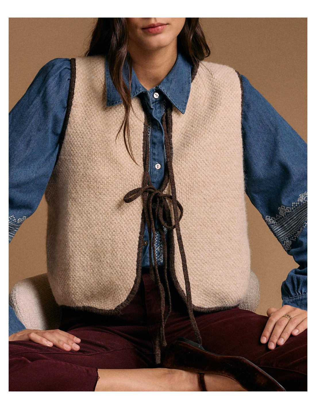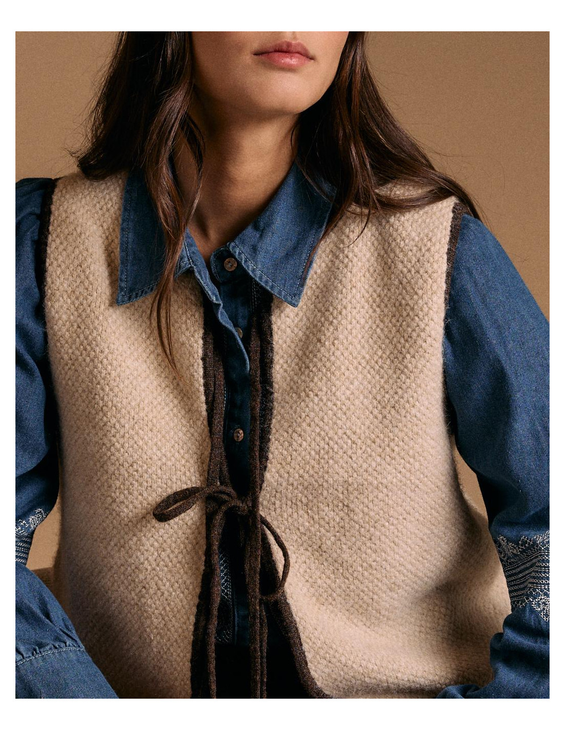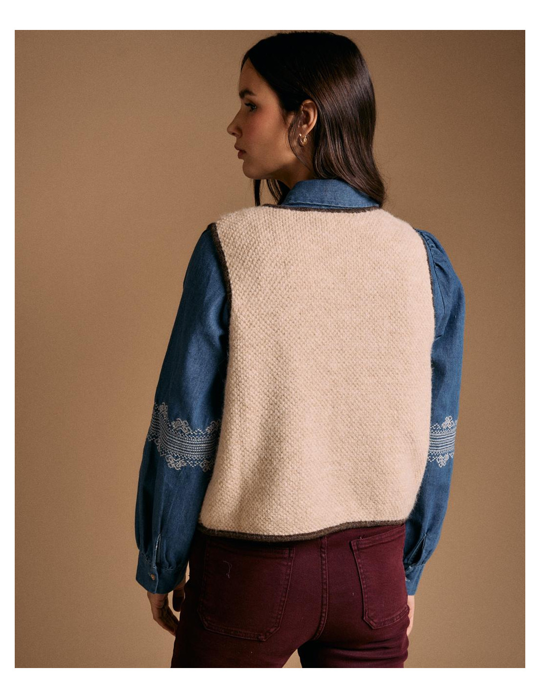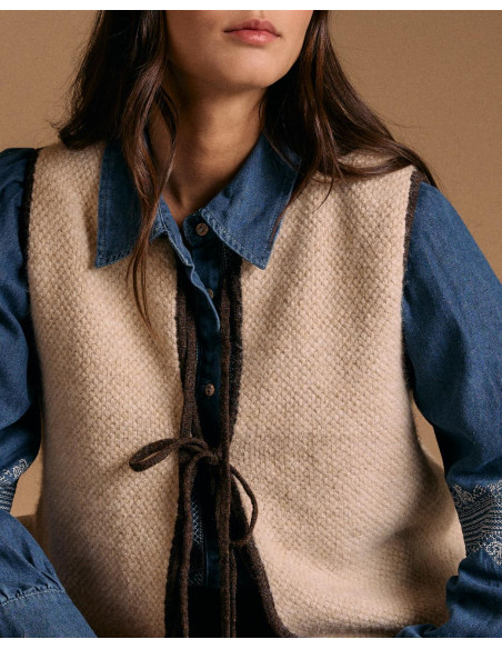 <p><span style="font-size: 10pt; font-family: Arial;">Chaleco en color crudo confeccionado en tejido de punto grueso, con ribetes a contraste en color negro y lazada de cierre en la parte delantera.</span></p>