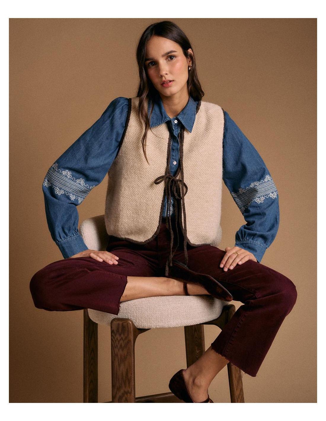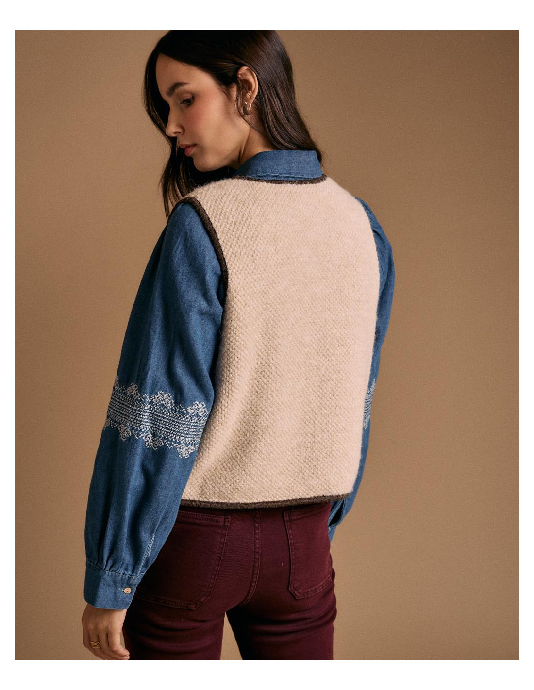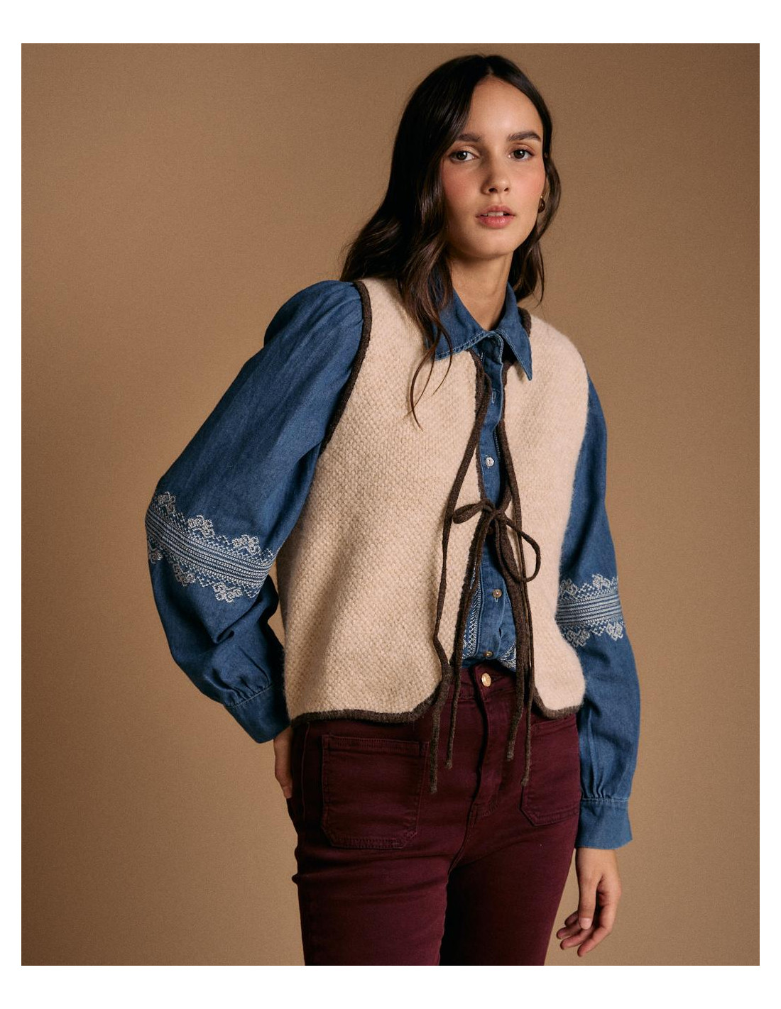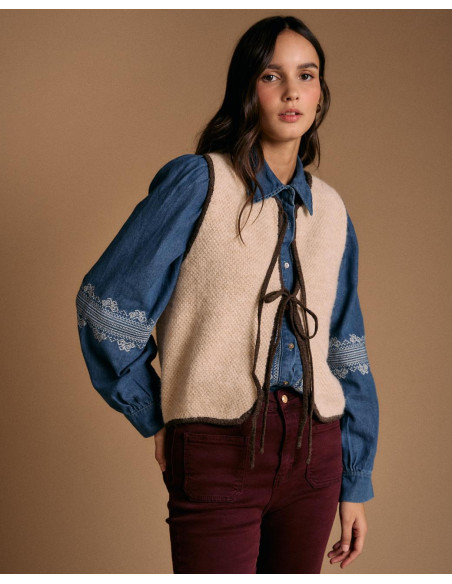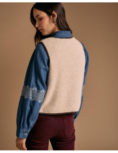 <p><span style="font-size: 10pt; font-family: Arial;">Chaleco en color crudo confeccionado en tejido de punto grueso, con ribetes a contraste en color negro y lazada de cierre en la parte delantera.</span></p>