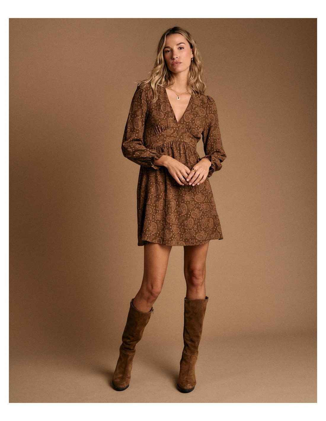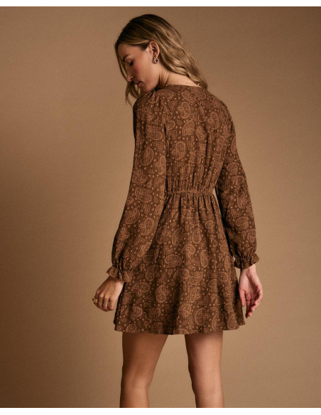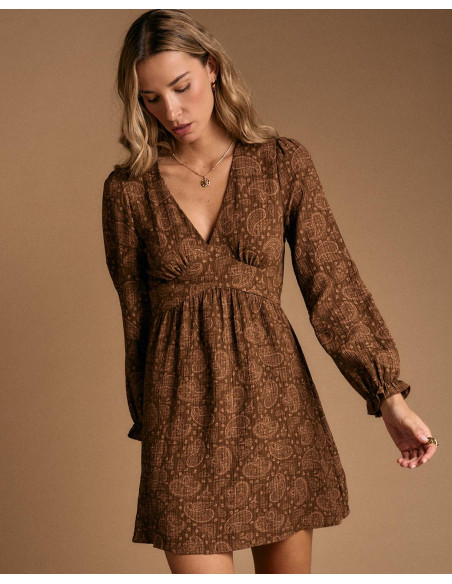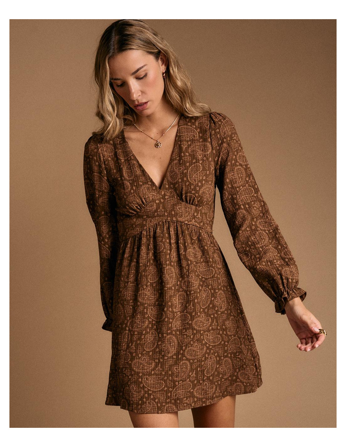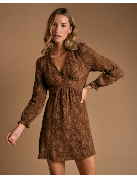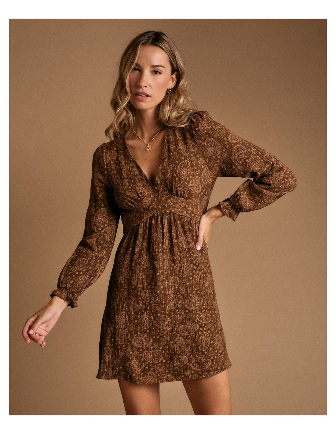 <p><span style="font-size: 10pt; font-family: Arial;">Vestido corto en color ocre con estampado floral. Diseño con escote en pico, goma elástica bajo el pecho que realza la figura y manga larga acabada en puño fruncido.</span></p>