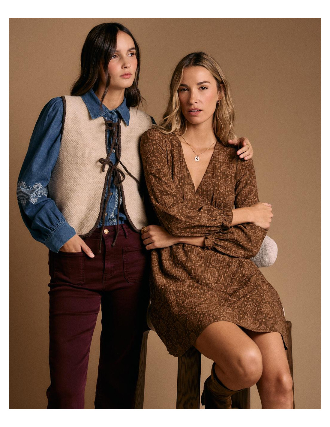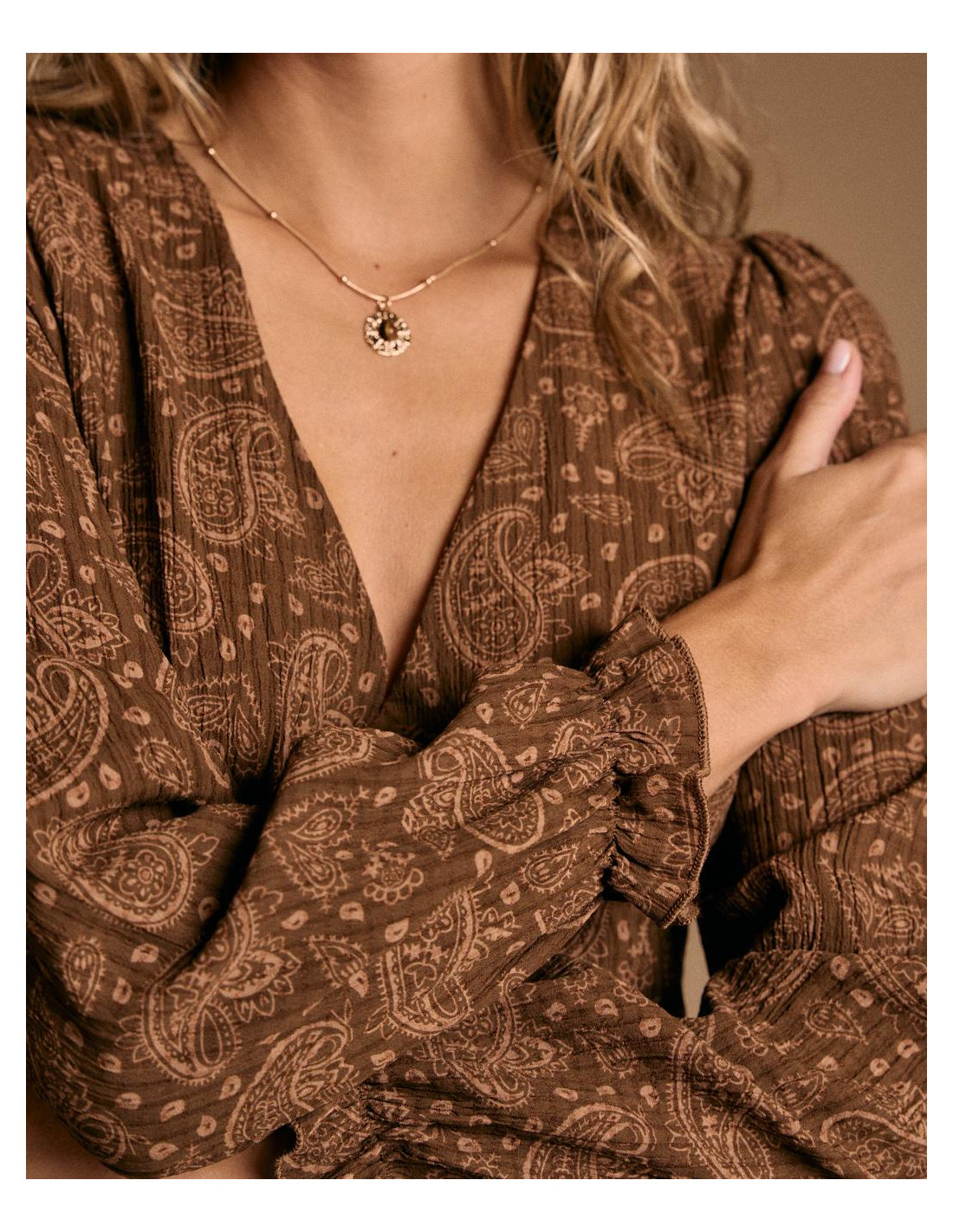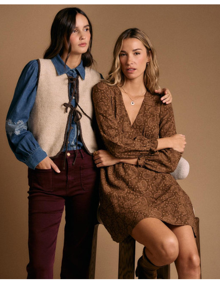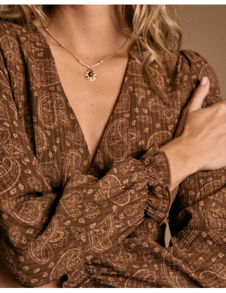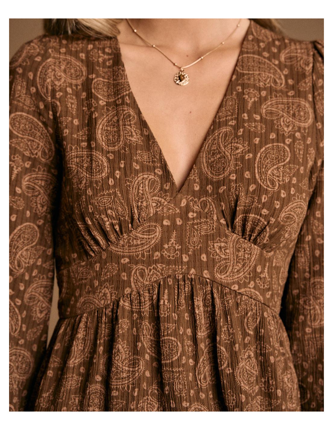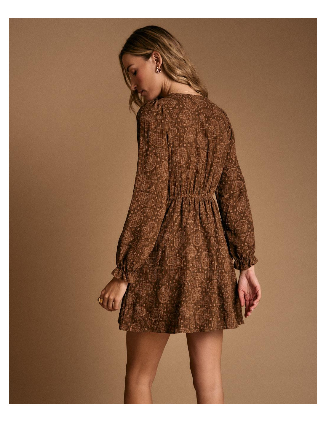 <p><span style="font-size: 10pt; font-family: Arial;">Vestido corto en color ocre con estampado floral. Diseño con escote en pico, goma elástica bajo el pecho que realza la figura y manga larga acabada en puño fruncido.</span></p>