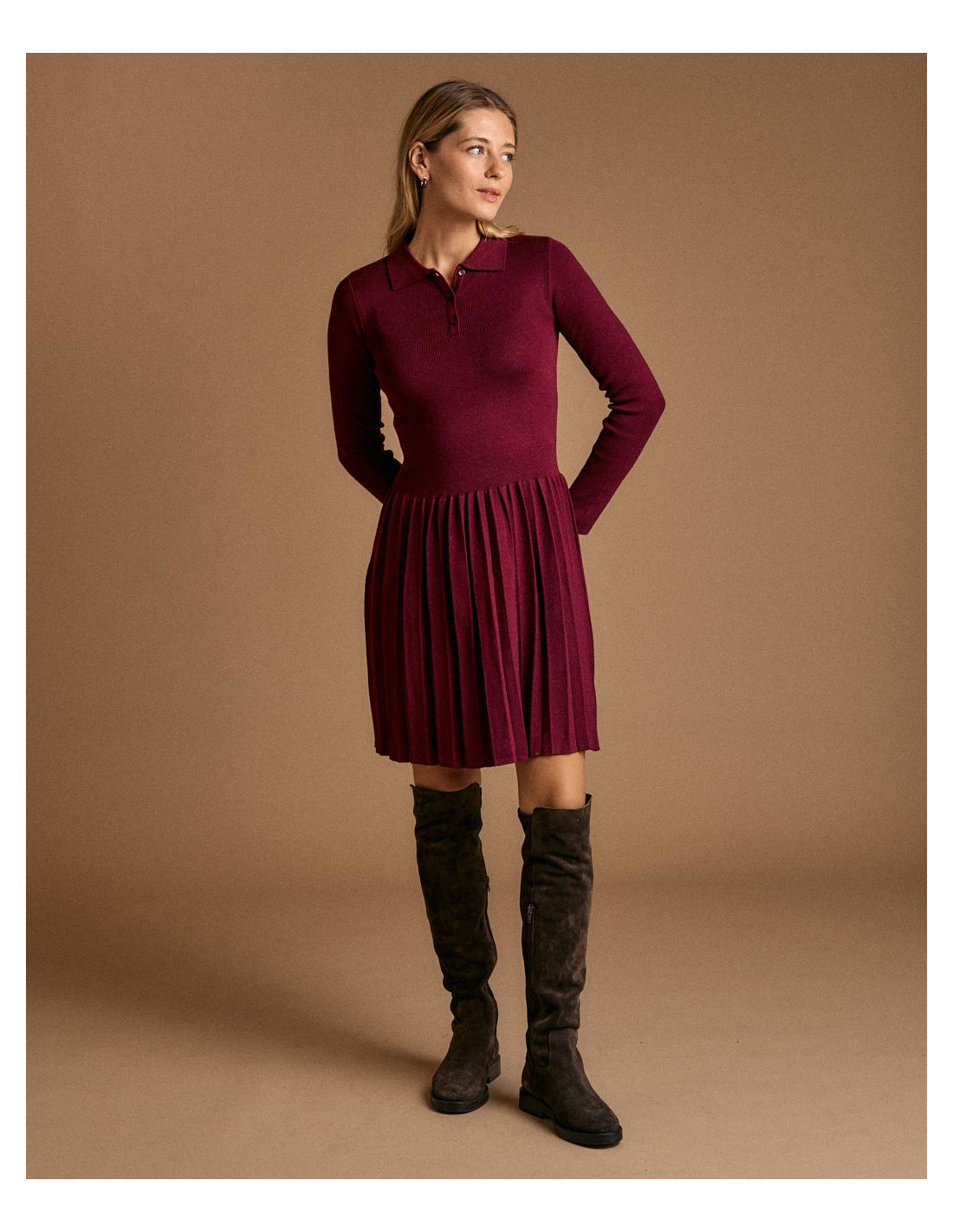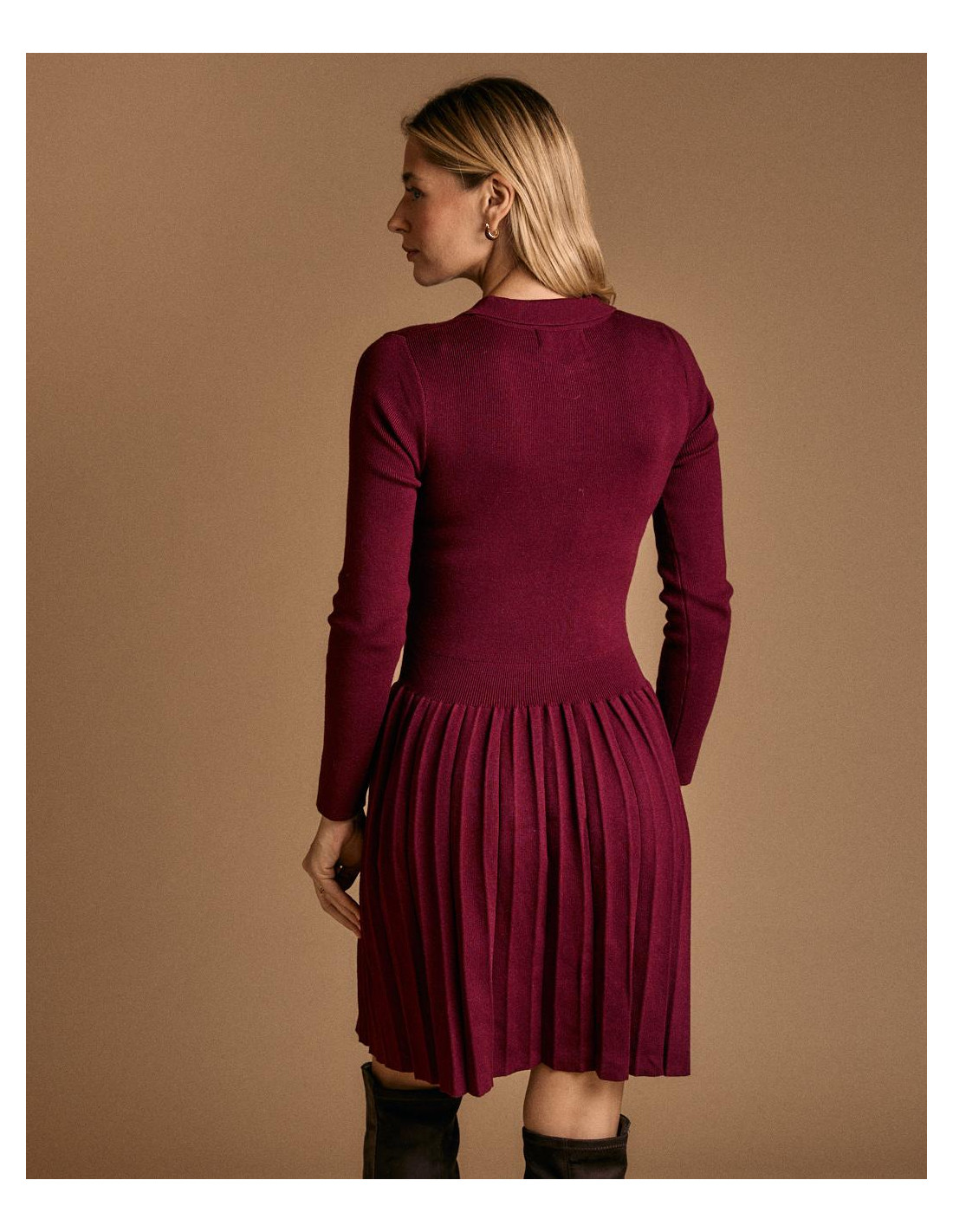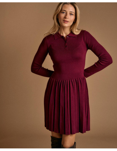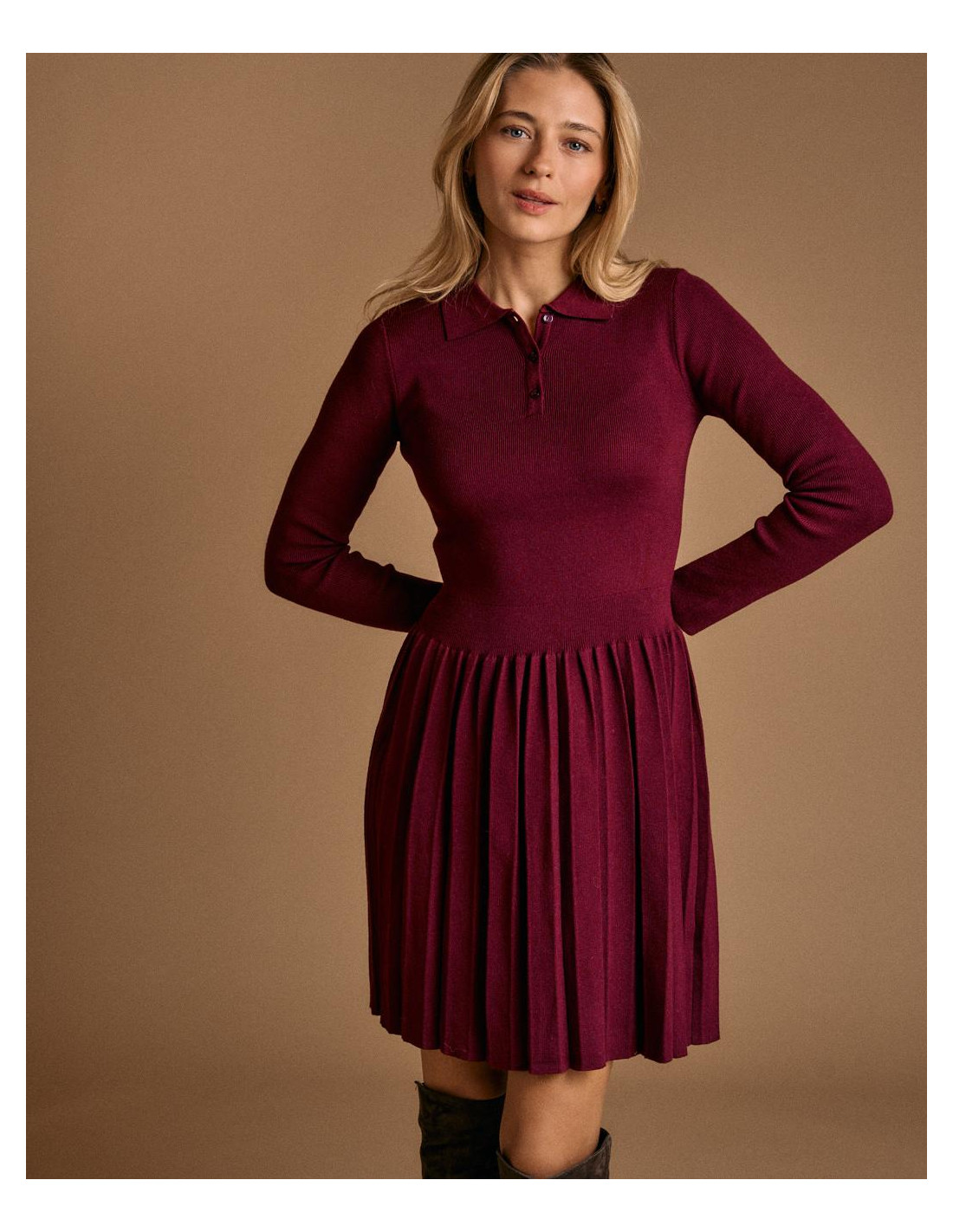<p><span style="font-size: 10pt; font-family: Arial;">Vestido corto de punto en color burdeos. Diseño de manga larga y cuello tipo polo, con falda plisada que aporta un movimiento delicado y femenino.</span></p>