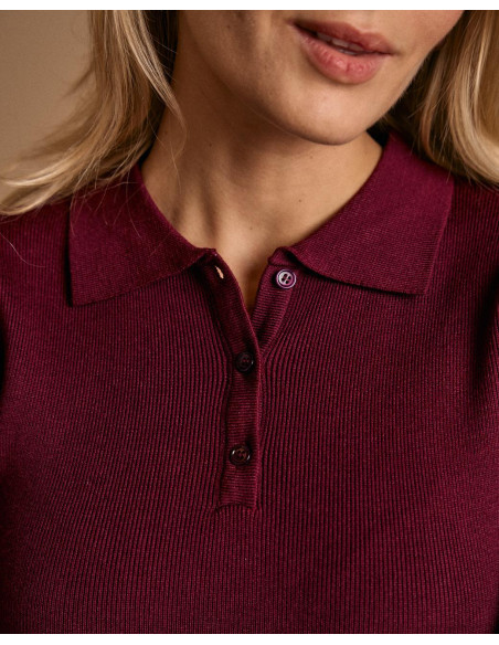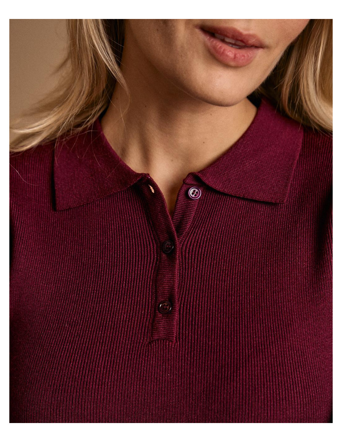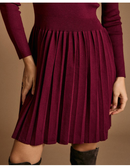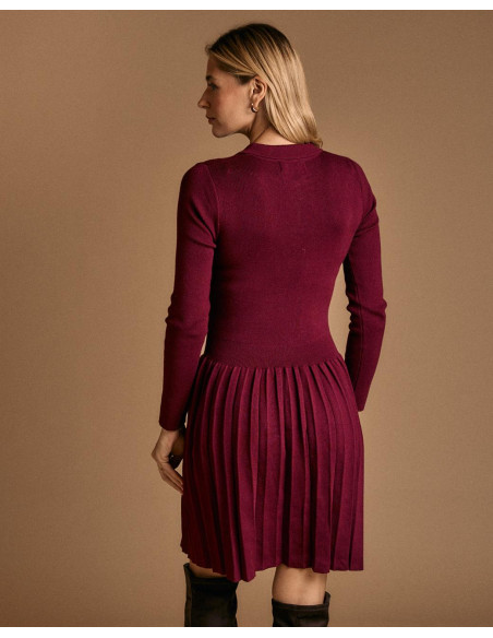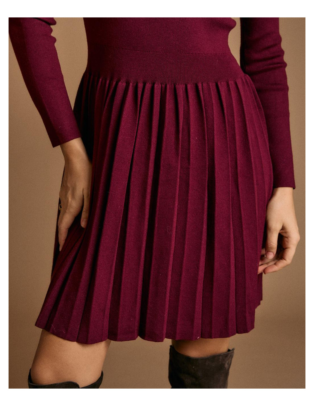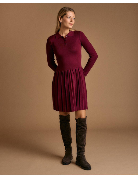 <p><span style="font-size: 10pt; font-family: Arial;">Vestido corto de punto en color burdeos. Diseño de manga larga y cuello tipo polo, con falda plisada que aporta un movimiento delicado y femenino.</span></p>