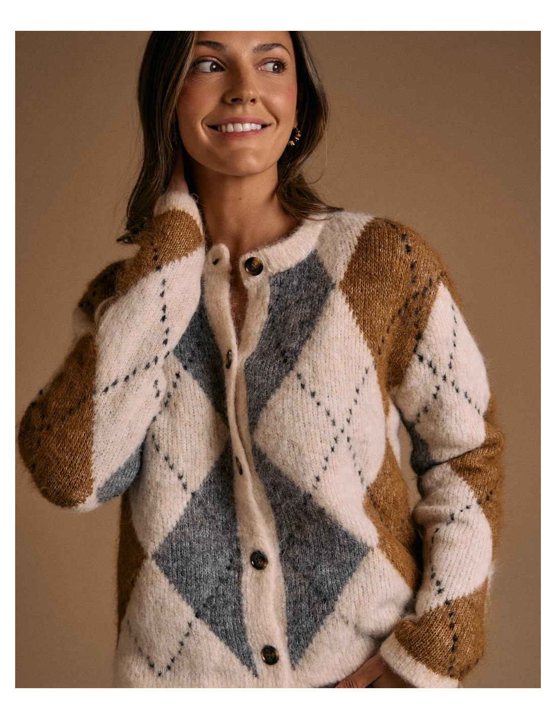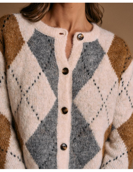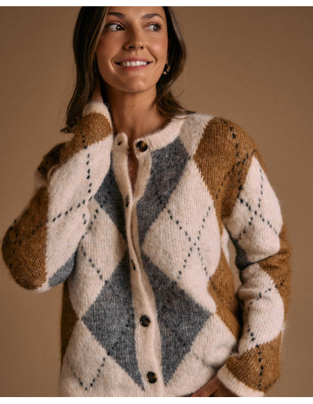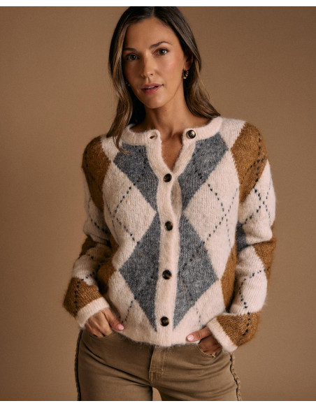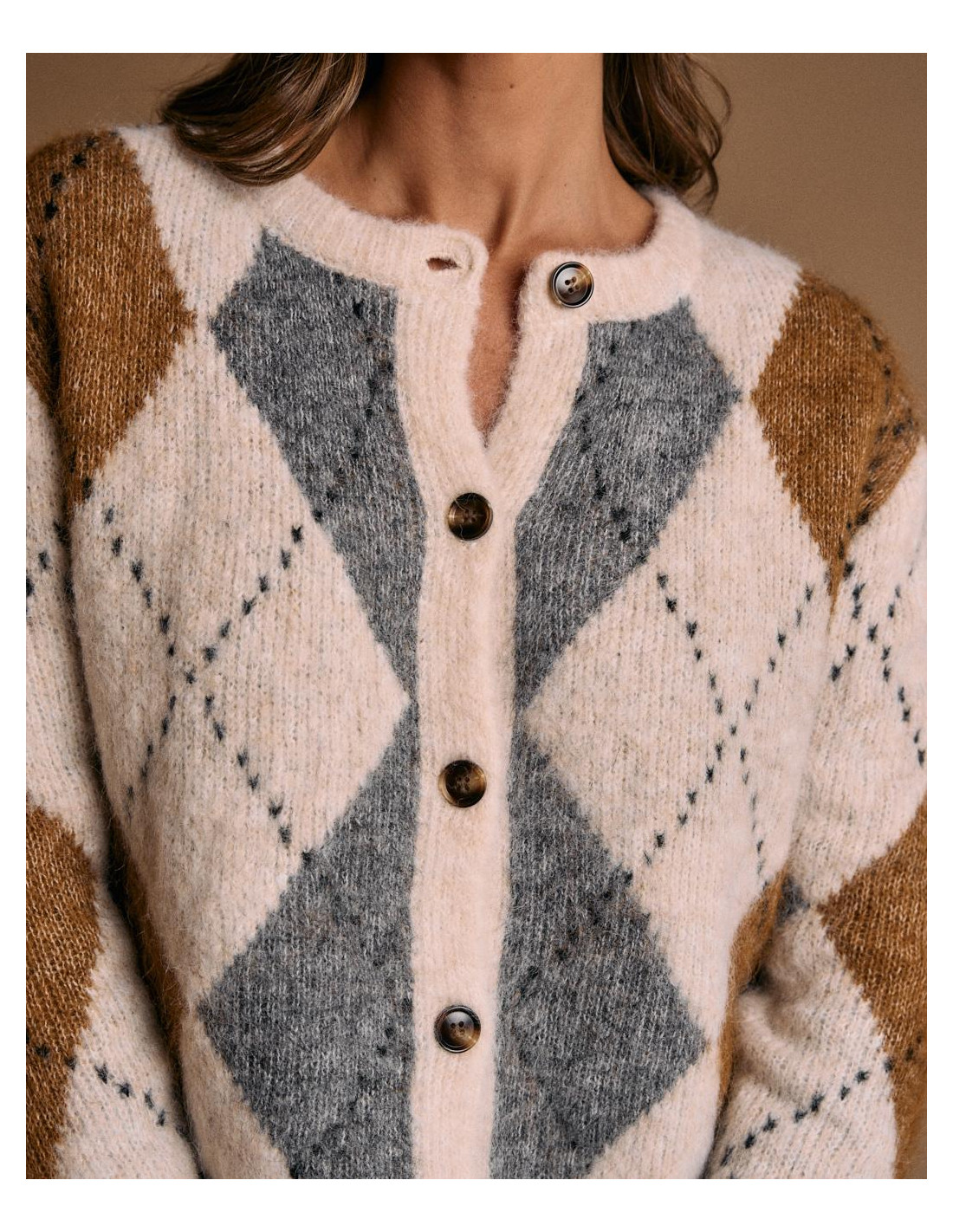 <p><span style="font-size: 10pt; font-family: Arial;">Cárdigan en color crudo con diseño de rombos en tonos gris y mostaza, escote redondeado, cierre de botones en la parte delantera y manga larga.</span></p>