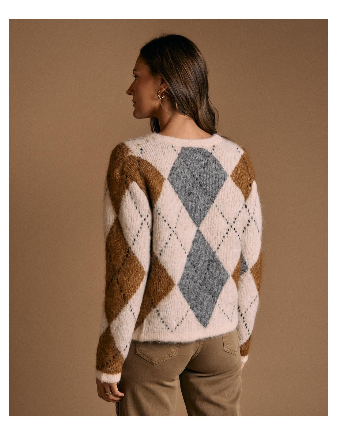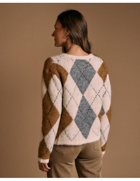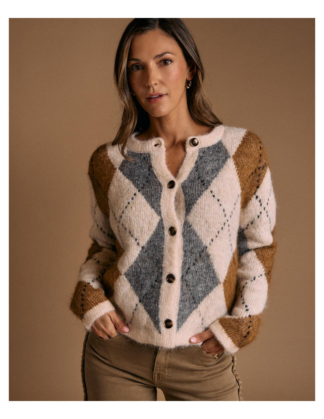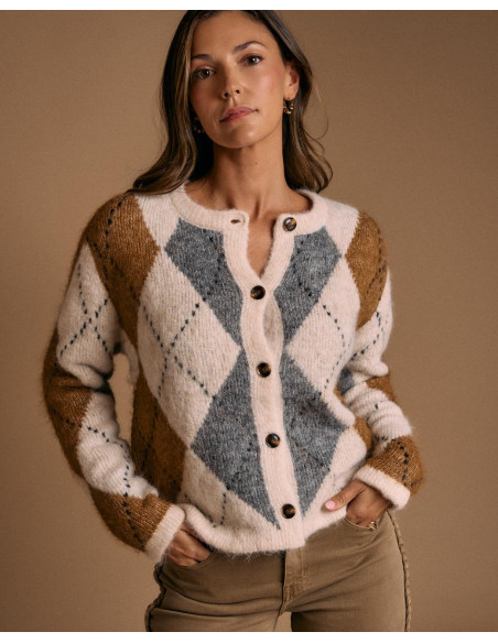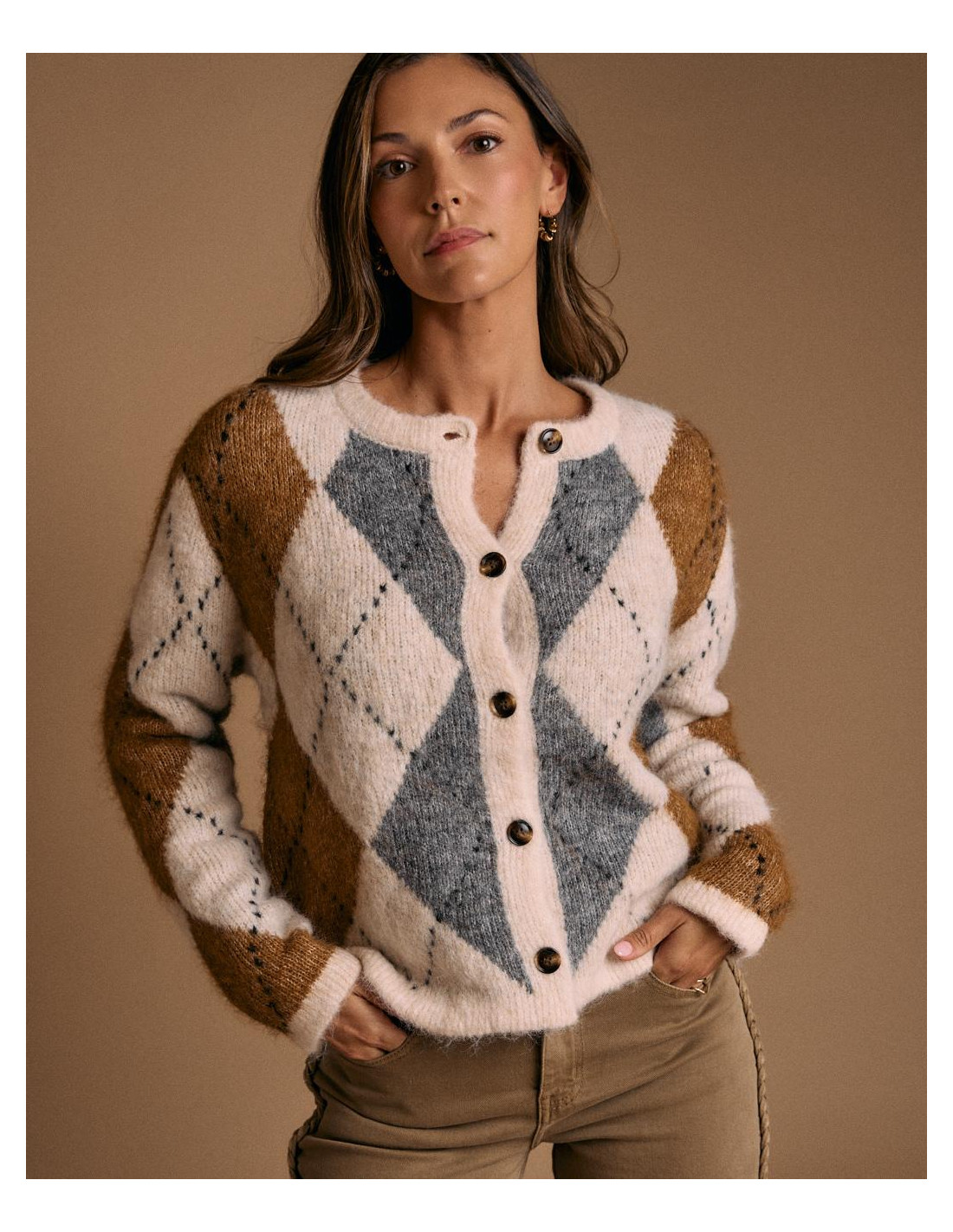 <p><span style="font-size: 10pt; font-family: Arial;">Cárdigan en color crudo con diseño de rombos en tonos gris y mostaza, escote redondeado, cierre de botones en la parte delantera y manga larga.</span></p>