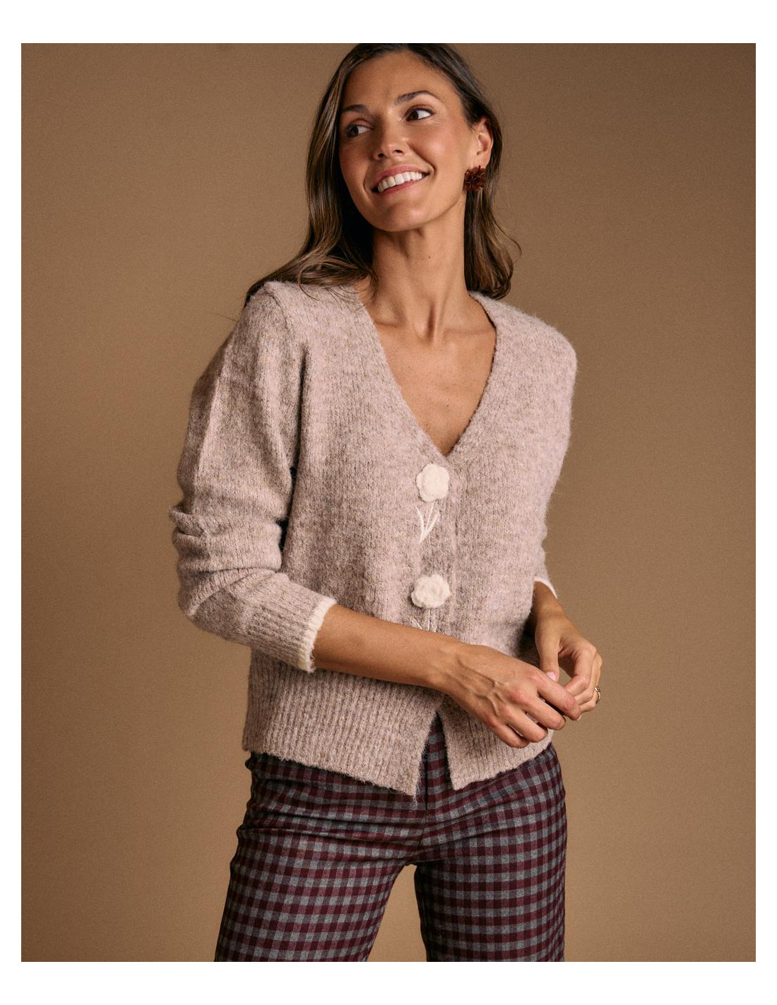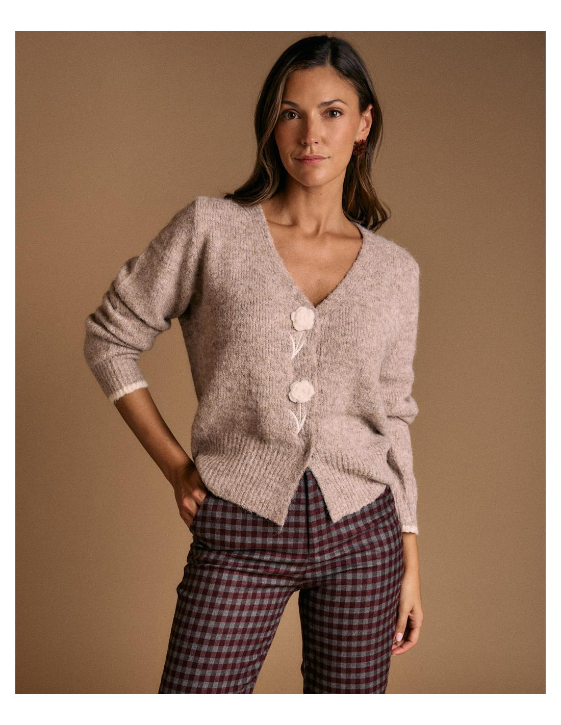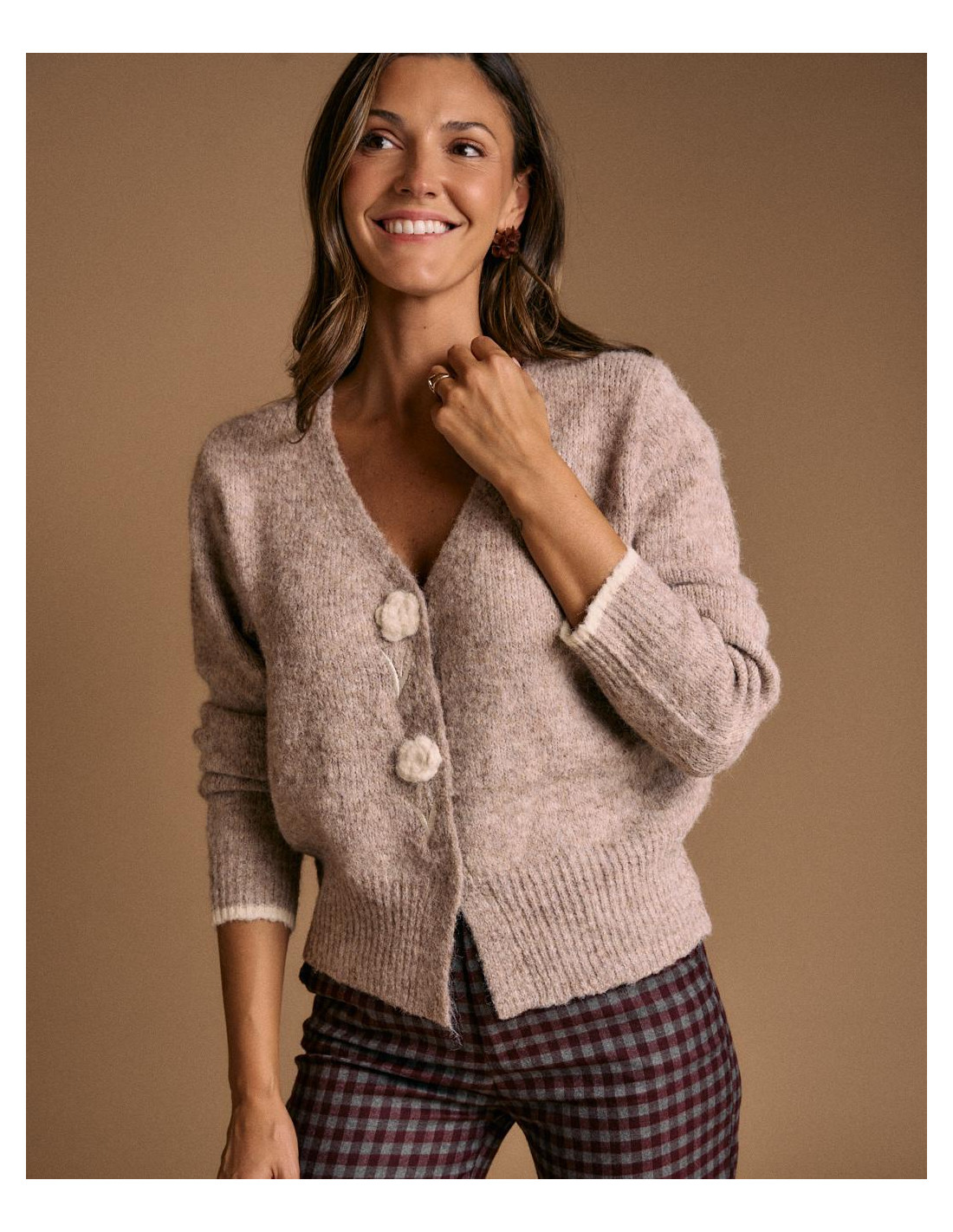 <p><span style="font-size: 10pt; font-family: Arial;">Rebeca de punto grueso en color taupe, de manga larga y escote pico. Presenta un delicado borde en contraste en los puños y el especial detalle de flores como botones.</span></p> <p><span style="font-size: 10pt; font-family: Arial;">Ideal para un look cálido y femenino, perfecto para combinar con pantalones o faldas de tiro alto.</span></p>