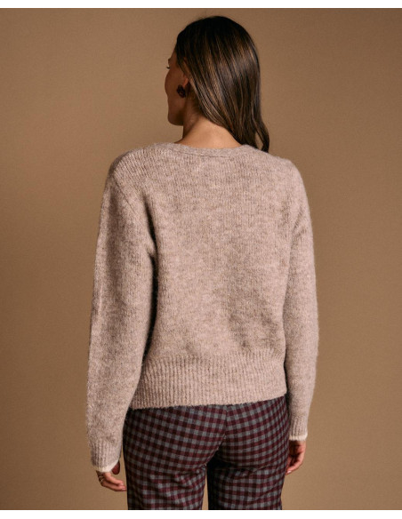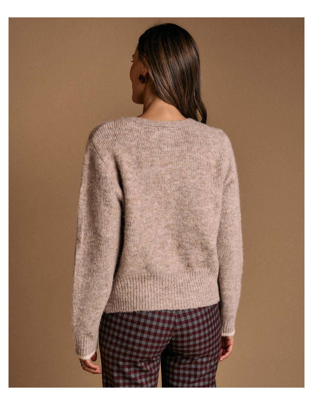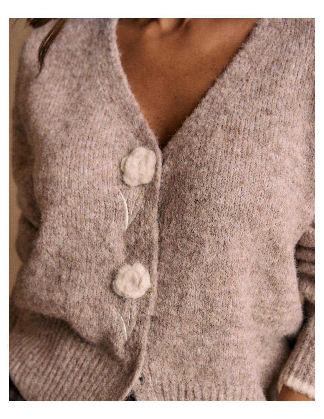 <p><span style="font-size: 10pt; font-family: Arial;">Rebeca de punto grueso en color taupe, de manga larga y escote pico. Presenta un delicado borde en contraste en los puños y el especial detalle de flores como botones.</span></p> <p><span style="font-size: 10pt; font-family: Arial;">Ideal para un look cálido y femenino, perfecto para combinar con pantalones o faldas de tiro alto.</span></p>