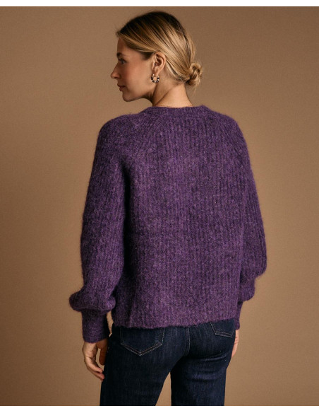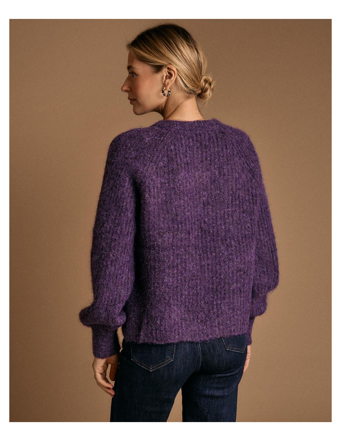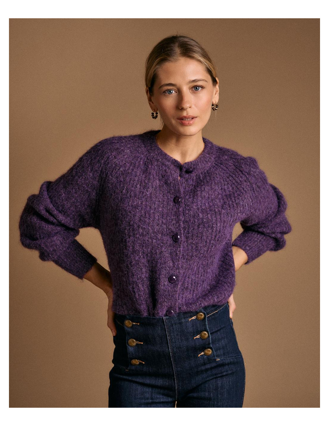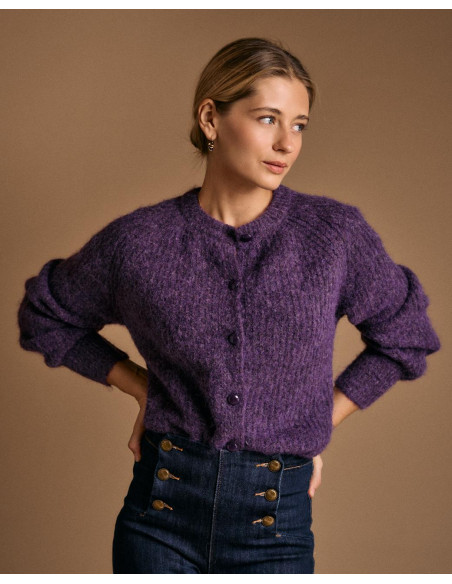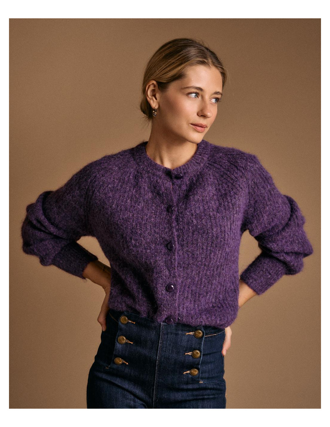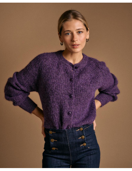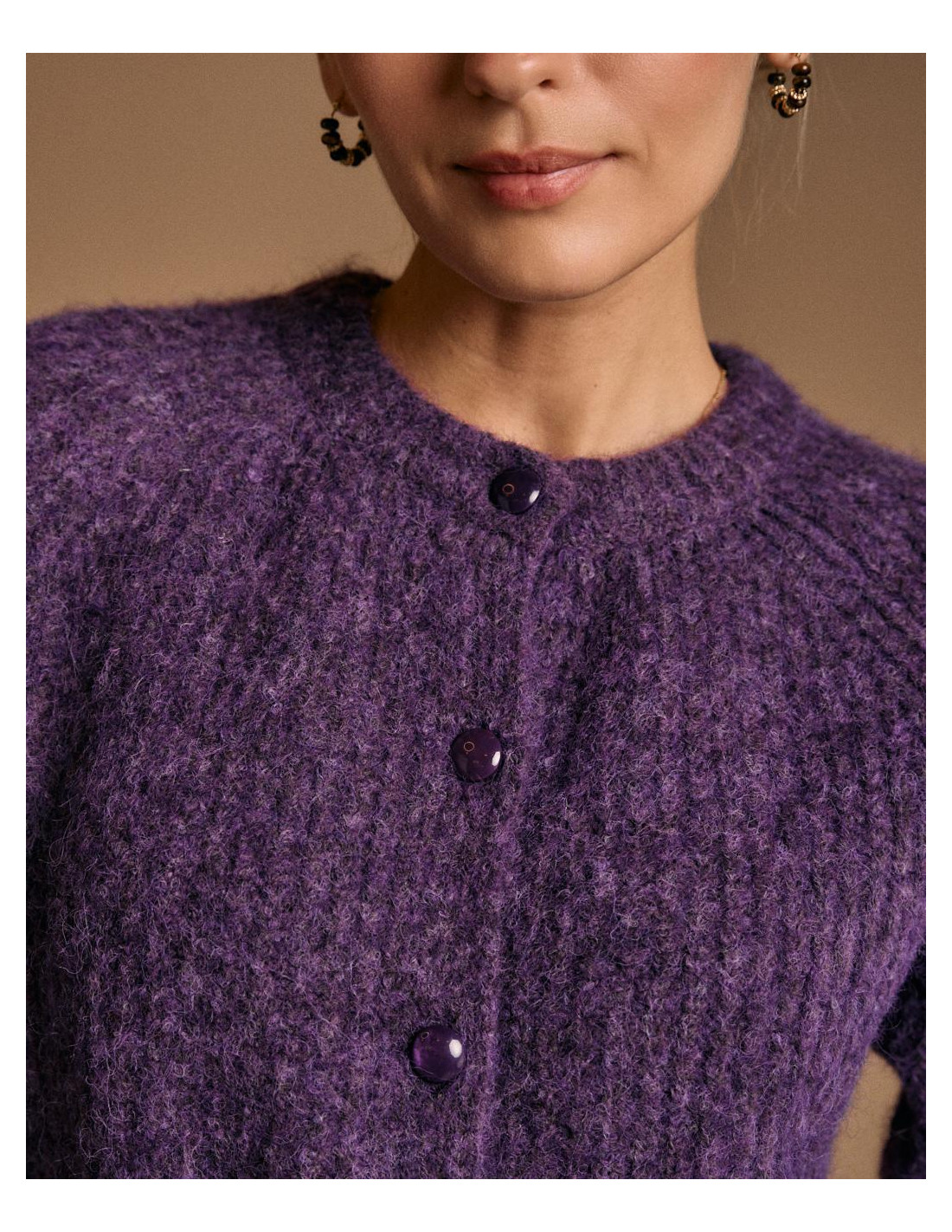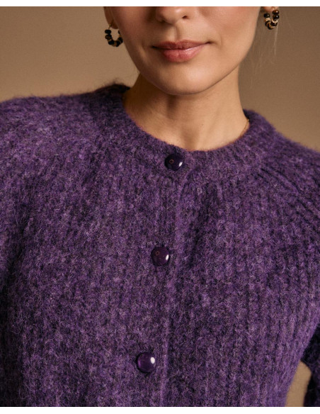 <p><span style="font-size: 10pt; font-family: Arial;">Cárdigan de manga larga, de punto grueso en color berenjena, con cierre de botones a tono.</span></p>