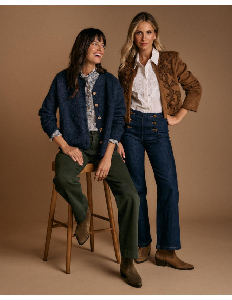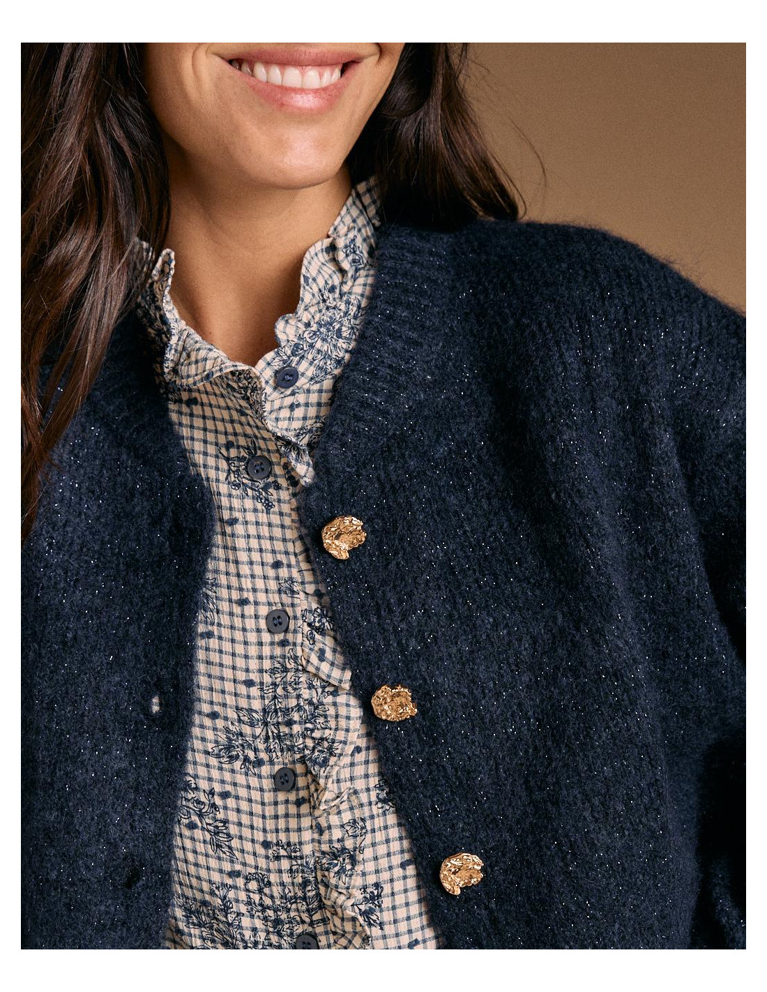 <p><span style="font-size: 10pt; font-family: Arial;">Cárdigan de punto con acabado de lúrex en el tejido, en color azul, y cierre con botones joya dorados en forma de flor.</span></p> <p><span style="font-size: 10pt; font-family: Arial;">Ideal para dar un toque especial a tu look.</span></p>