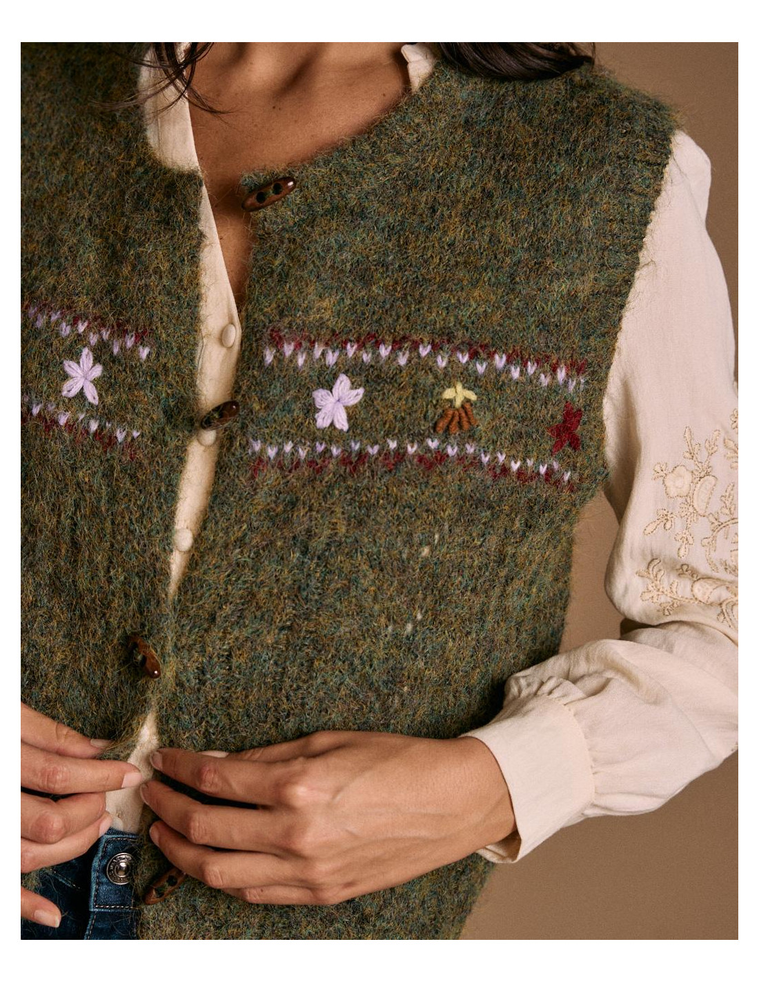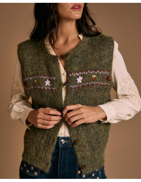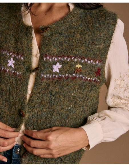 <p><span style="font-size: 10pt; font-family: Arial;">Chaleco en color verde bosque con detalle de bordados multicolor de flores en la parte frontal. Presenta escote redondeado, cierre de botones y acabado sin mangas.</span></p> <p><span style="font-size: 10pt; font-family: Arial;">Una prenda original y cálida, ideal para superponer sobre camisas o blusas.</span></p>