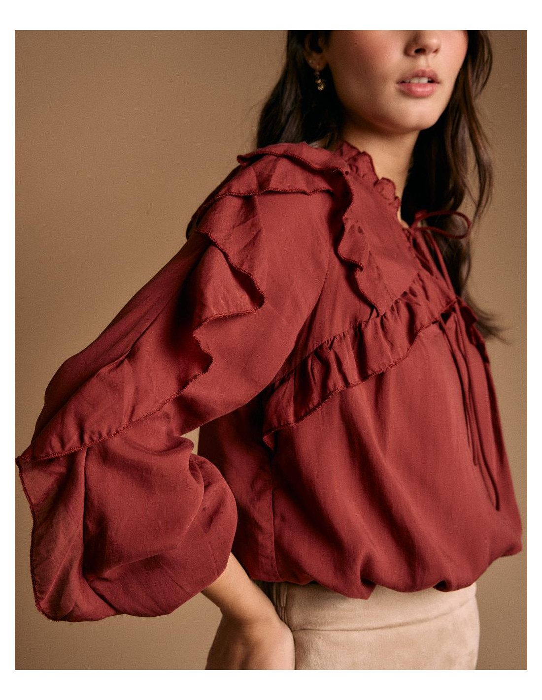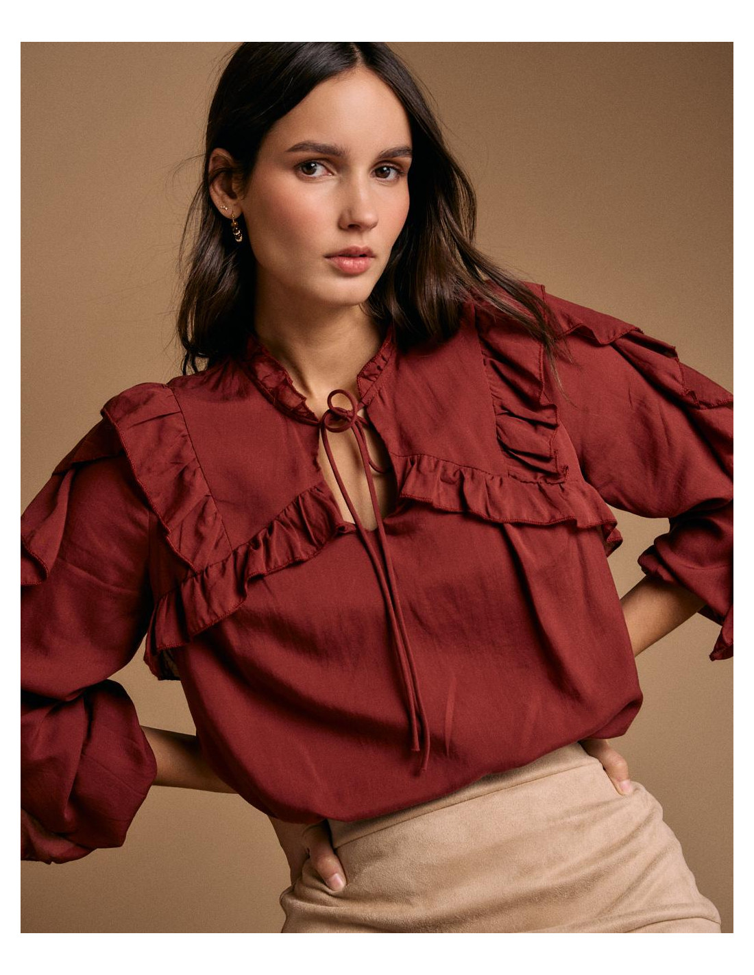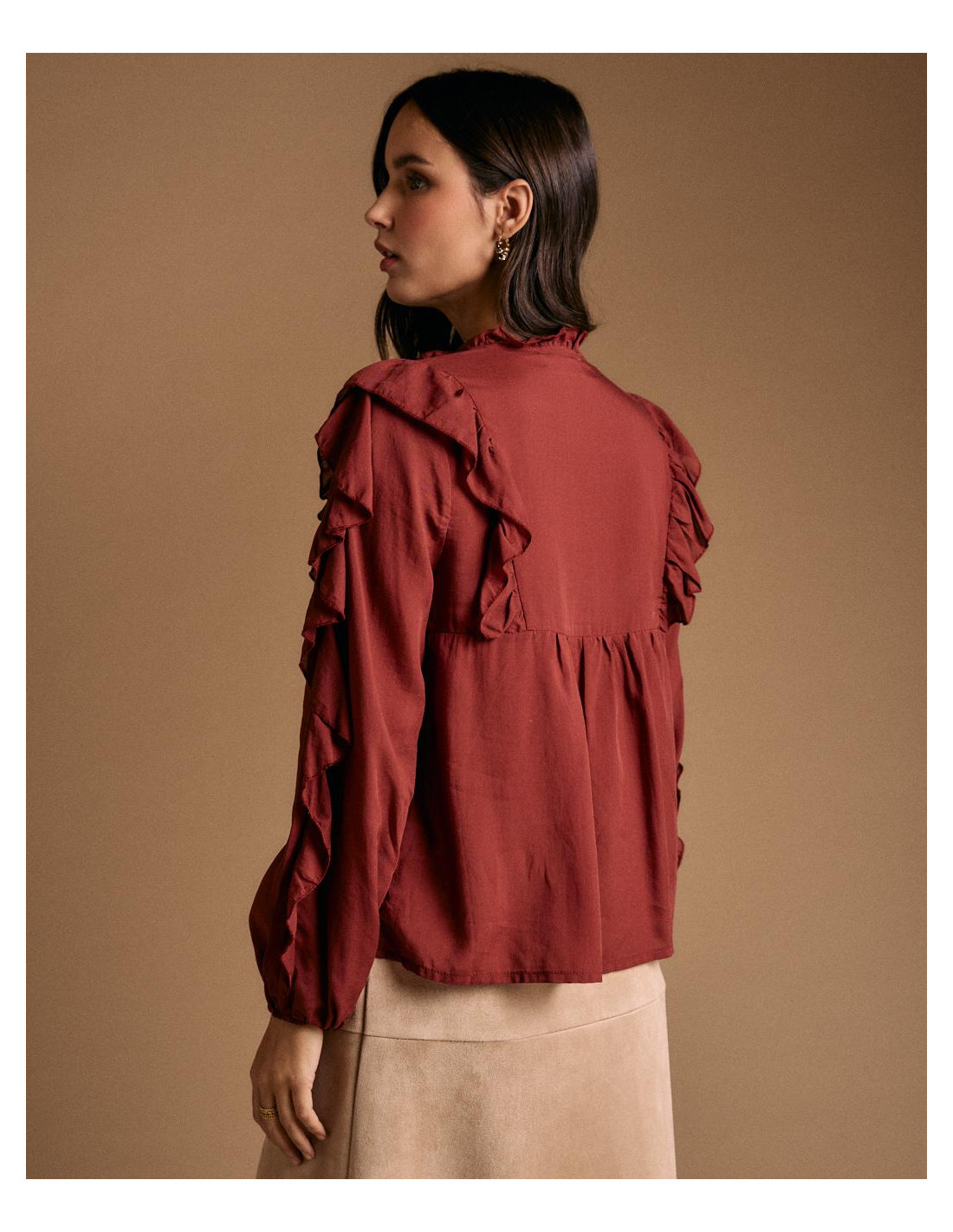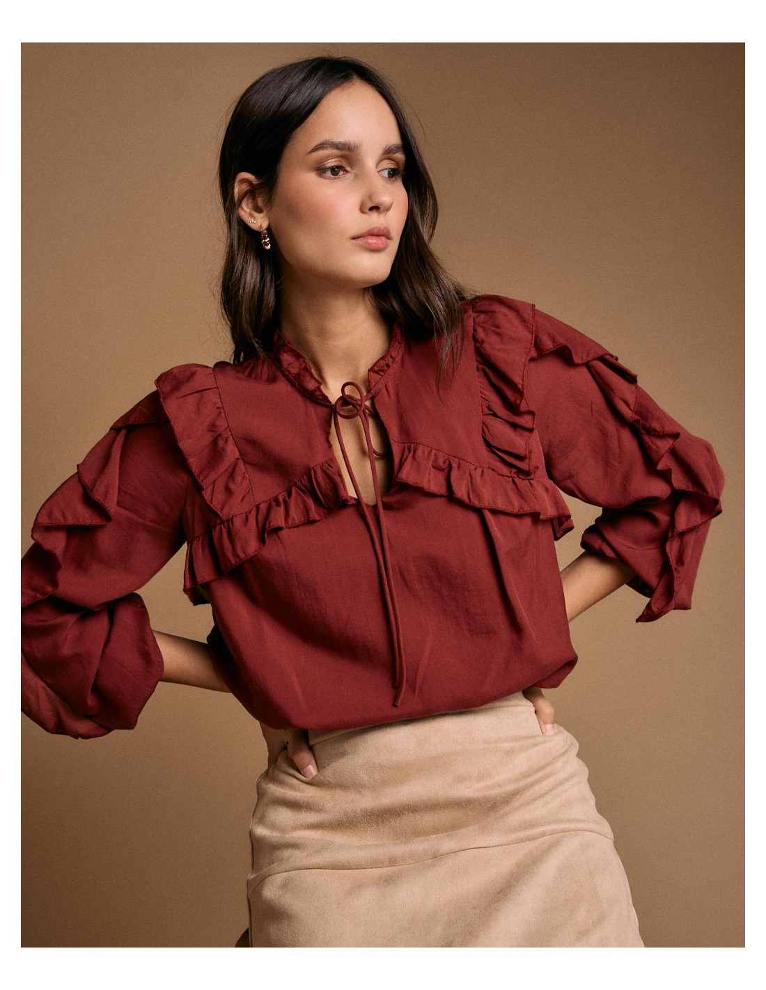 <p><span style="font-size: 10pt; font-family: Arial;">Blusa en color caldera confeccionada en tejido fluido. Diseño con volantes en la parte delantera y hombros, escote redondo con abertura y lazada, y mangas largas con puño fruncido.</span></p>