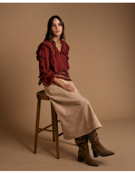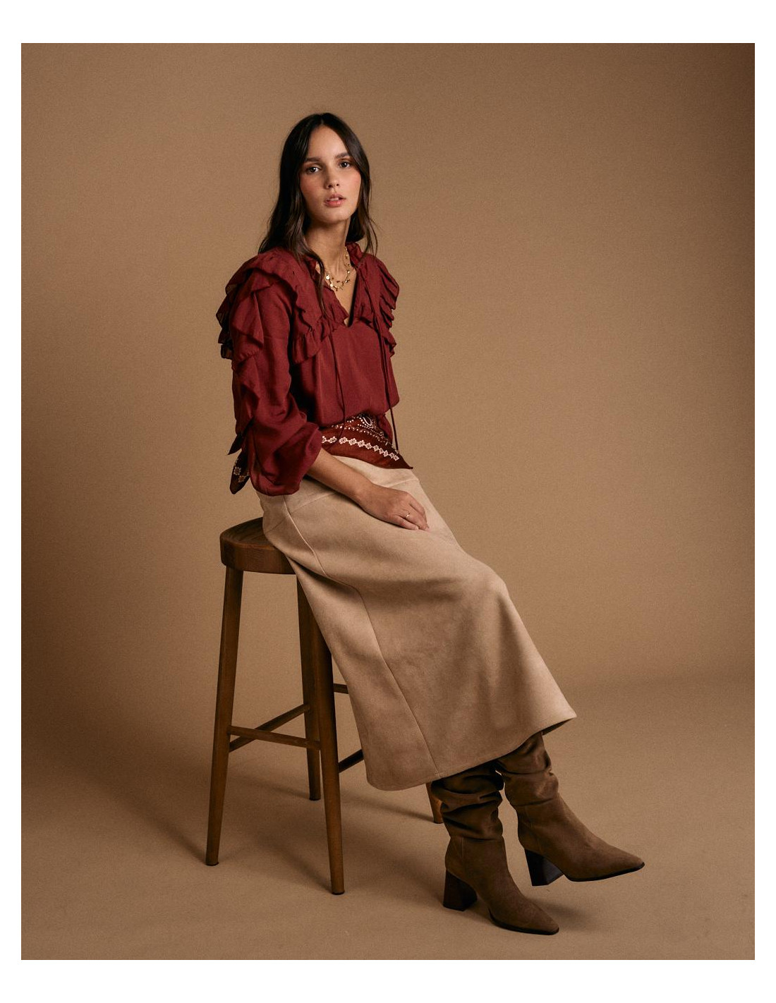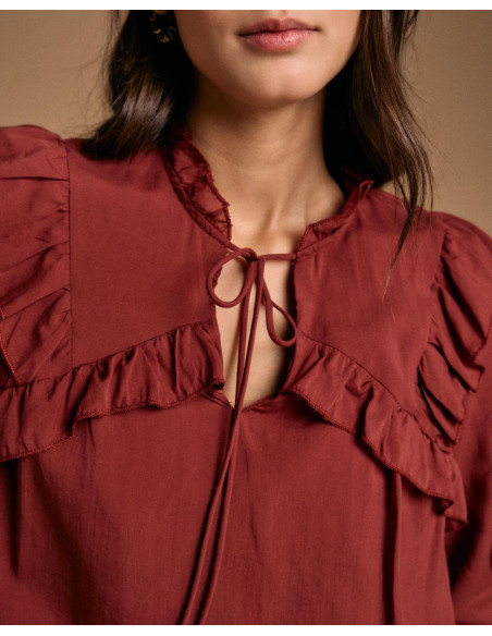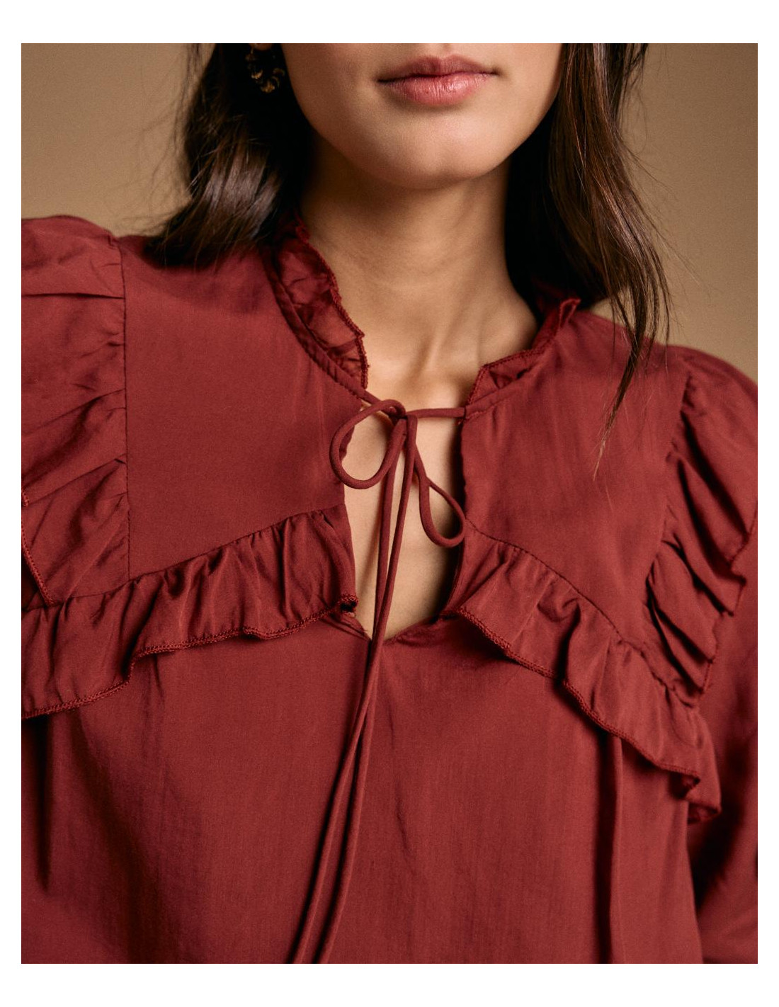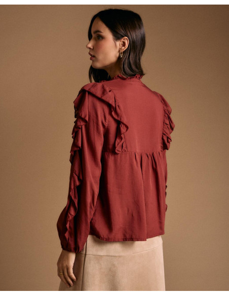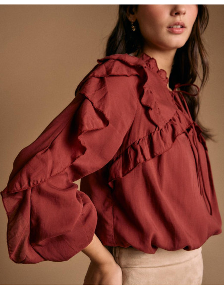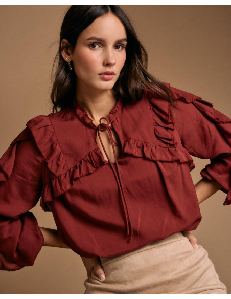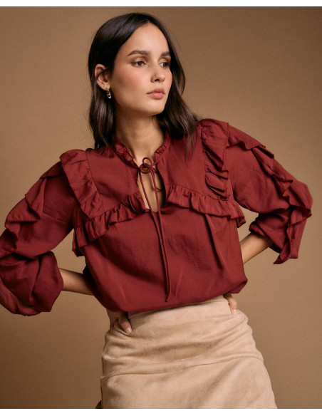 <p><span style="font-size: 10pt; font-family: Arial;">Blusa en color caldera confeccionada en tejido fluido. Diseño con volantes en la parte delantera y hombros, escote redondo con abertura y lazada, y mangas largas con puño fruncido.</span></p>