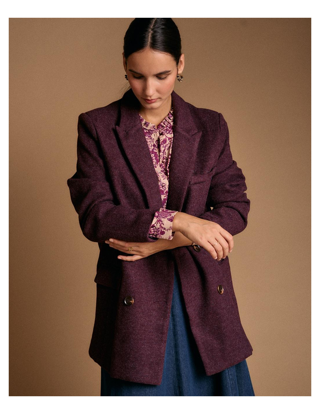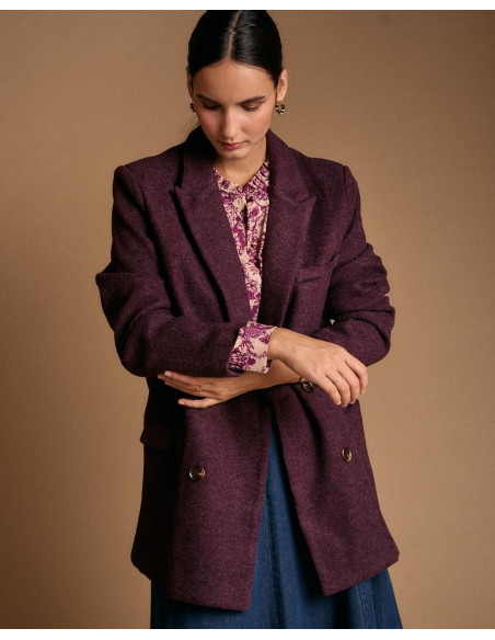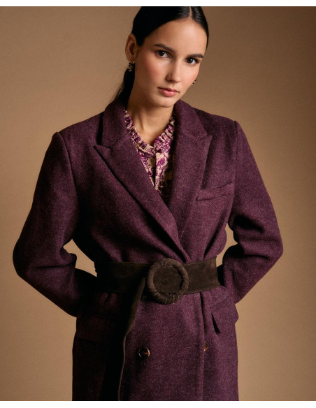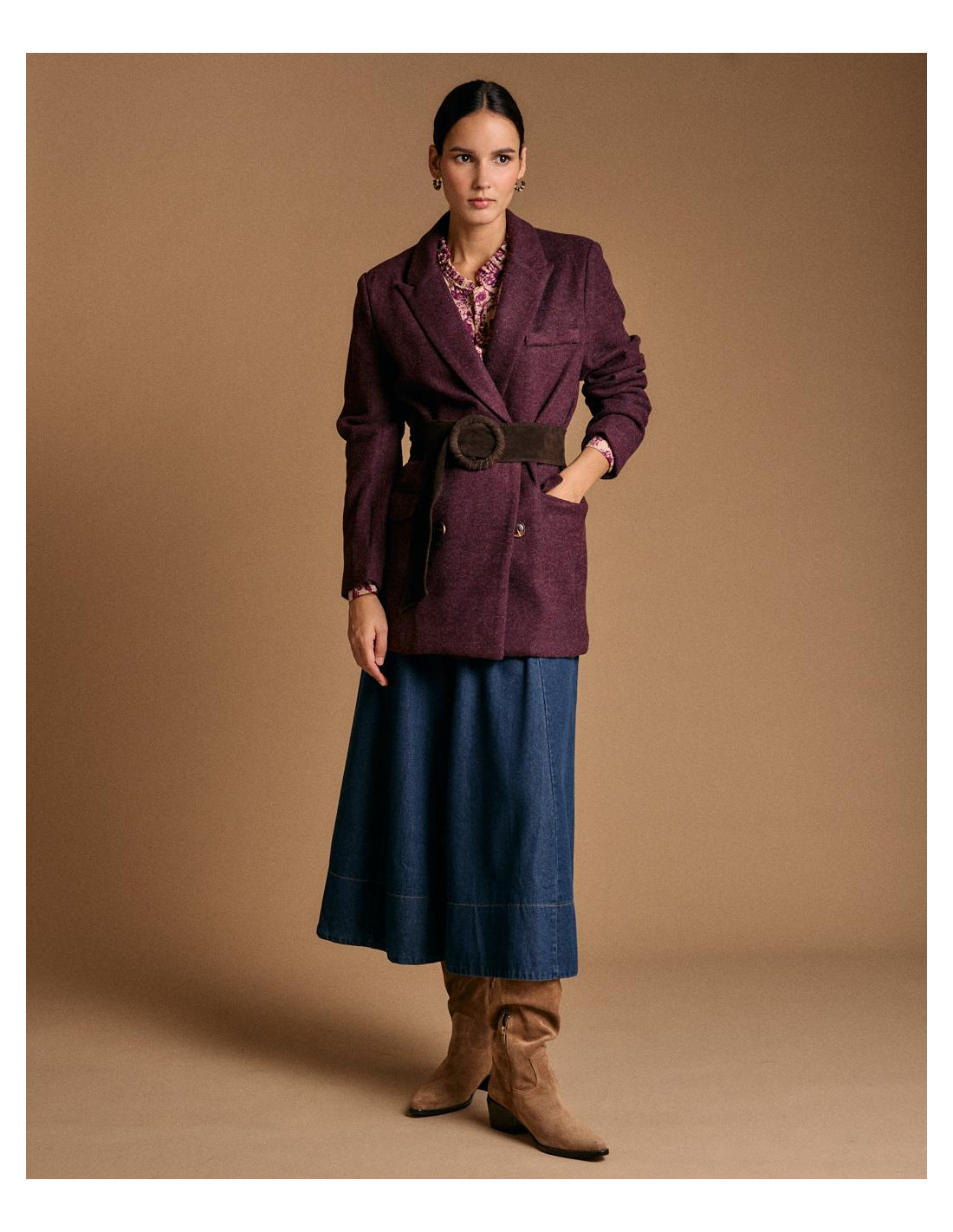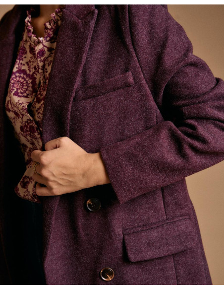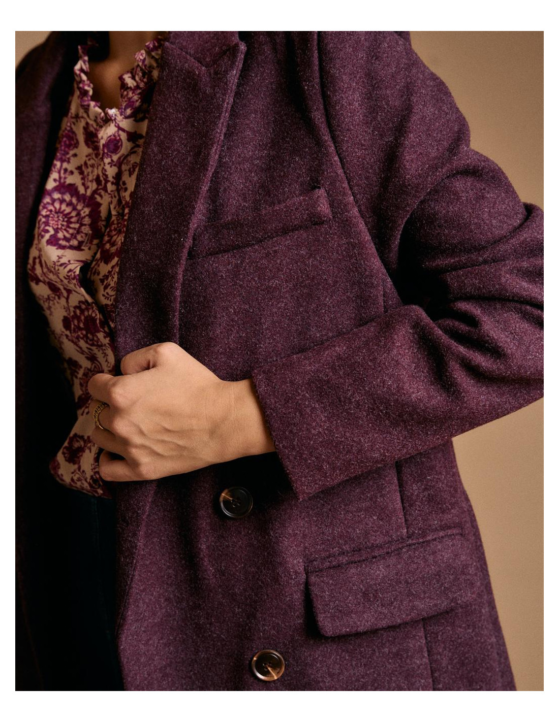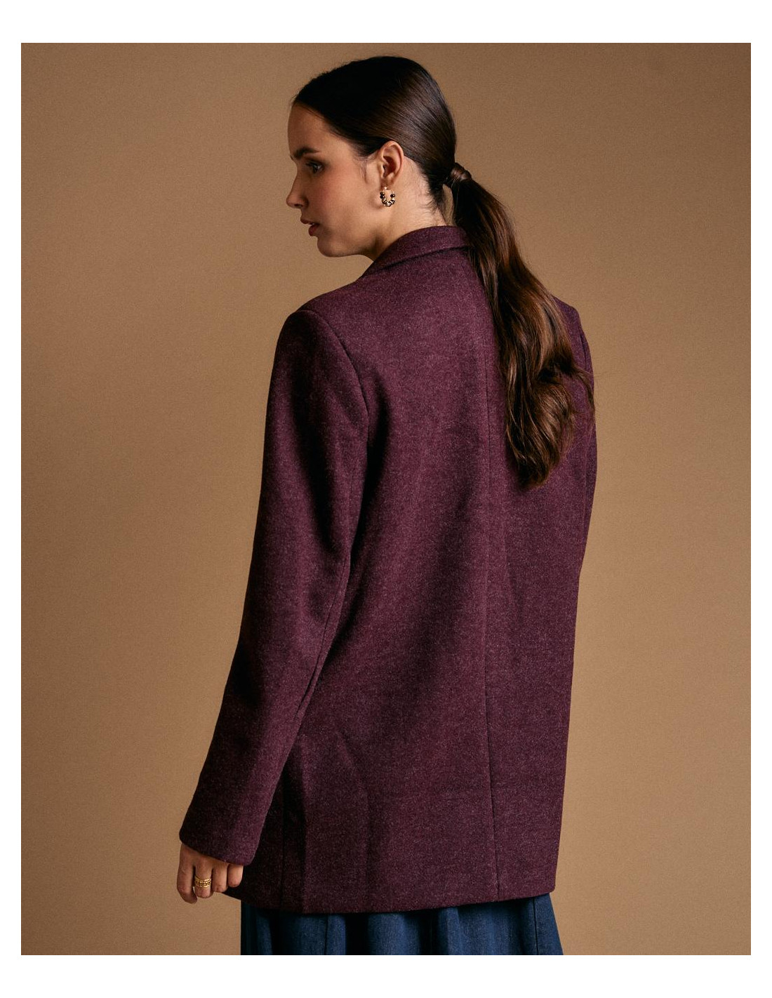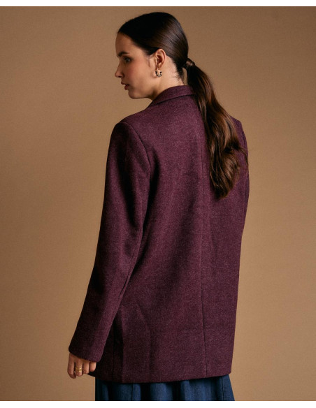 <p><span style="font-size: 10pt; font-family: Arial;">Abrigo de paño en color berenjena. Diseño clásico con solapas, cierre de botones delanteros y bolsillos con solapa. Manga larga y corte estructurado.</span></p>