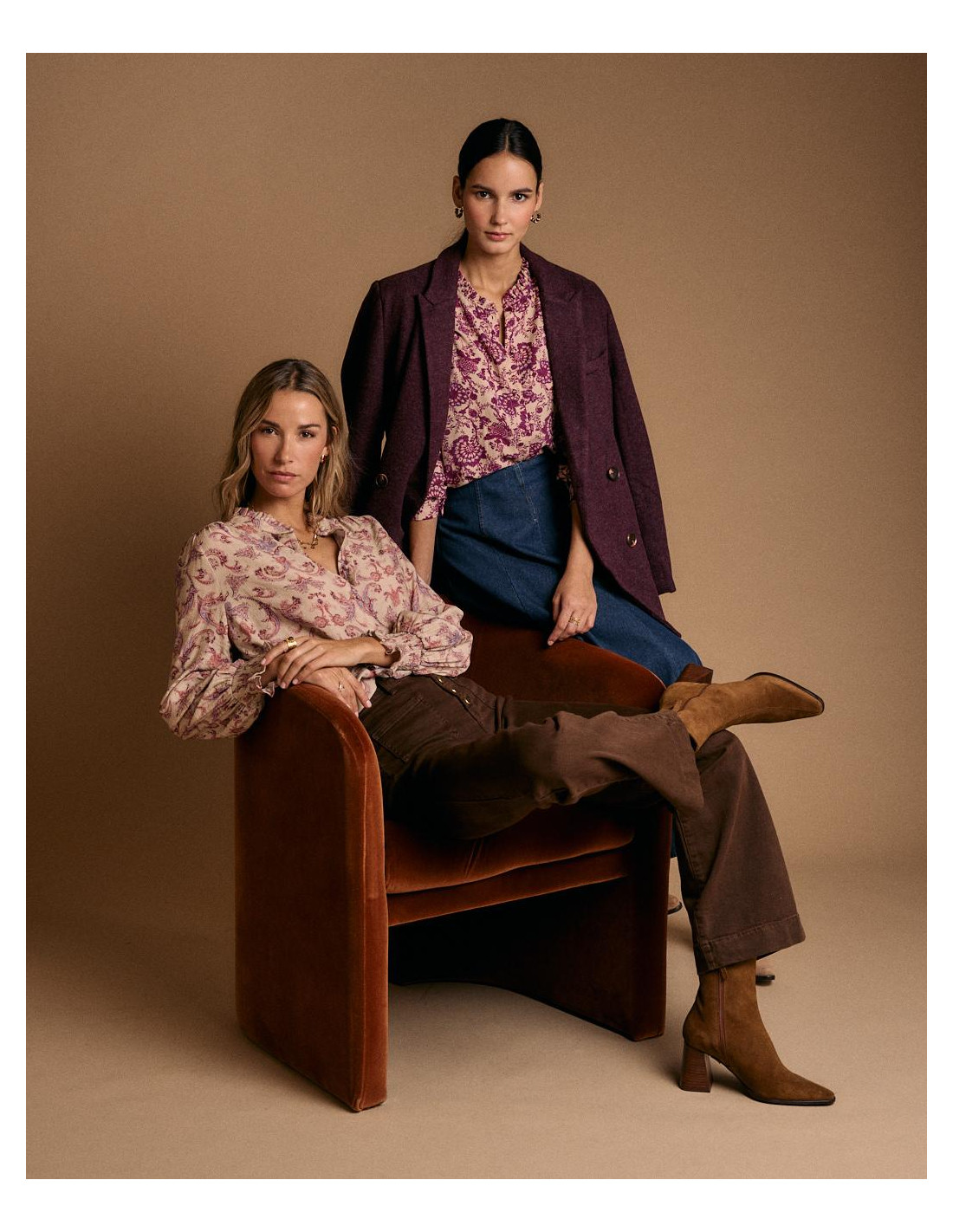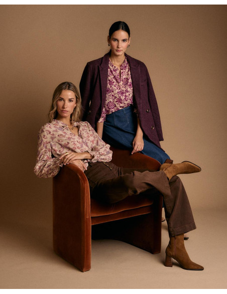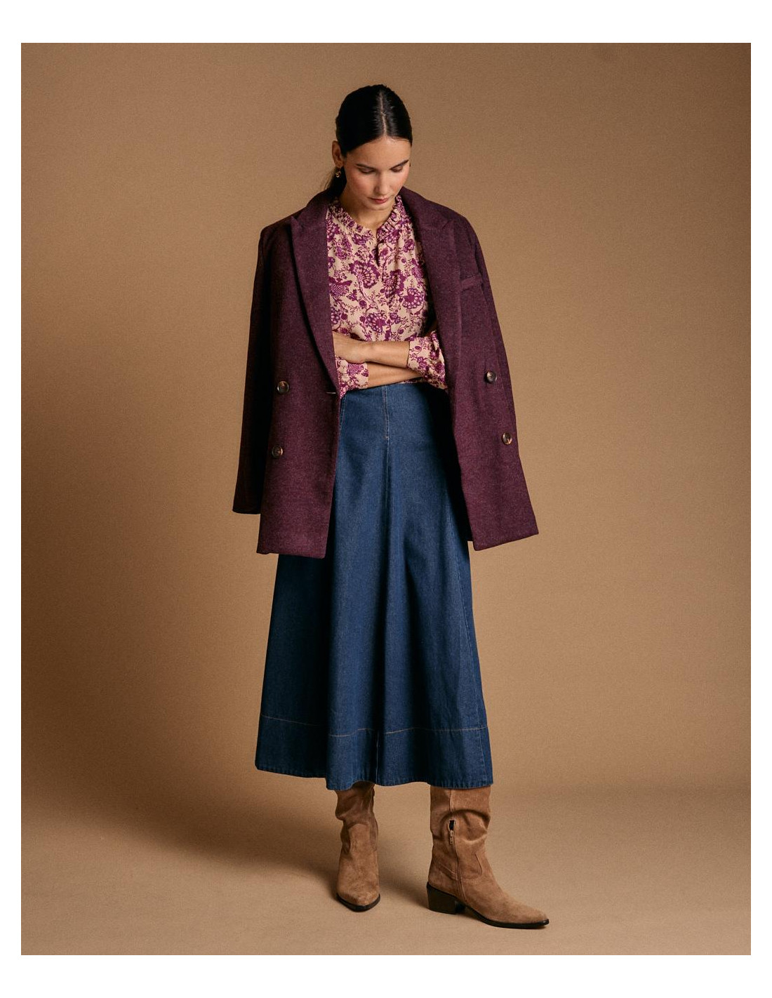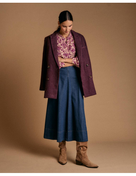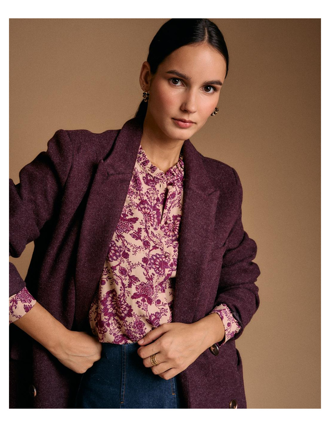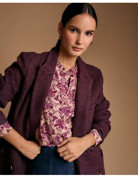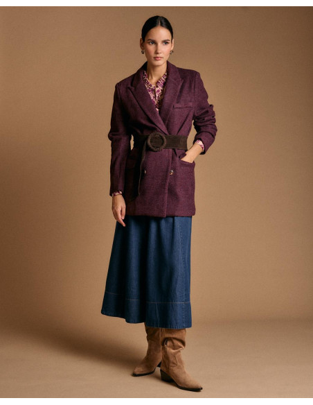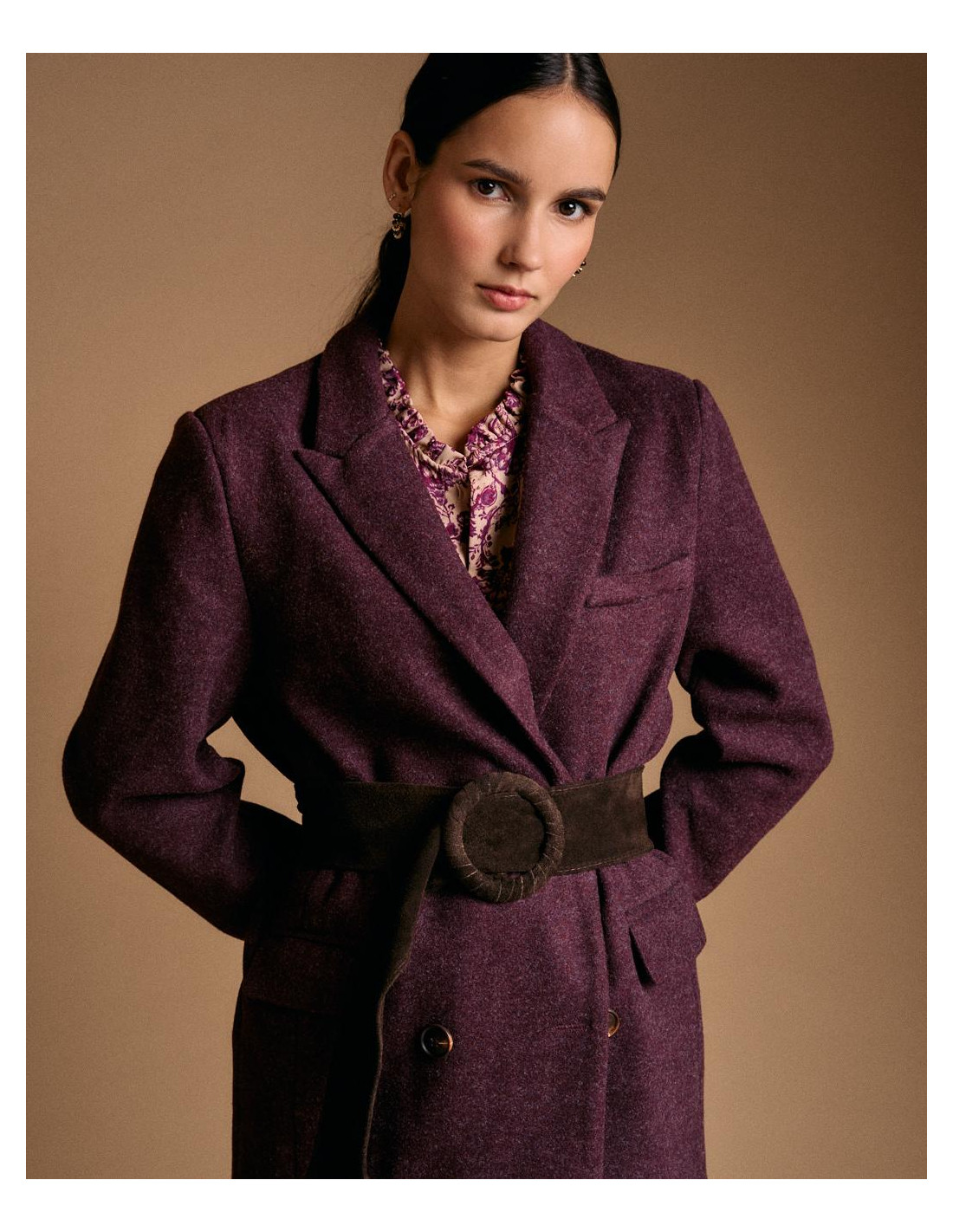 <p><span style="font-size: 10pt; font-family: Arial;">Abrigo de paño en color berenjena. Diseño clásico con solapas, cierre de botones delanteros y bolsillos con solapa. Manga larga y corte estructurado.</span></p>