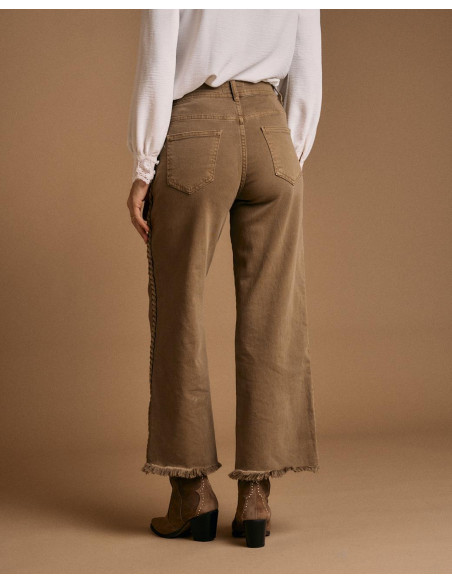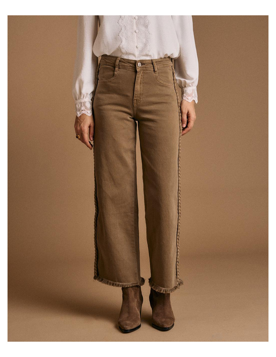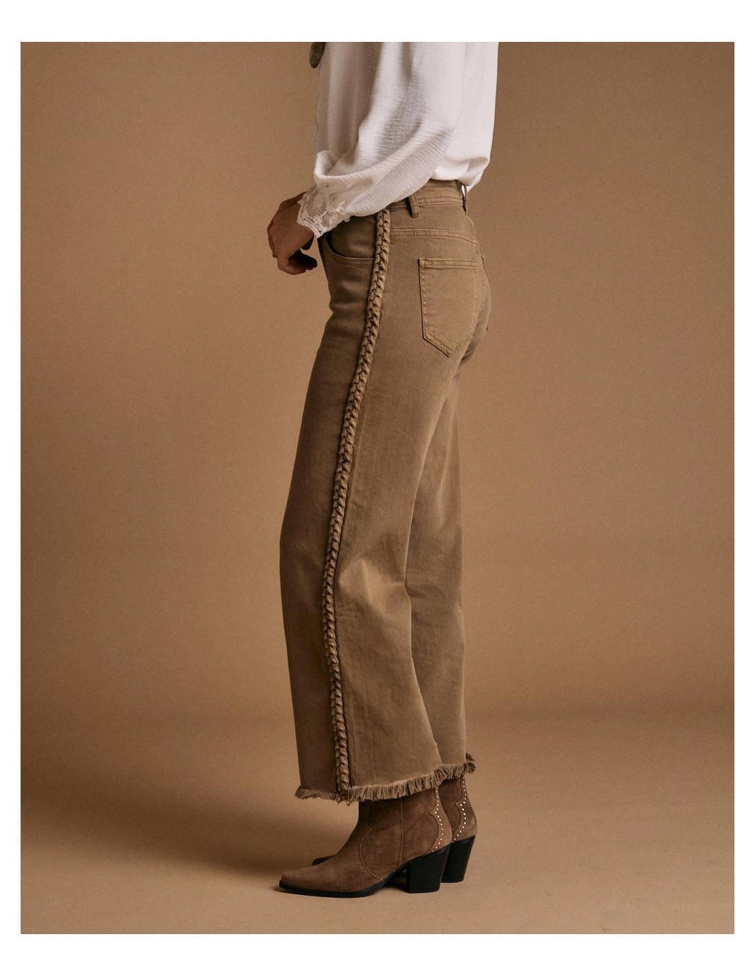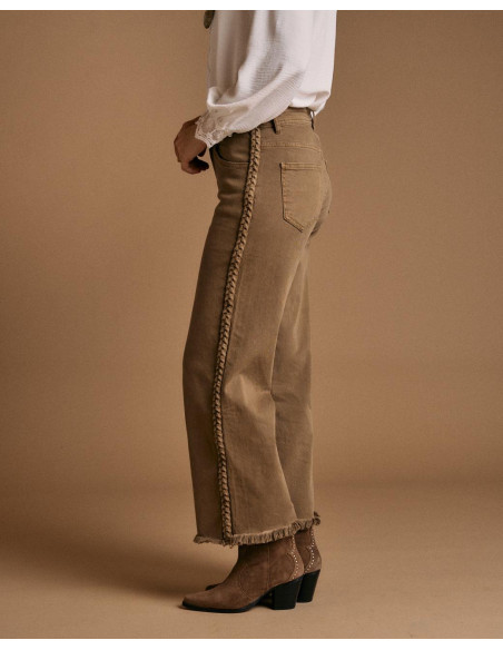 <p><span style="font-size: 10pt; font-family: Arial;">Pantalón vaquero en color taupe con diseño de tiro alto y bolsillos delanteros. Detalle de trenzado lateral a lo largo de la pierna.</span></p>