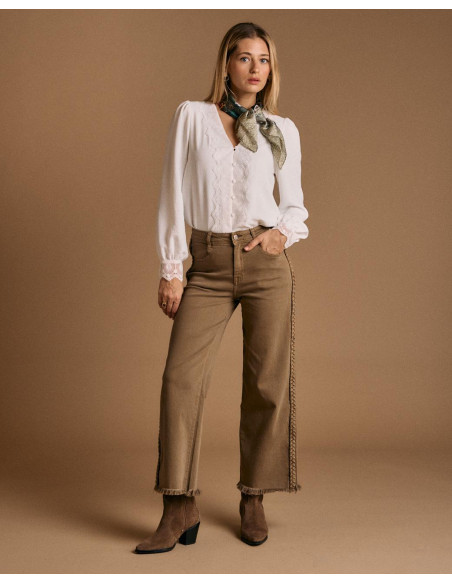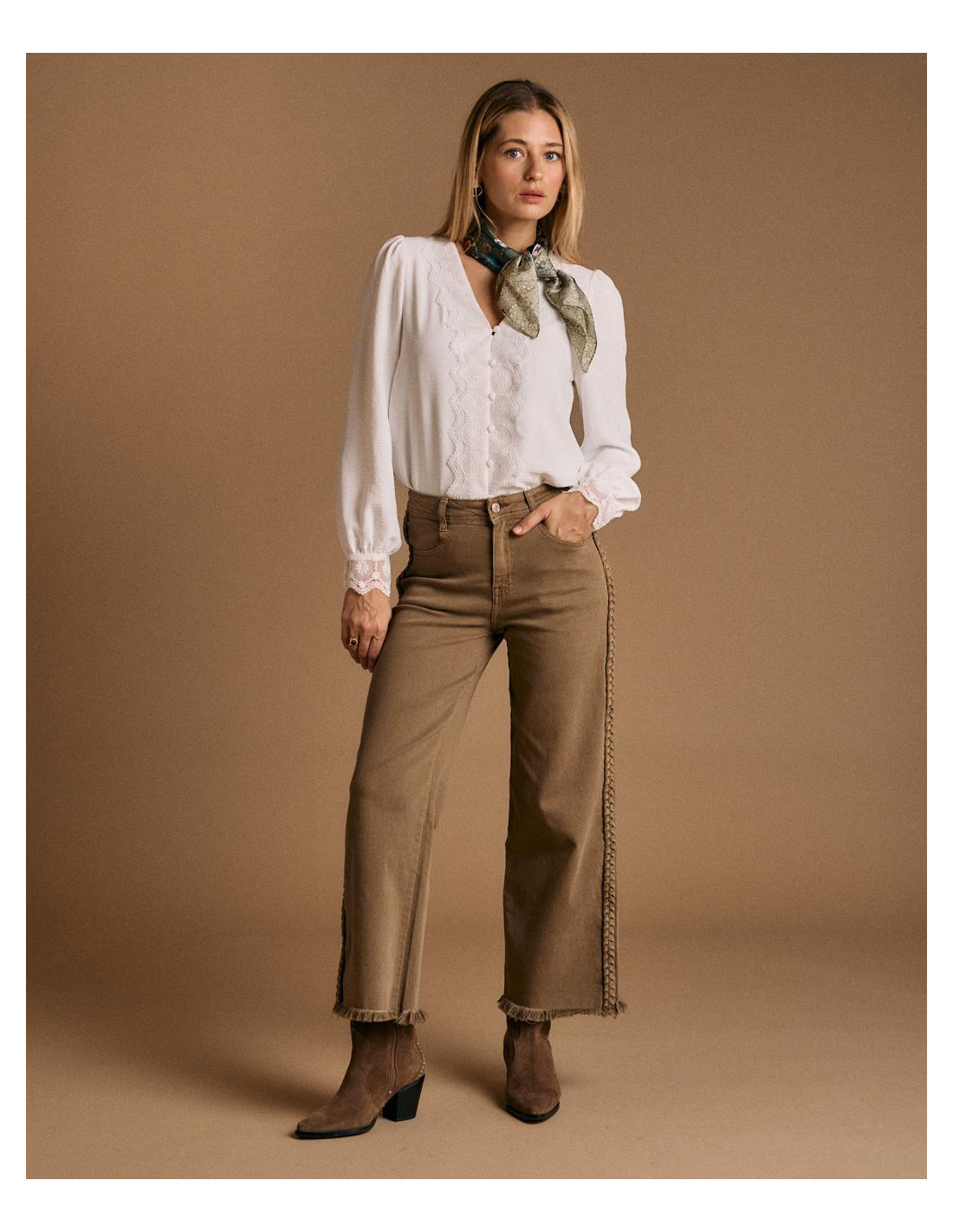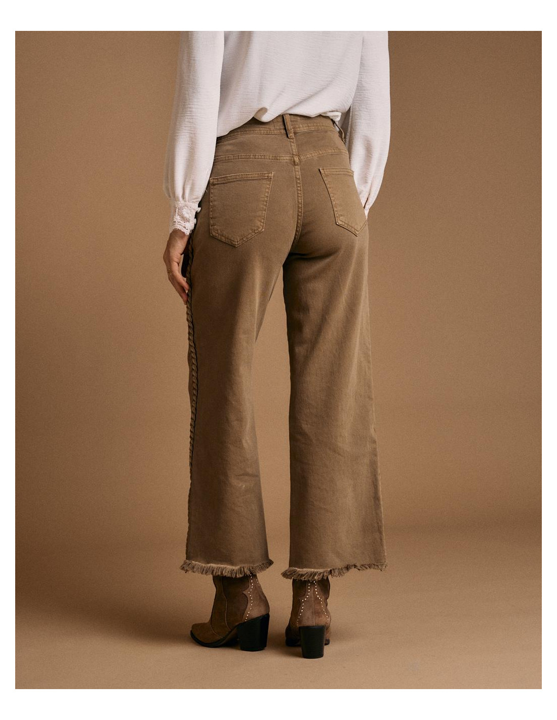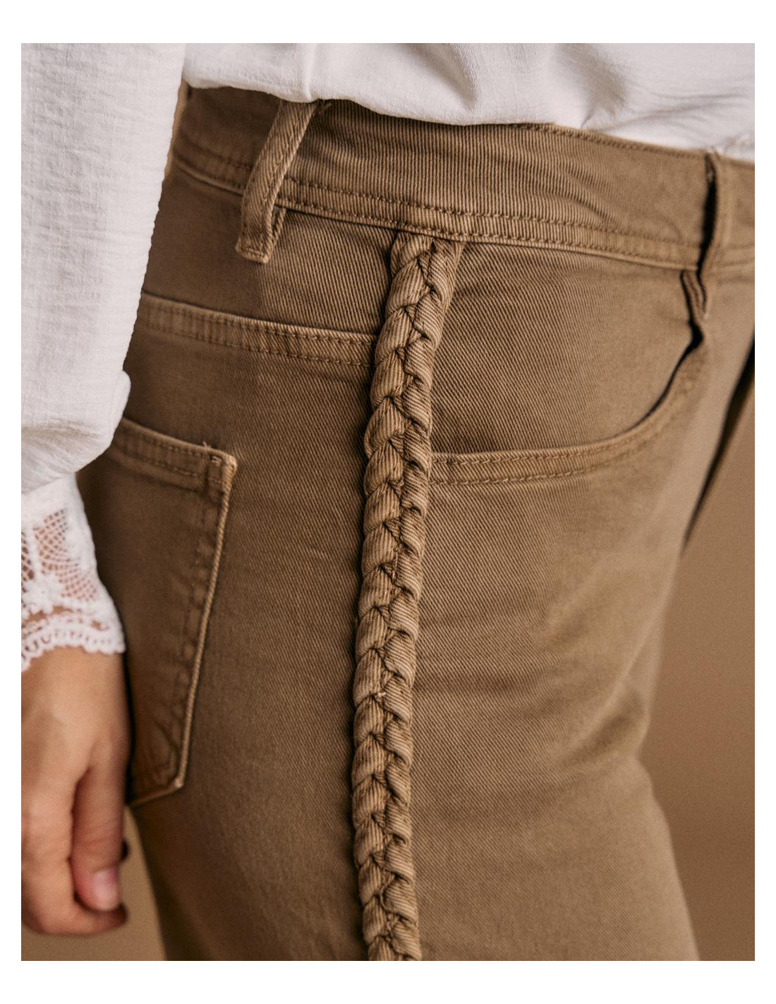 <p><span style="font-size: 10pt; font-family: Arial;">Pantalón vaquero en color taupe con diseño de tiro alto y bolsillos delanteros. Detalle de trenzado lateral a lo largo de la pierna.</span></p>