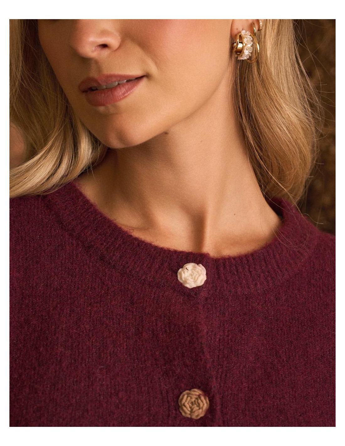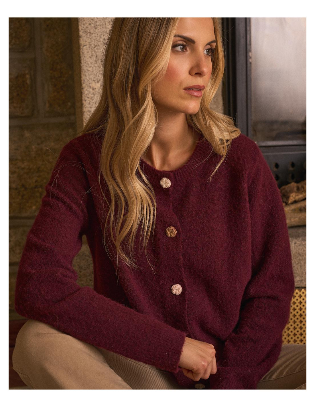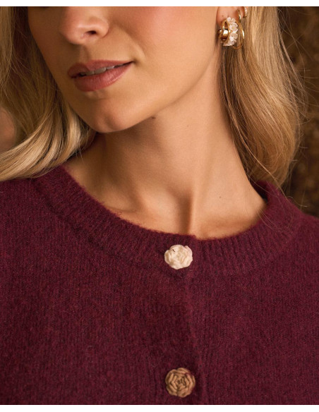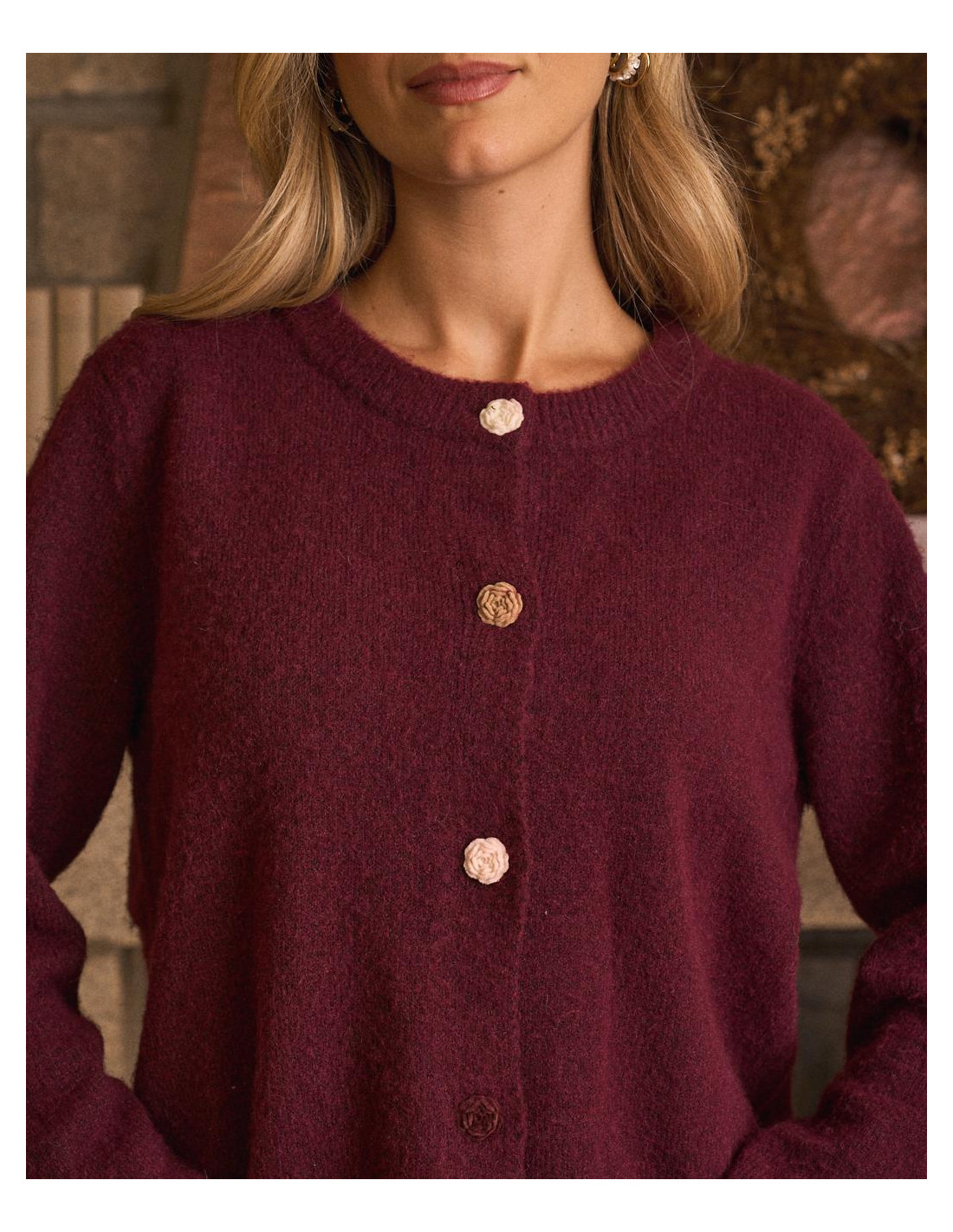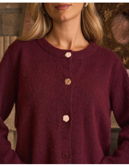 <p><span style="font-size: 10pt; font-family: Arial;">Cárdigan de punto en color burdeos, con botones en forma de flor en tonos rosa y textura suave.</span></p>
