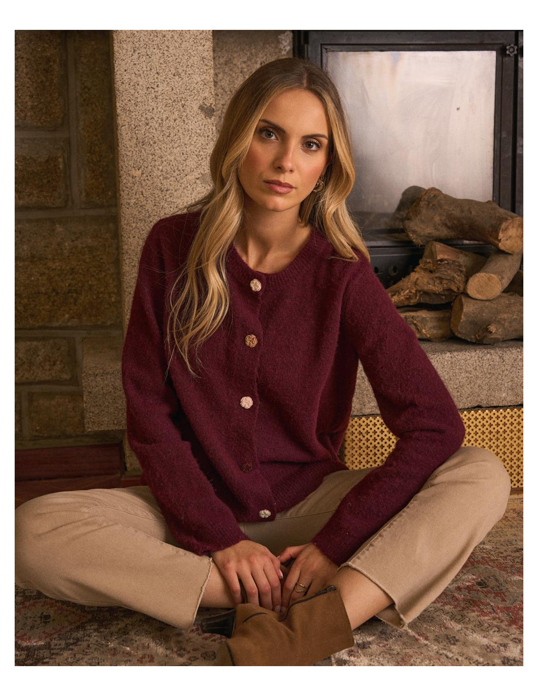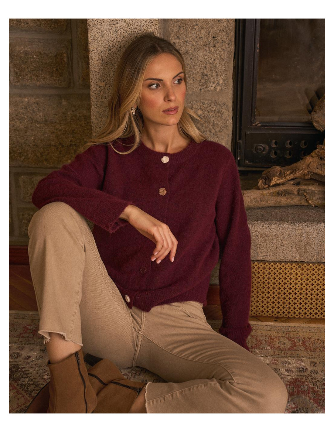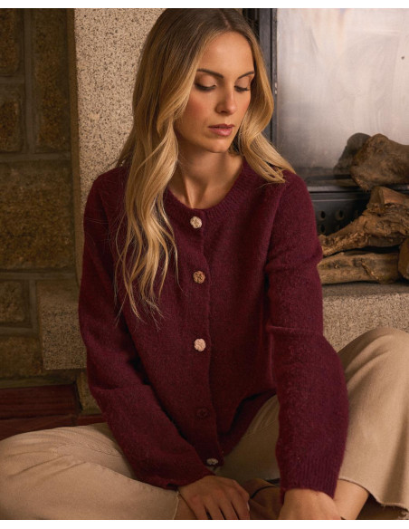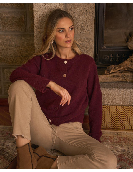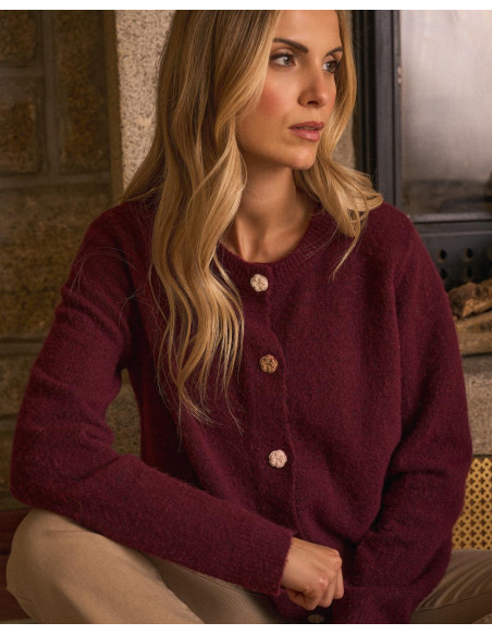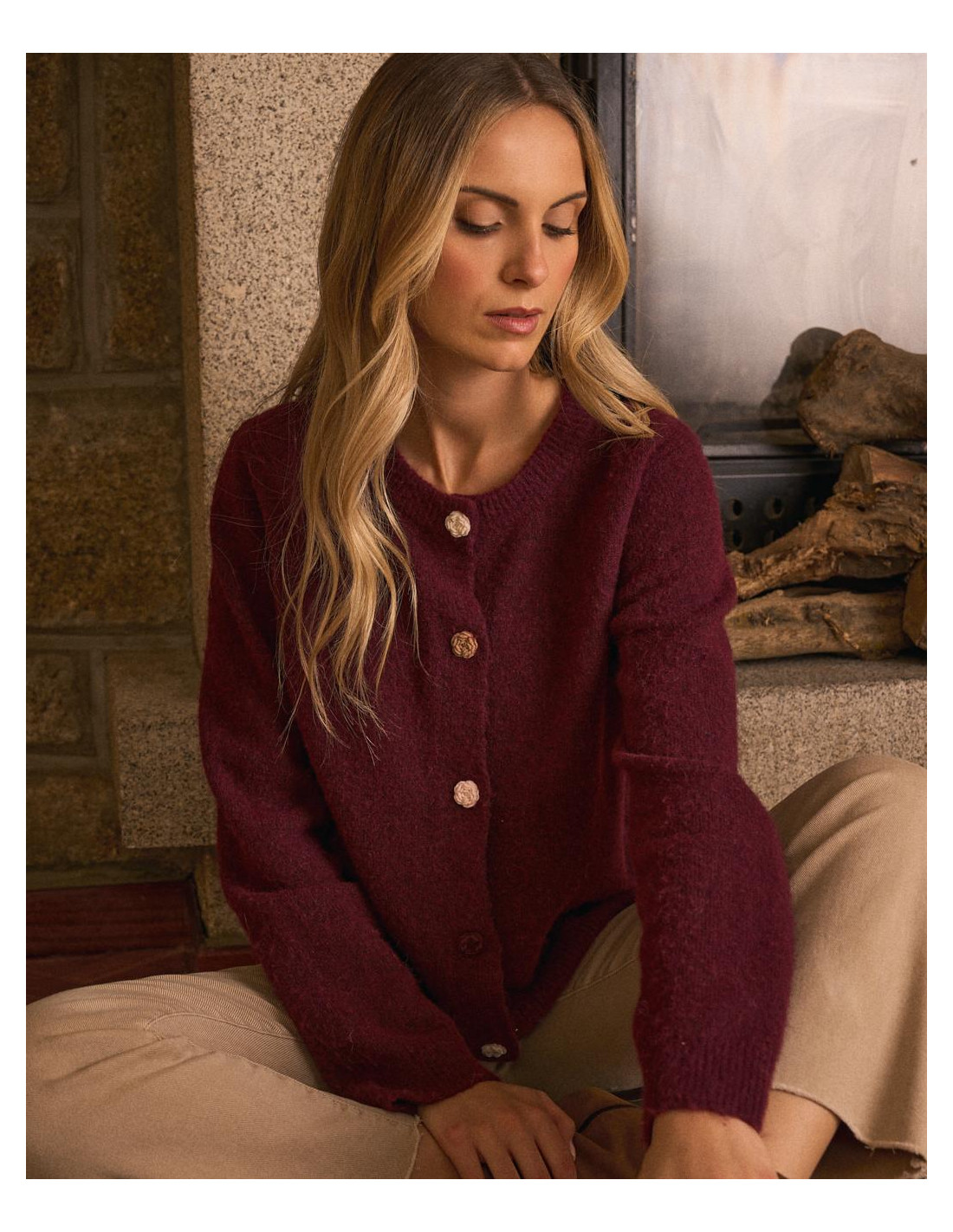 <p><span style="font-size: 10pt; font-family: Arial;">Cárdigan de punto en color burdeos, con botones en forma de flor en tonos rosa y textura suave.</span></p>