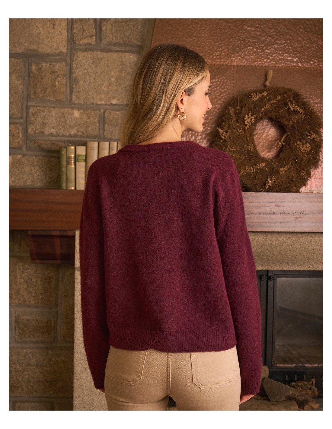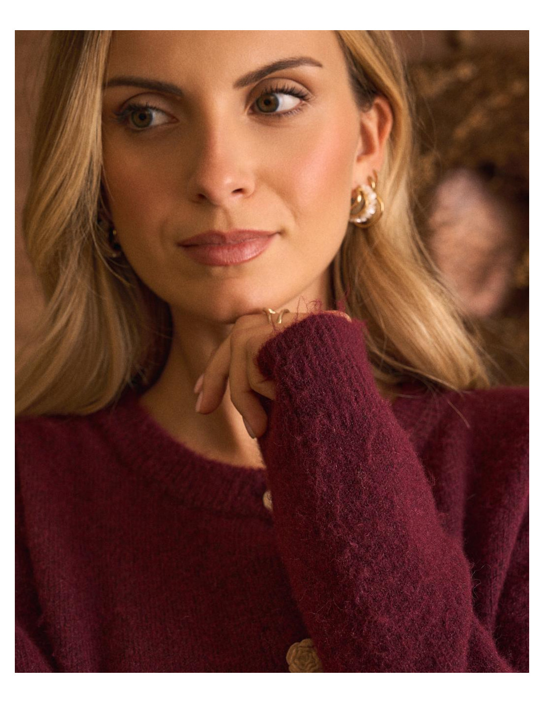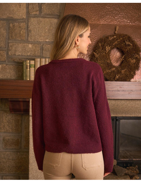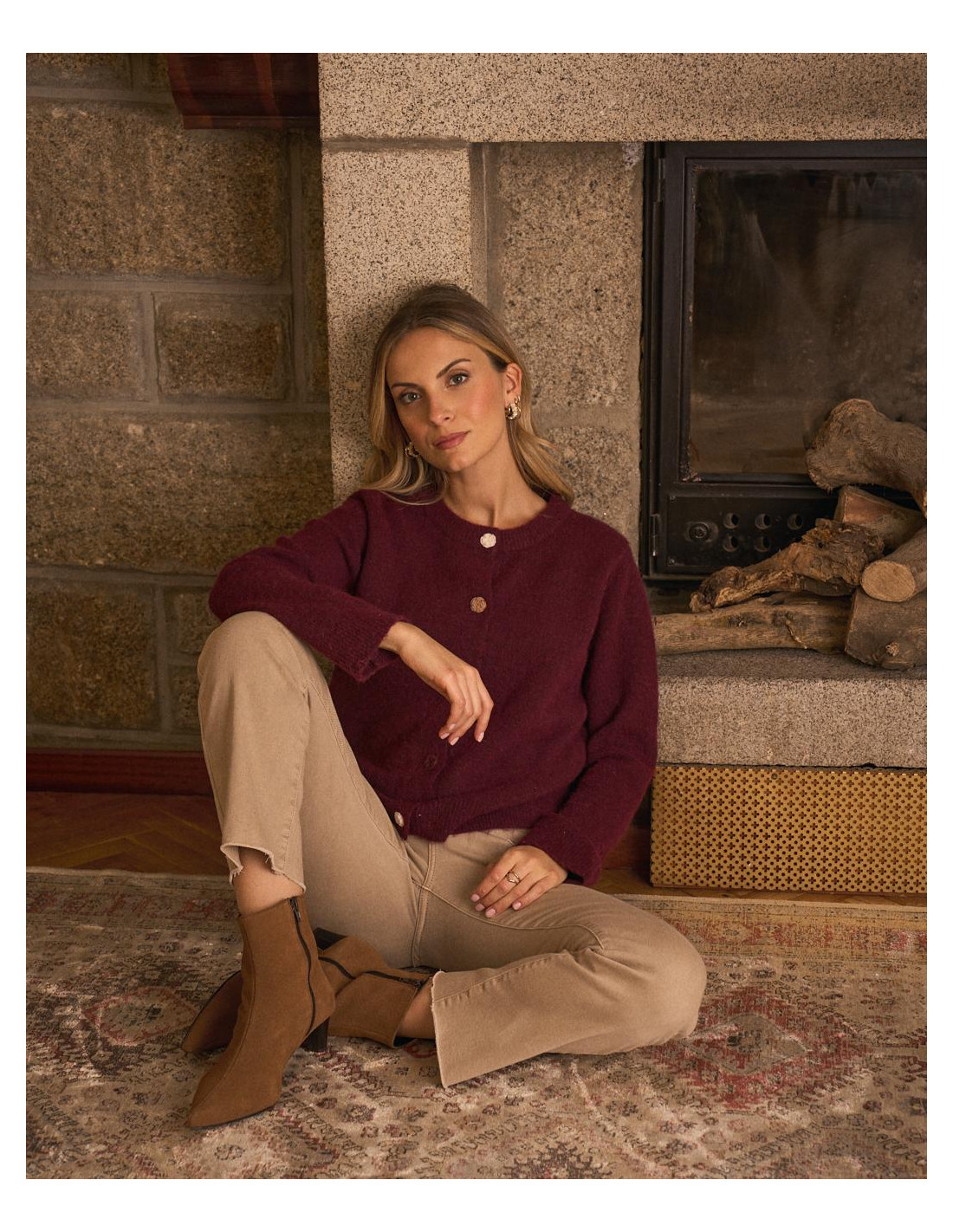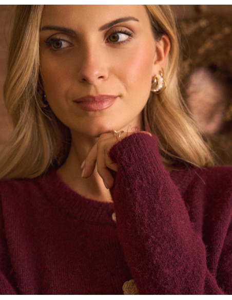 <p><span style="font-size: 10pt; font-family: Arial;">Cárdigan de punto en color burdeos, con botones en forma de flor en tonos rosa y textura suave.</span></p>