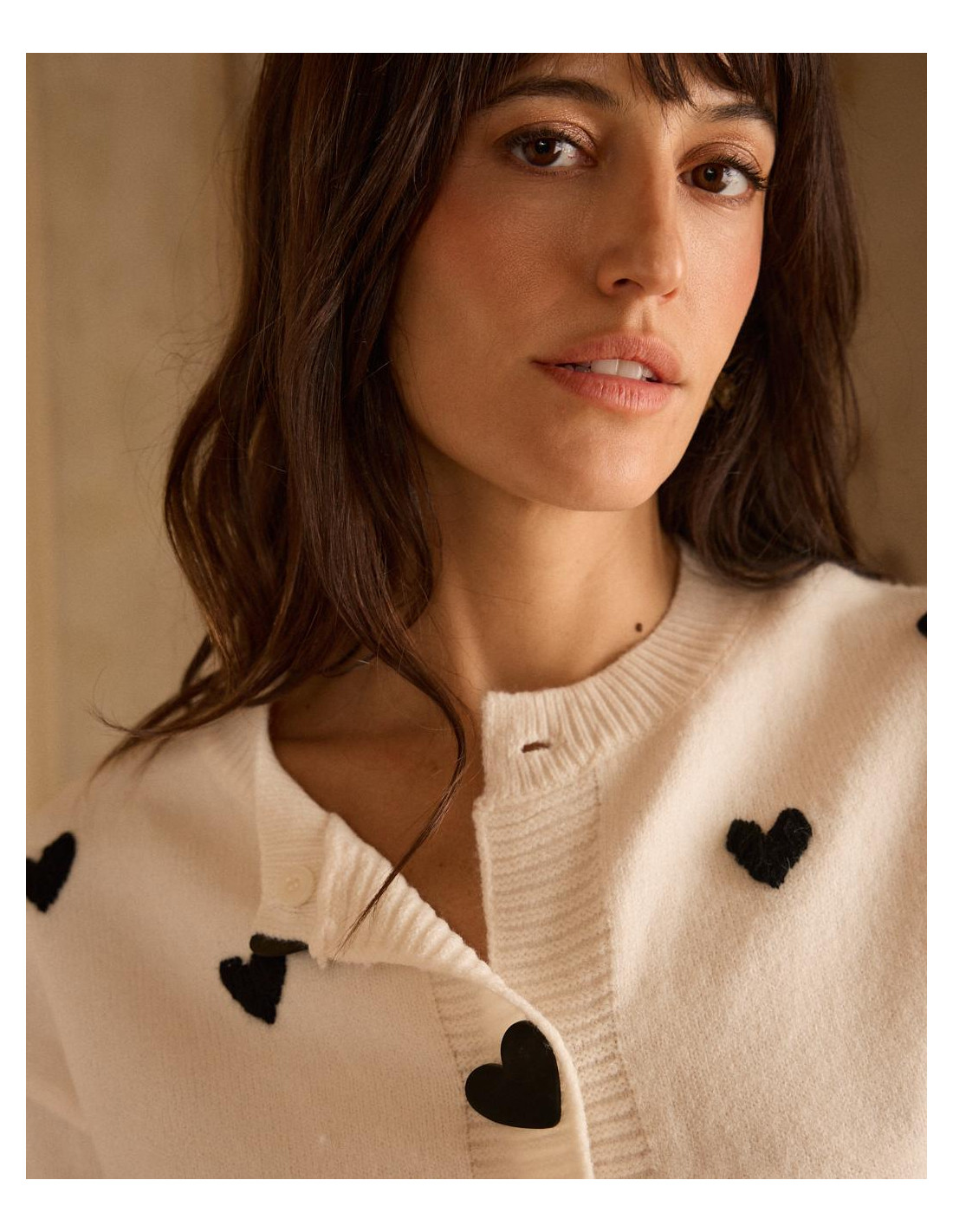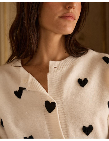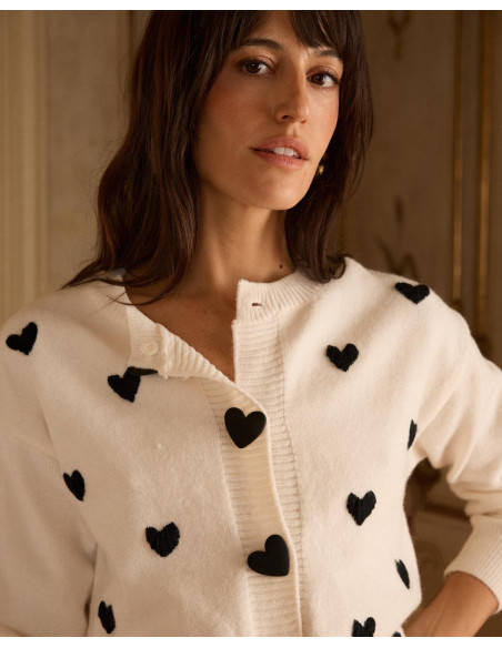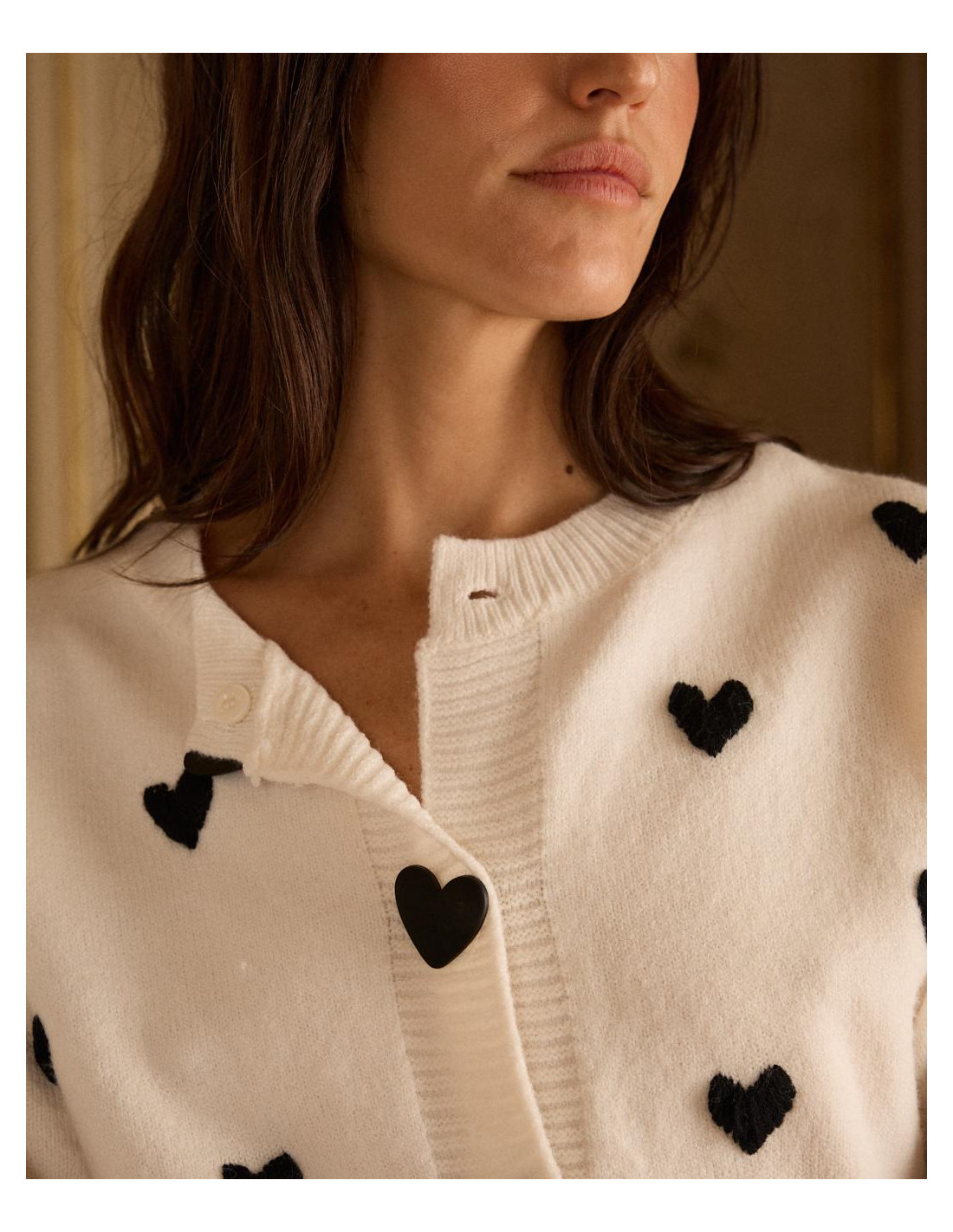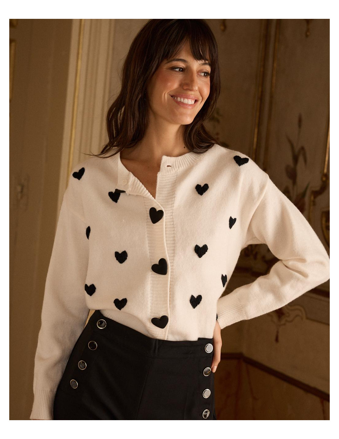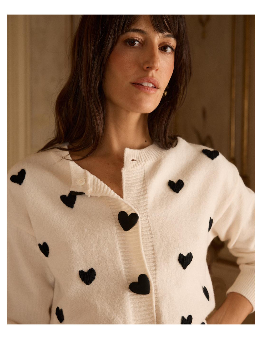<p><span style="font-size: 10pt; font-family: Arial;">Cardigan de color blanca con detalle de corazones negros. Chaqueta de punto de manga larga y cuello redondo</span></p>