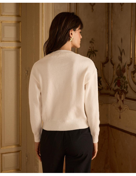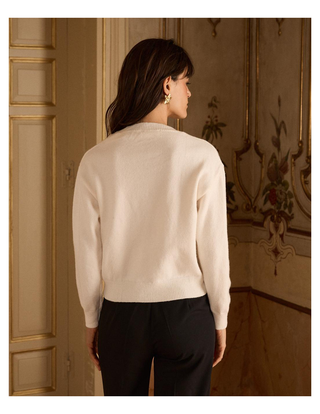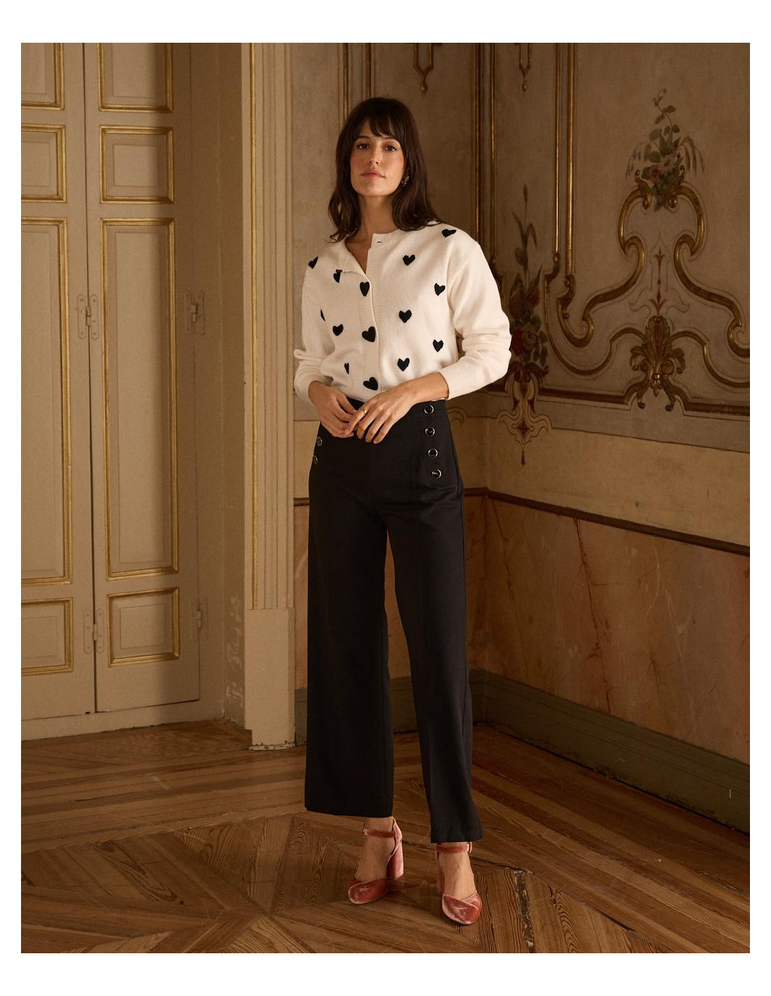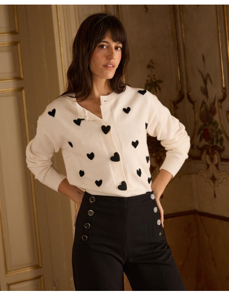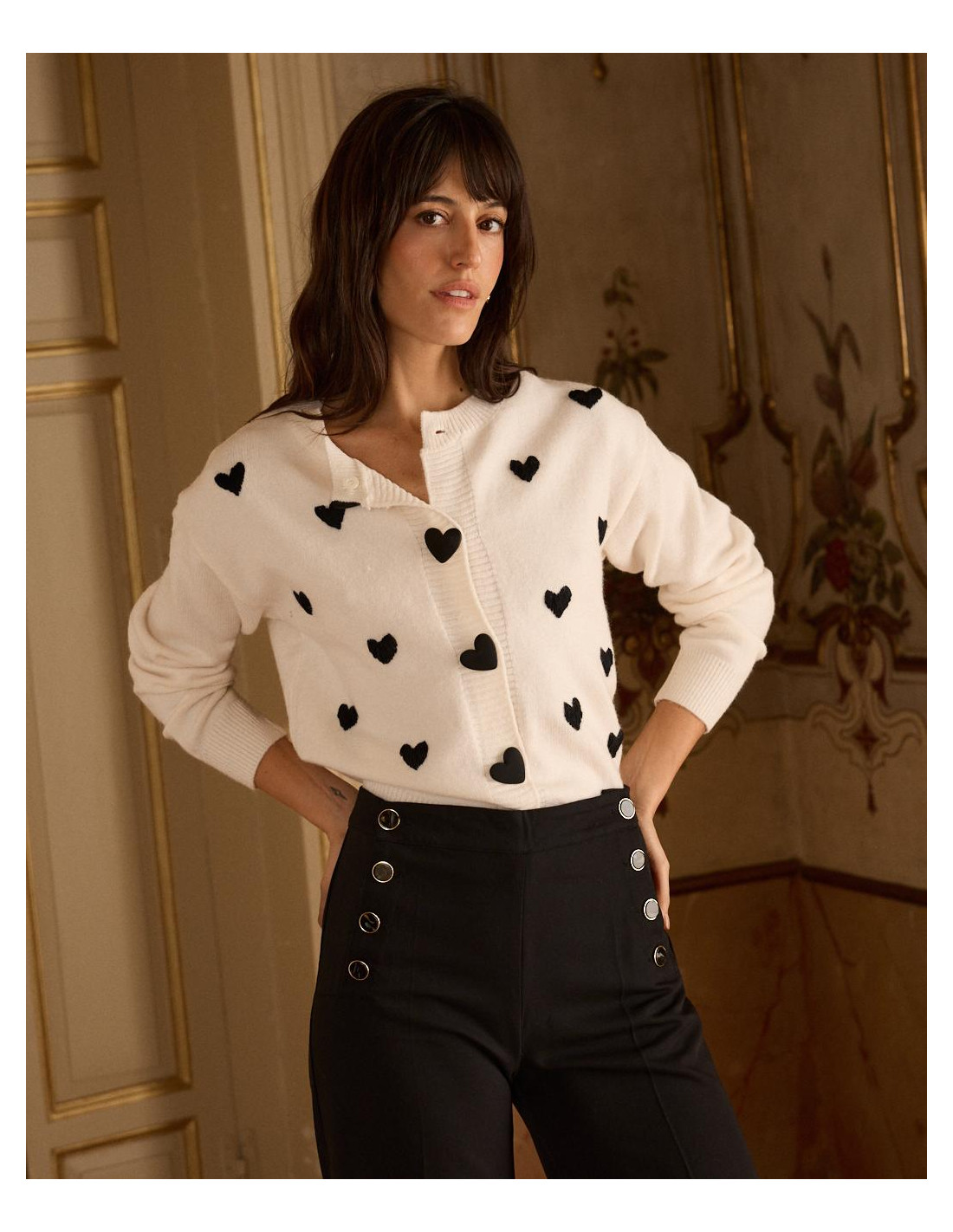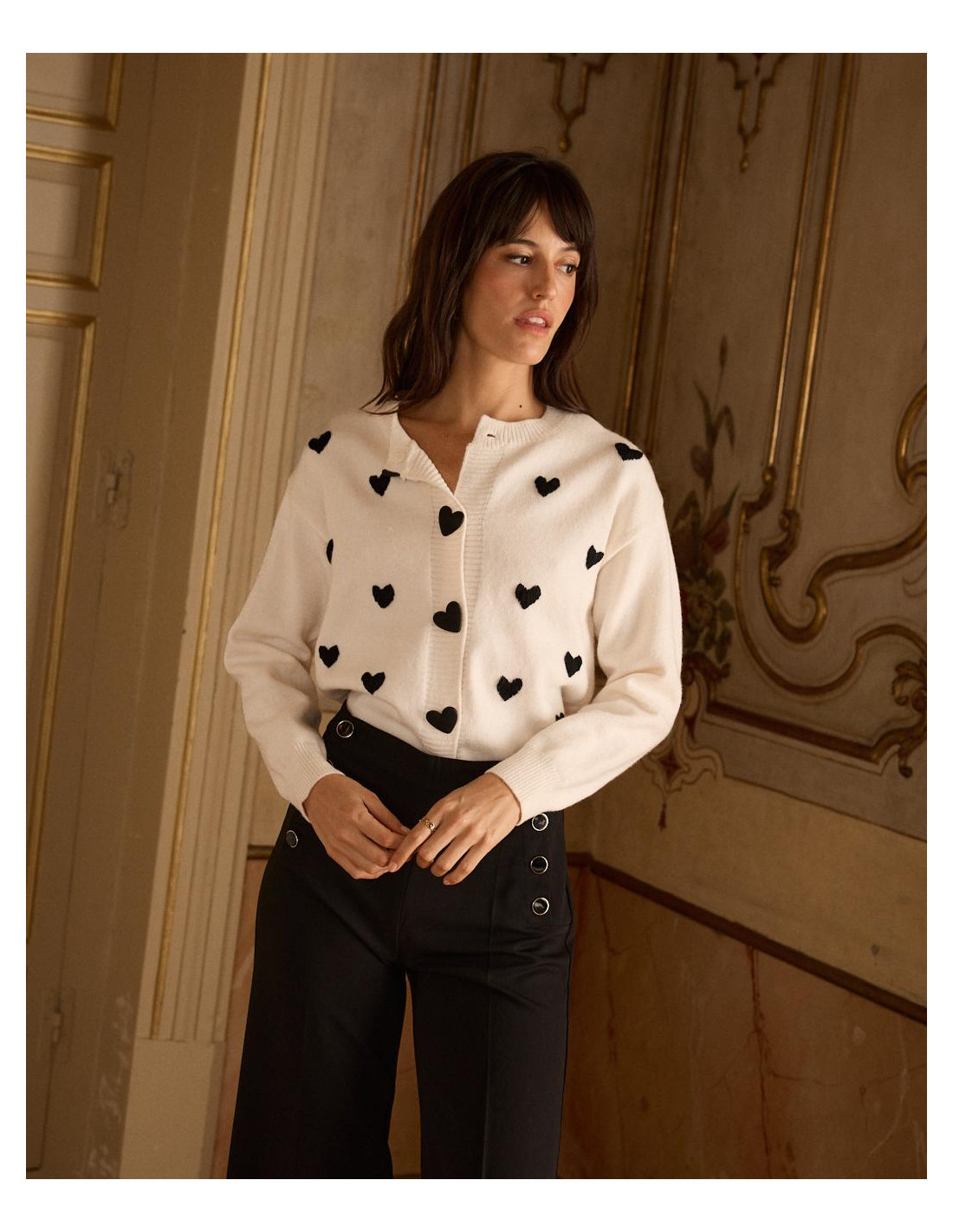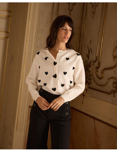 <p><span style="font-size: 10pt; font-family: Arial;">Cardigan de color blanca con detalle de corazones negros. Chaqueta de punto de manga larga y cuello redondo</span></p>
