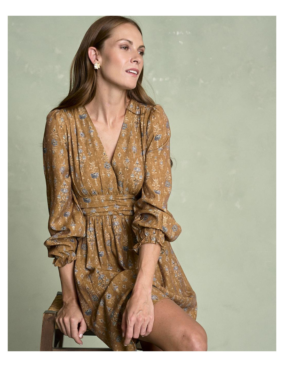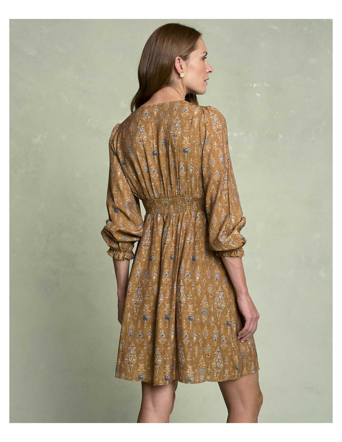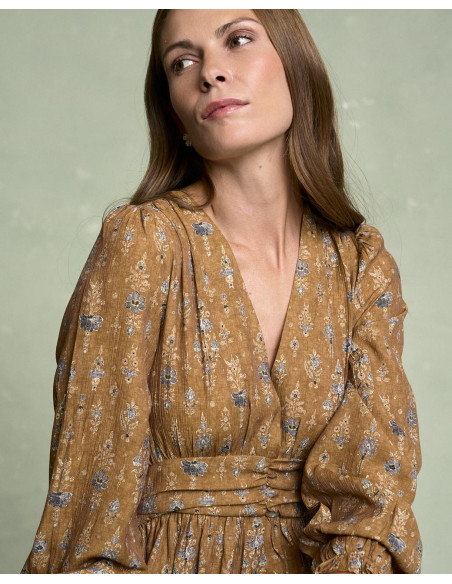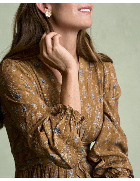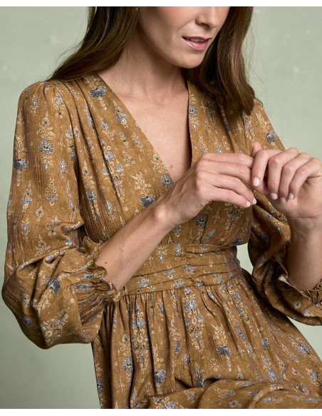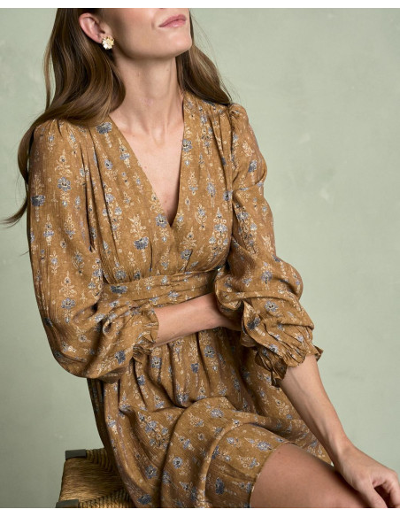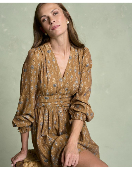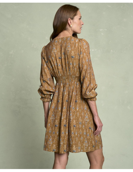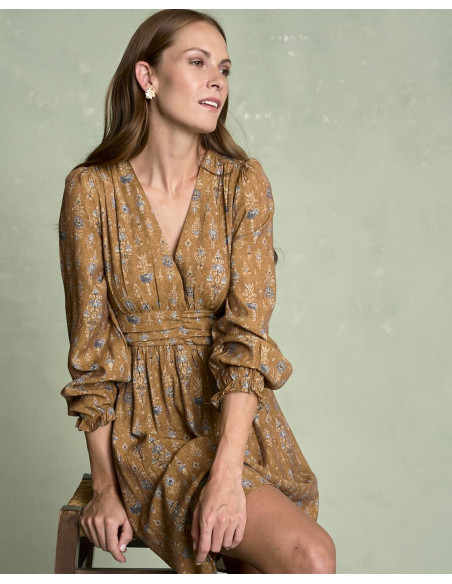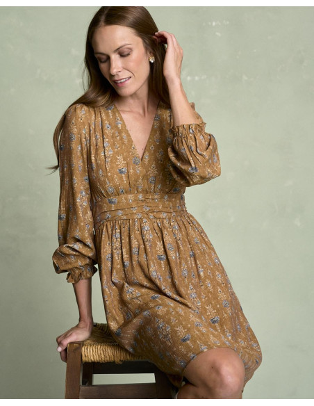 <p><span style="font-size: 10pt; font-family: Arial;">Vestido corto estampado en color camel con escote en pico, detalle fruncido en la cintura que estiliza la silueta, manga larga terminada en goma con volante y falda fluida de caída ligera.</span></p>