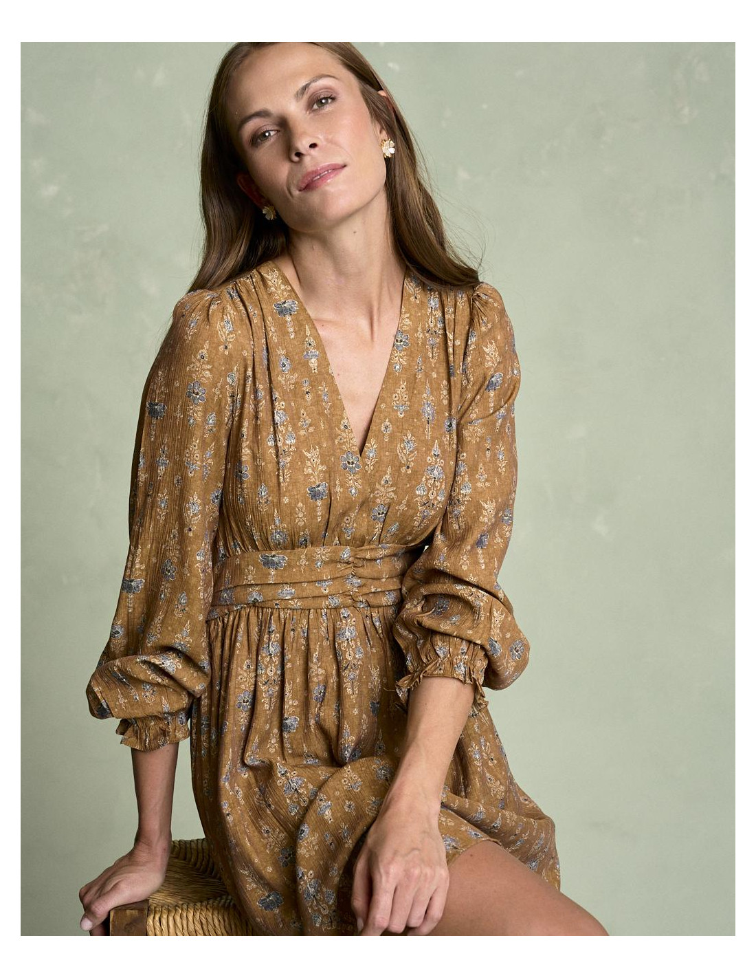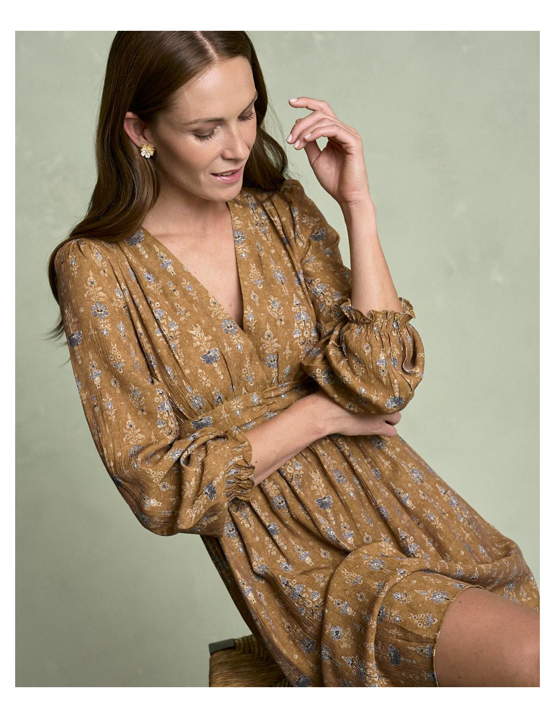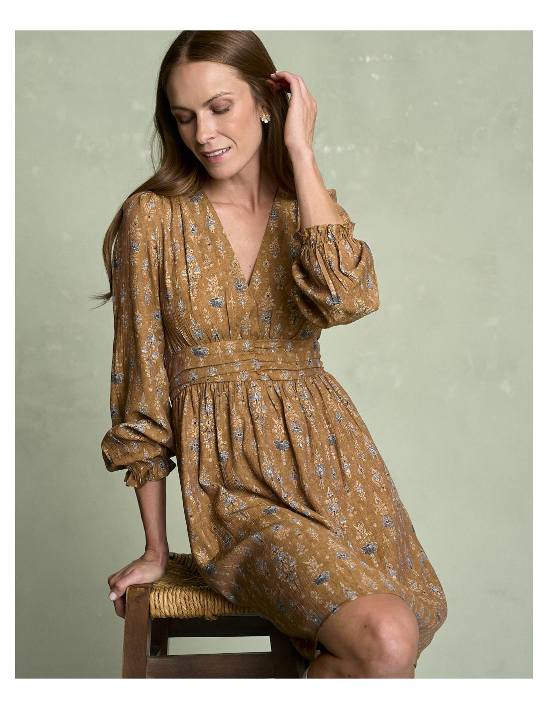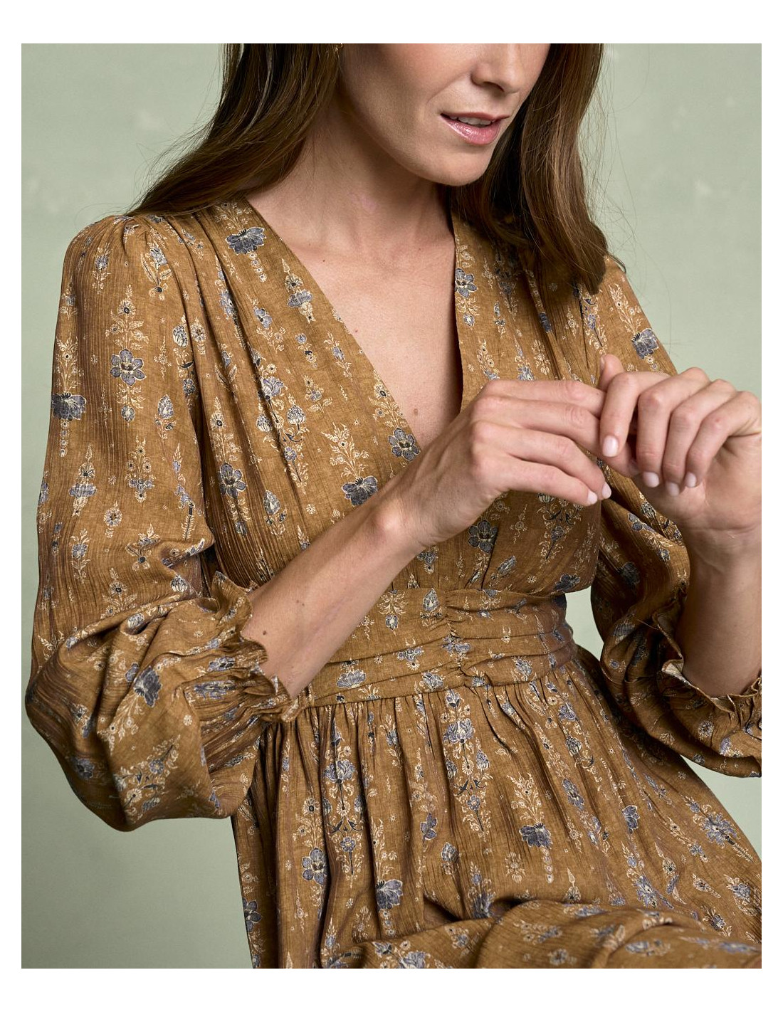 <p><span style="font-size: 10pt; font-family: Arial;">Vestido corto estampado en color camel con escote en pico, detalle fruncido en la cintura que estiliza la silueta, manga larga terminada en goma con volante y falda fluida de caída ligera.</span></p>