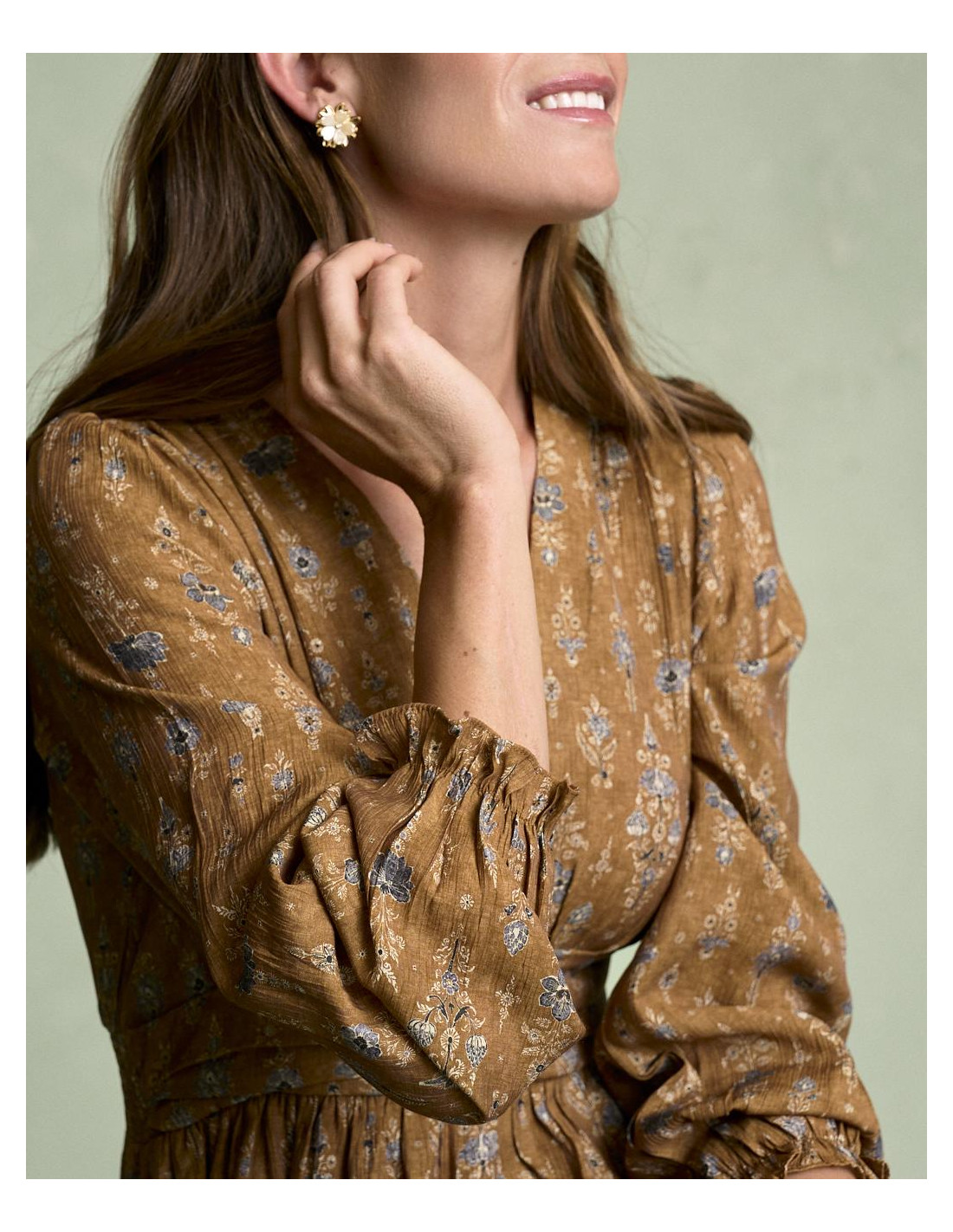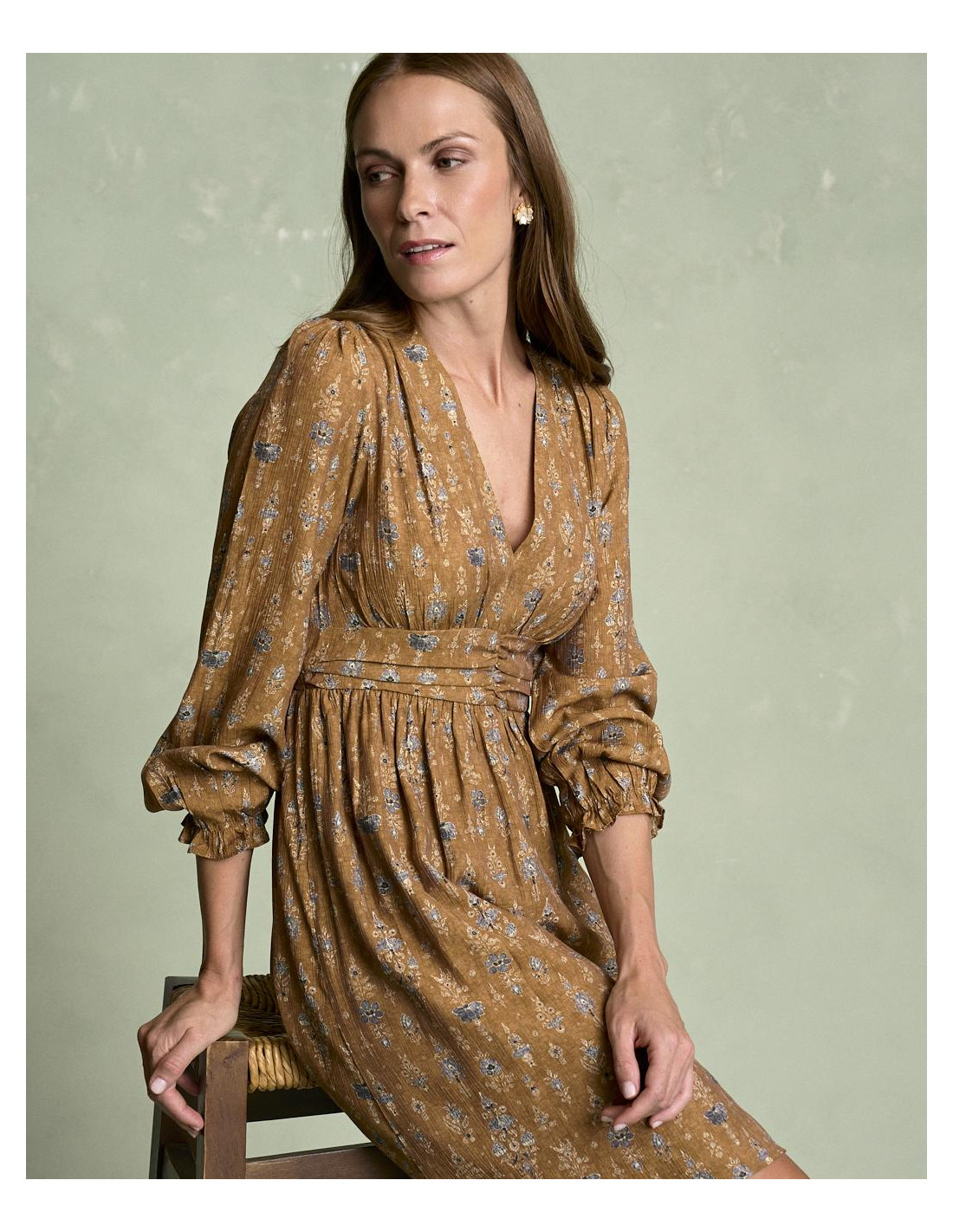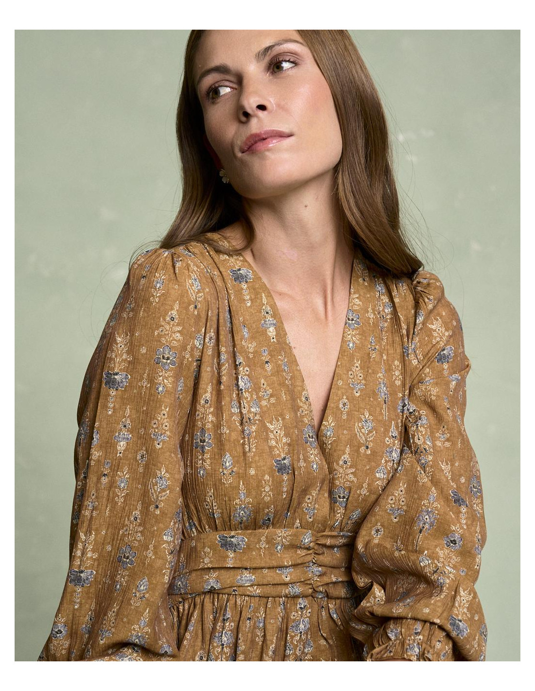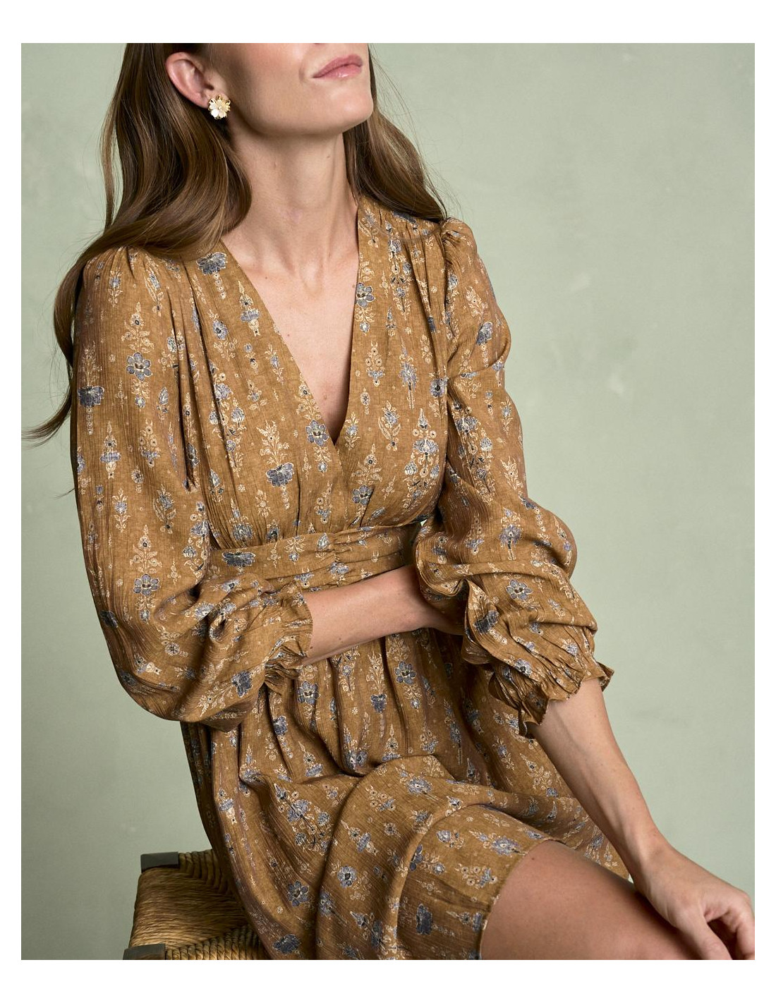 <p><span style="font-size: 10pt; font-family: Arial;">Vestido corto estampado en color camel con escote en pico, detalle fruncido en la cintura que estiliza la silueta, manga larga terminada en goma con volante y falda fluida de caída ligera.</span></p>