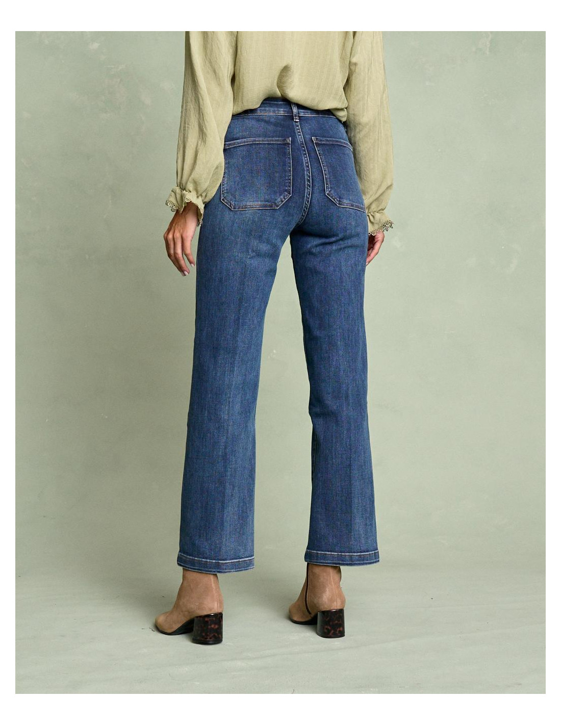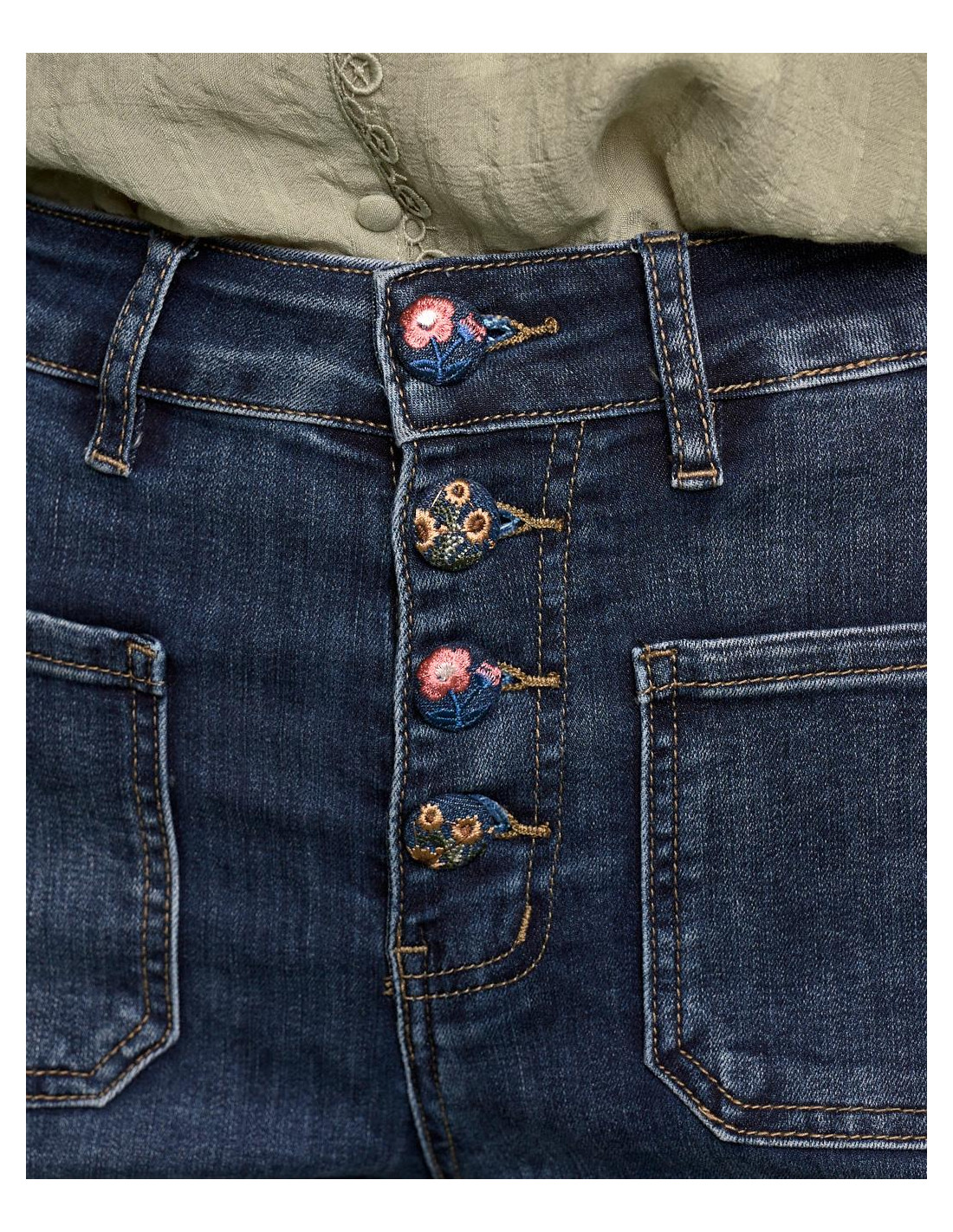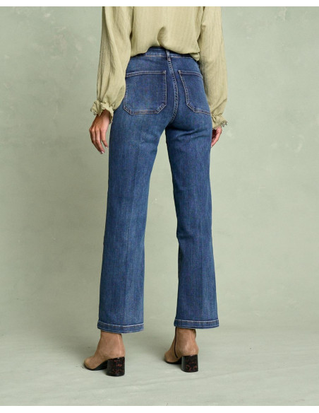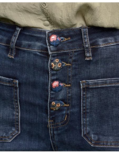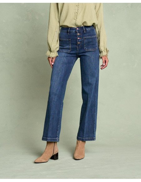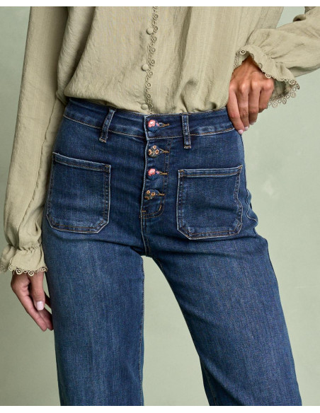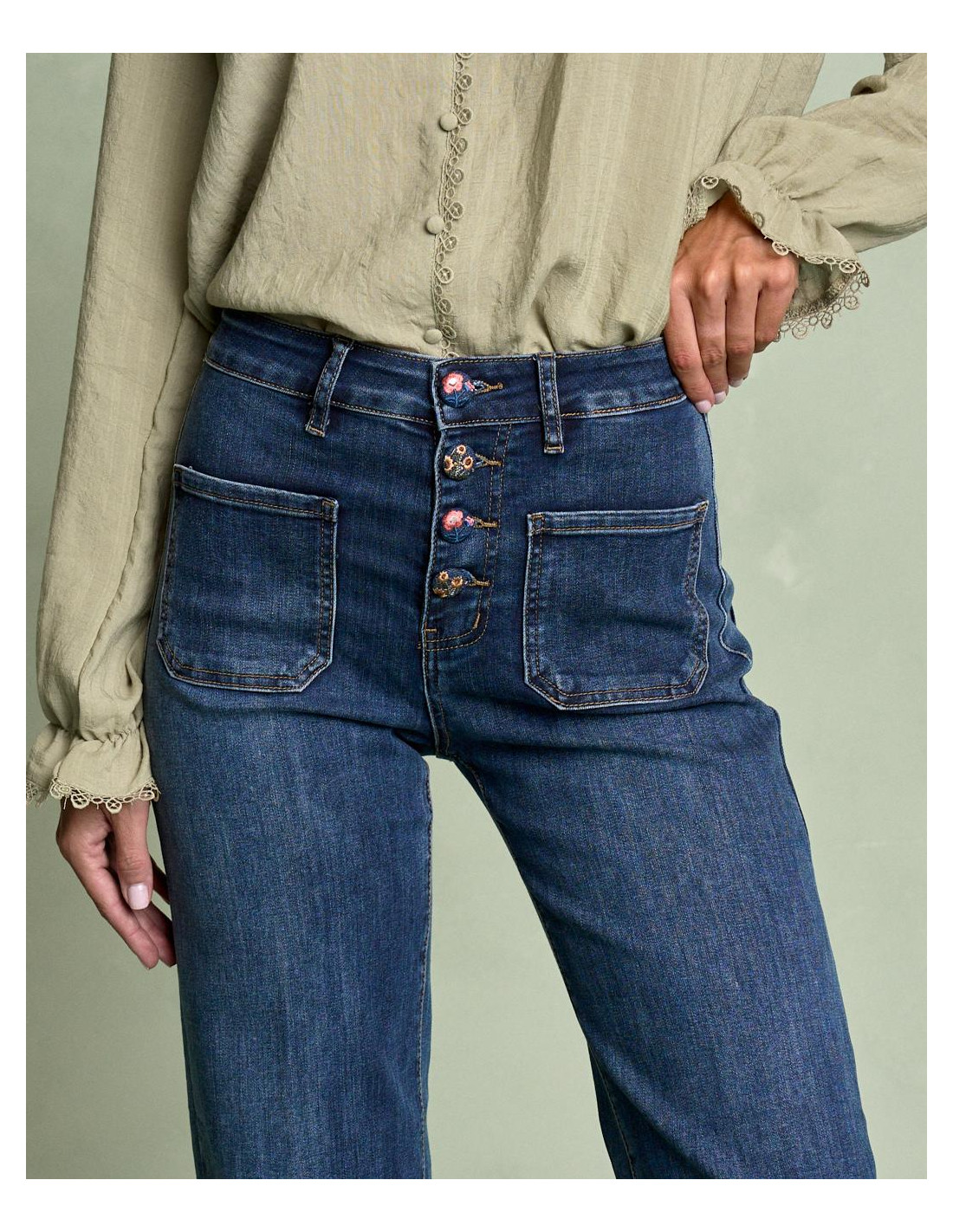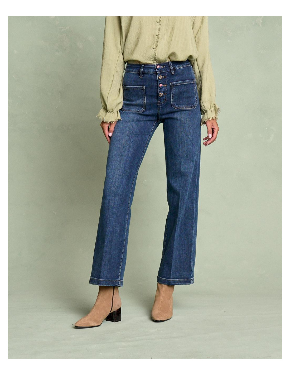 <p><span style="font-size: 10pt; font-family: Arial;">Pantalón vaquero de corte recto en color azul denim con un diseño de tiro alto. Cuenta con bolsillos en la parte delantera y una hilera de botones forrados con tela estampada.</span></p>