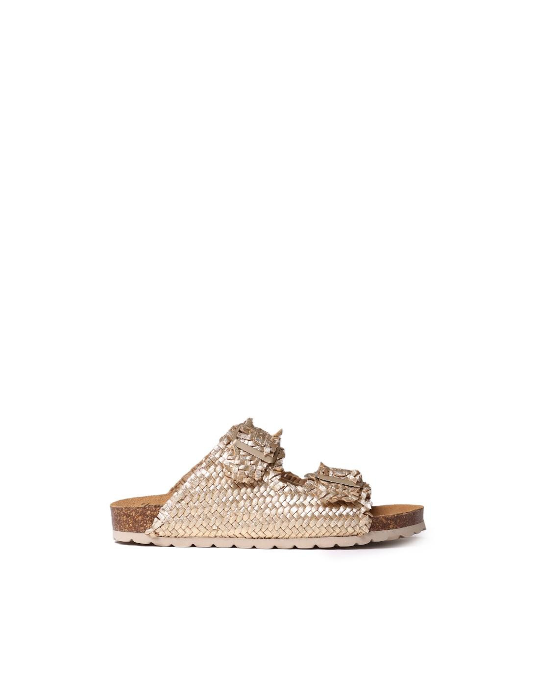 Sandalia bio rafia trenzada desflecada doble hebilla en color plati. MODELO GUAM-TE COLOR PLATI/PLATINUM