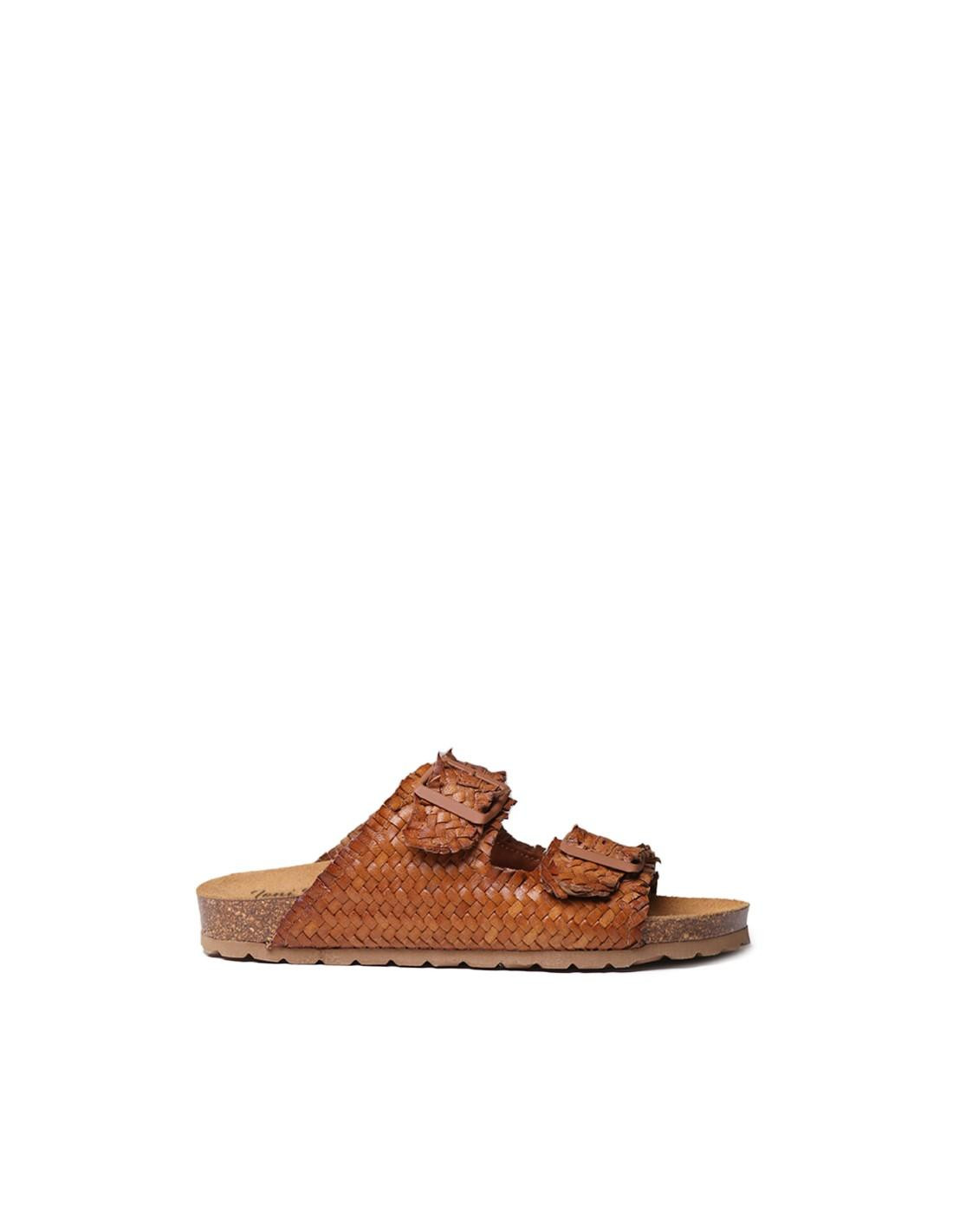 Sandalia bio rafia trenzada desflecada doble hebilla en color cuiro. MODELO GUAM-TE COLOR CUIRO/TAN