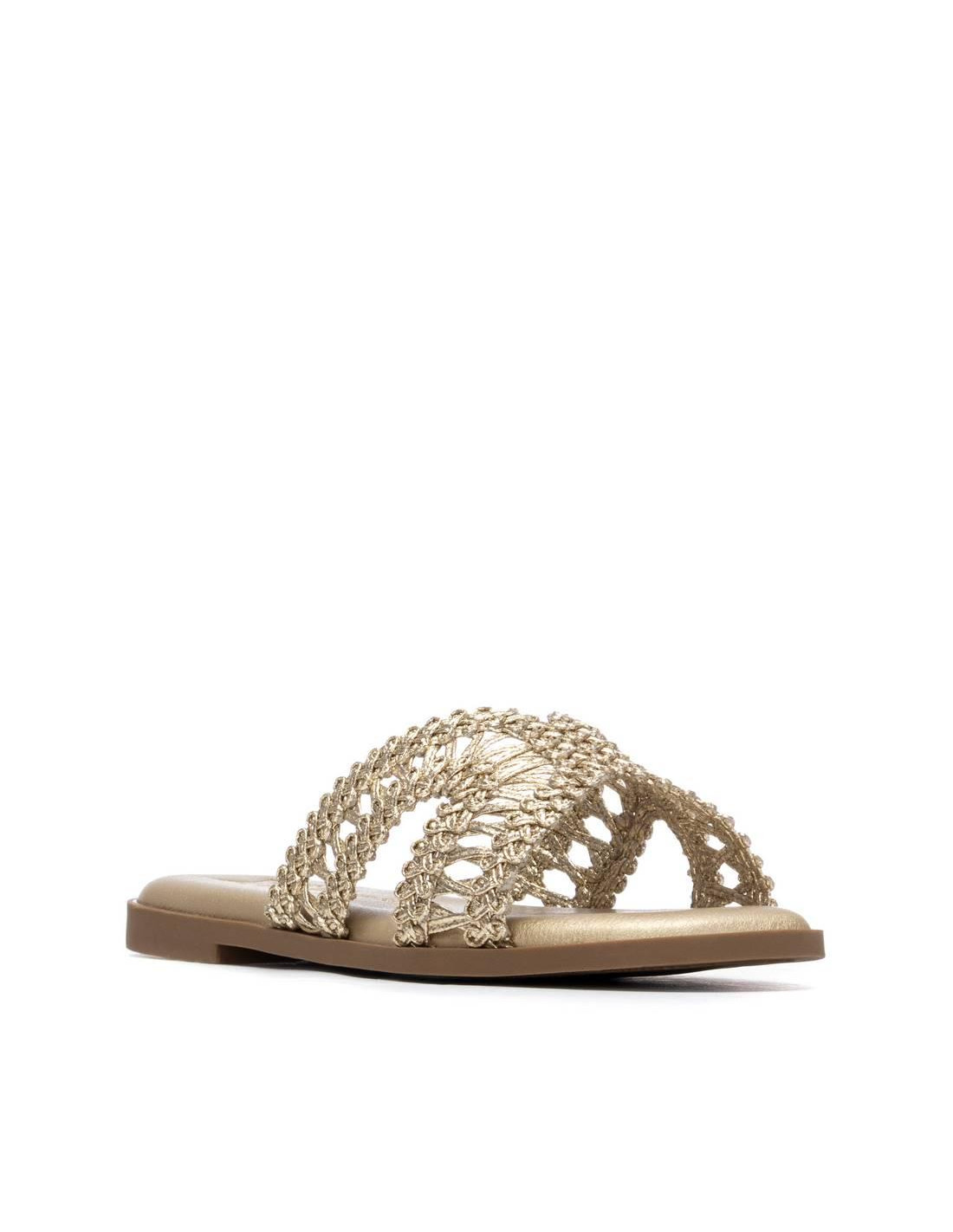 Sandalia plana en forma de pala con detalle de trenzado en color oro. MODELO 145373 COLOR ORO