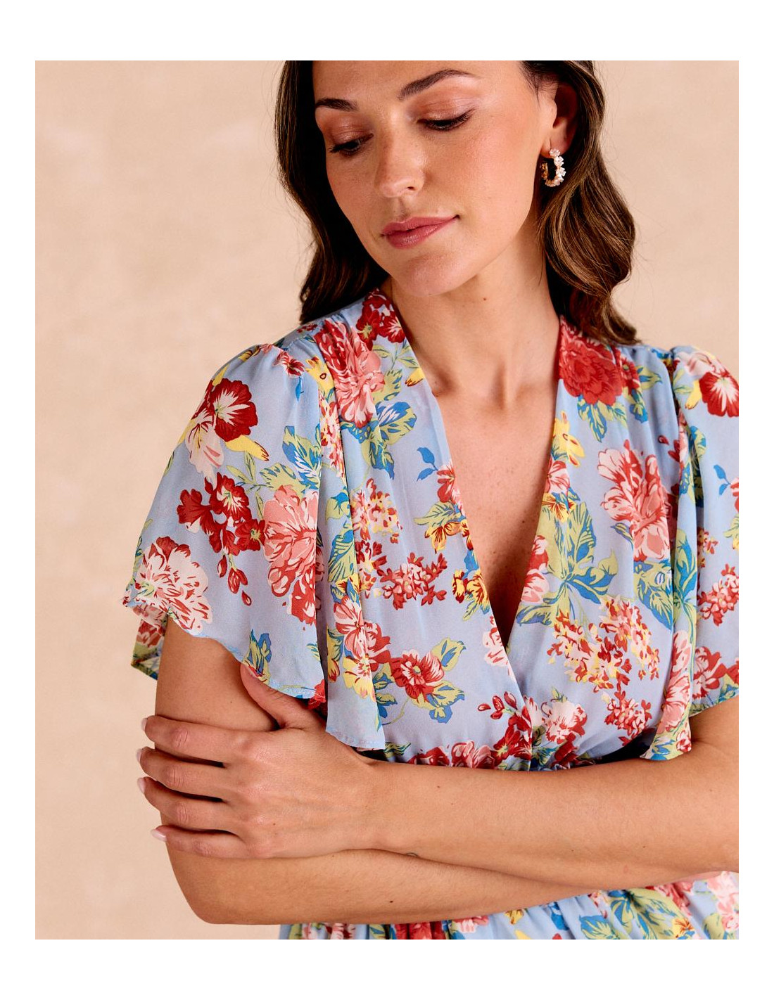 Vestido largo color celeste con estampado floral, mangas cortas y corte en la cintura con elástico.