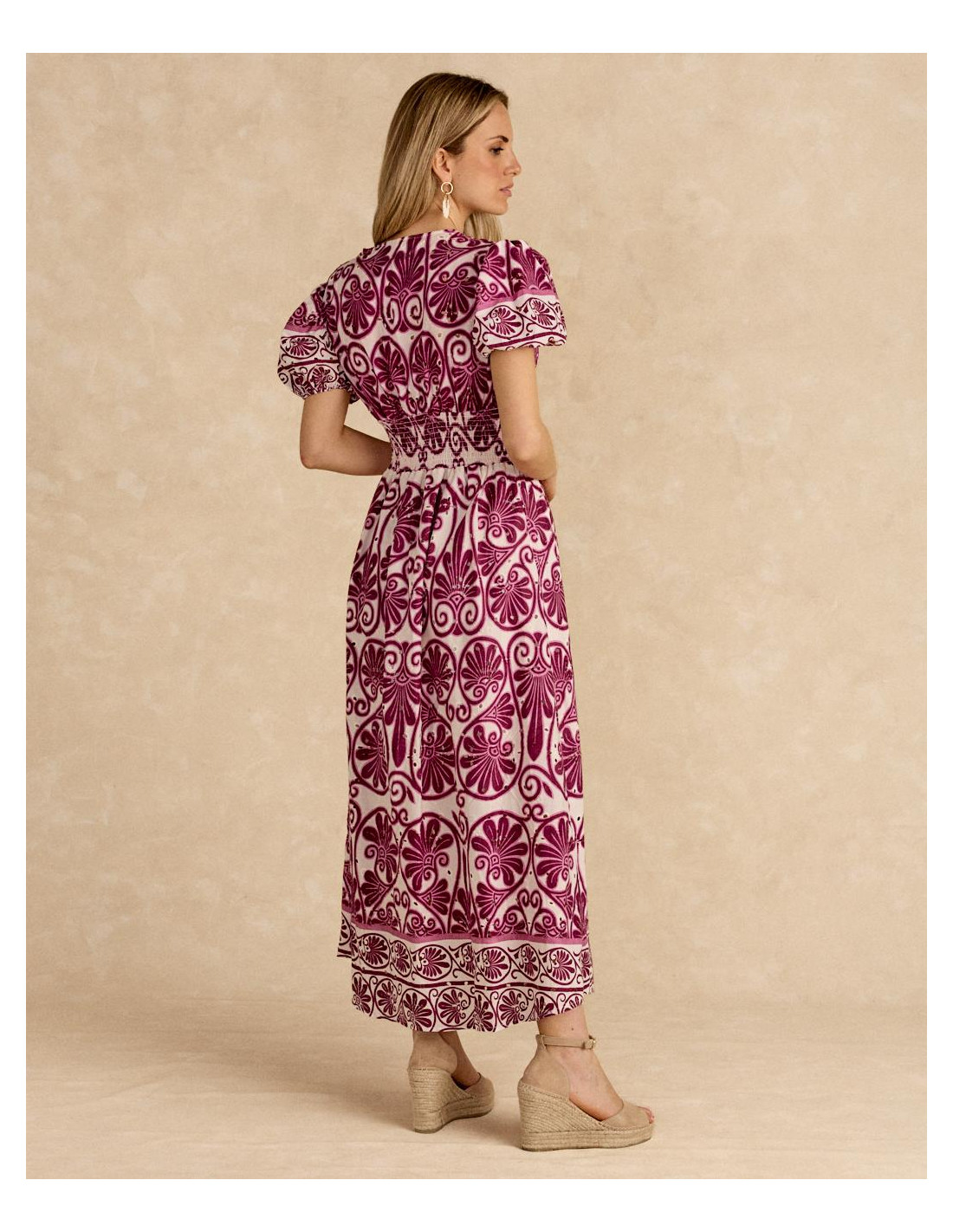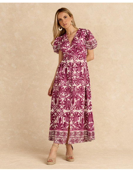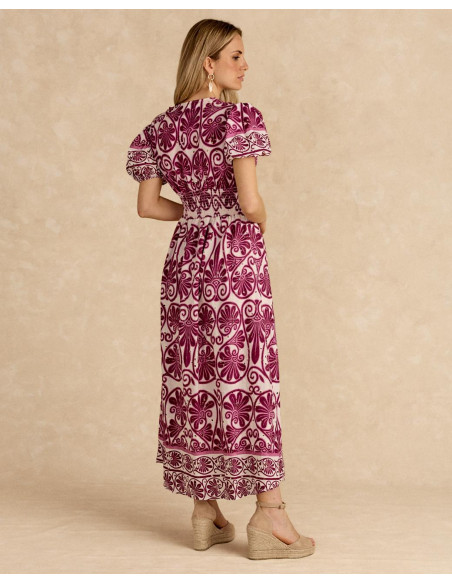 <p><span style="font-size: 10pt; font-family: Arial;">Vestido largo color buganvilla con estampado floral, manga corta y falda fluida. Diseñado.</span></p>