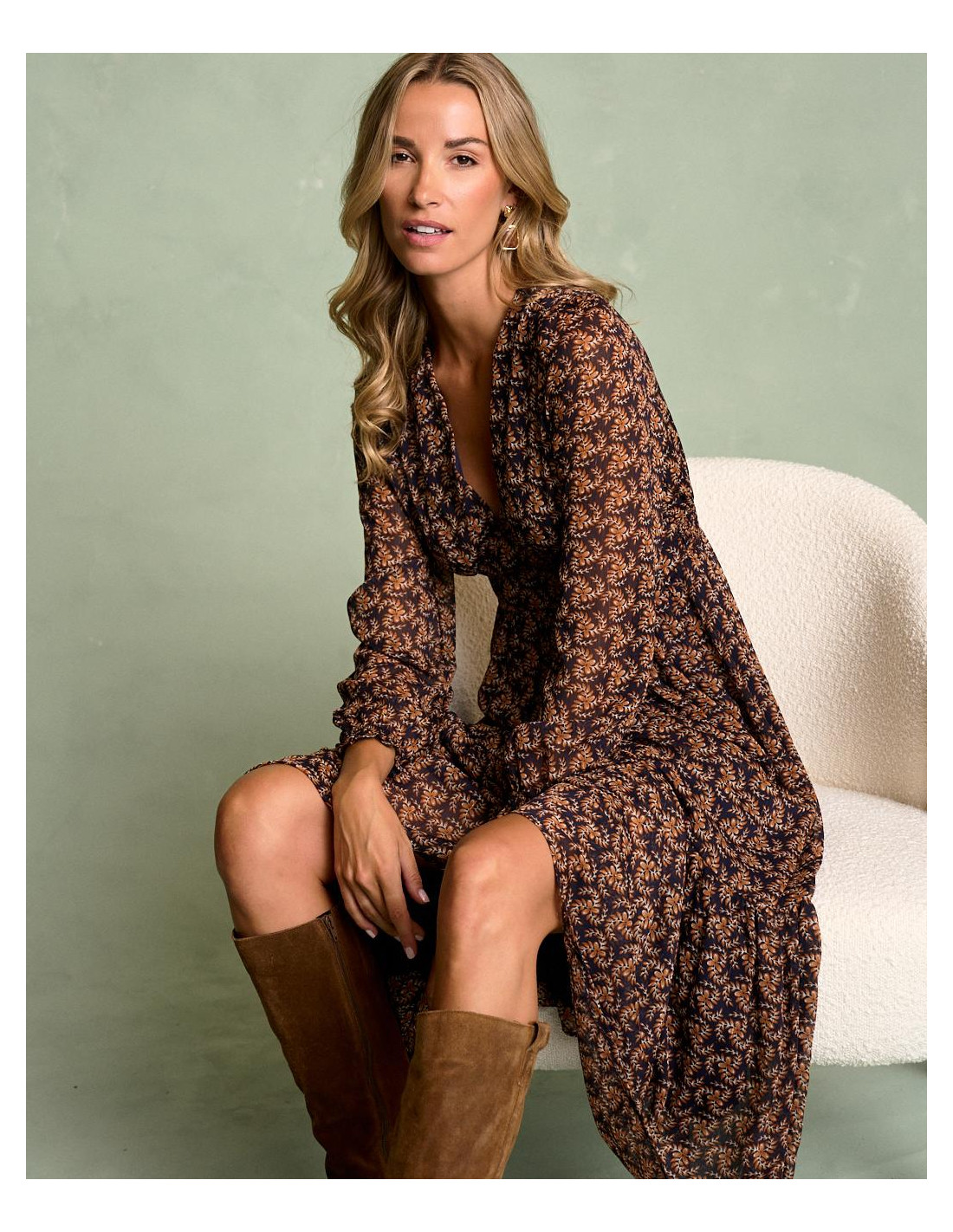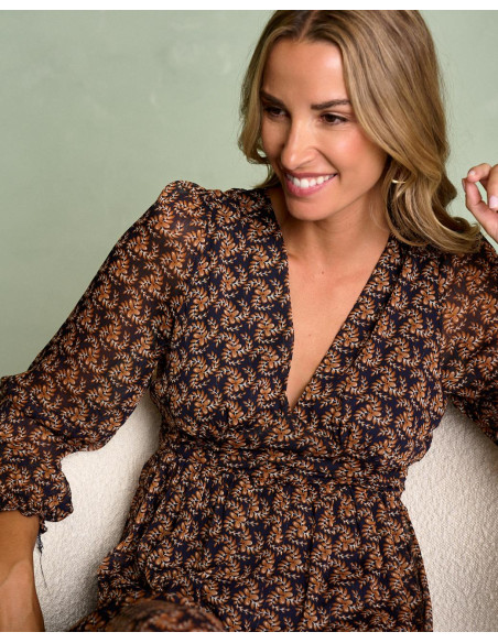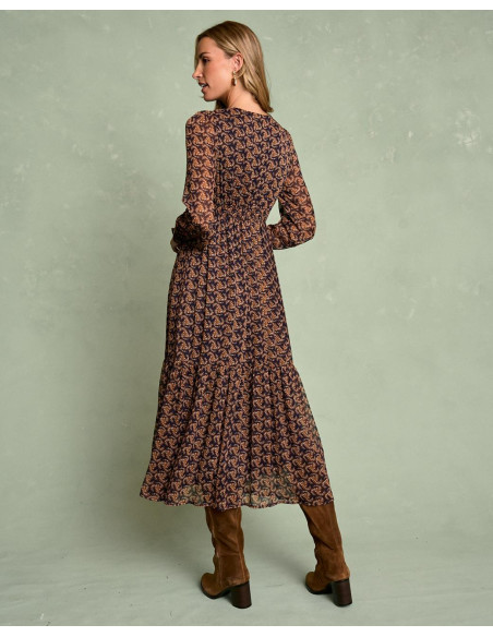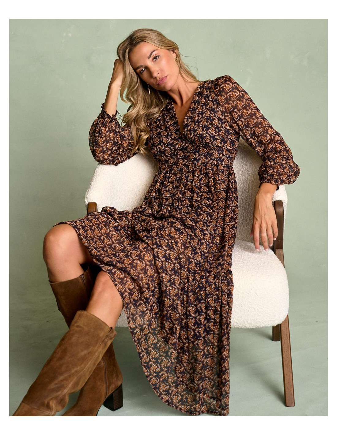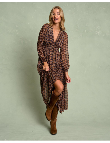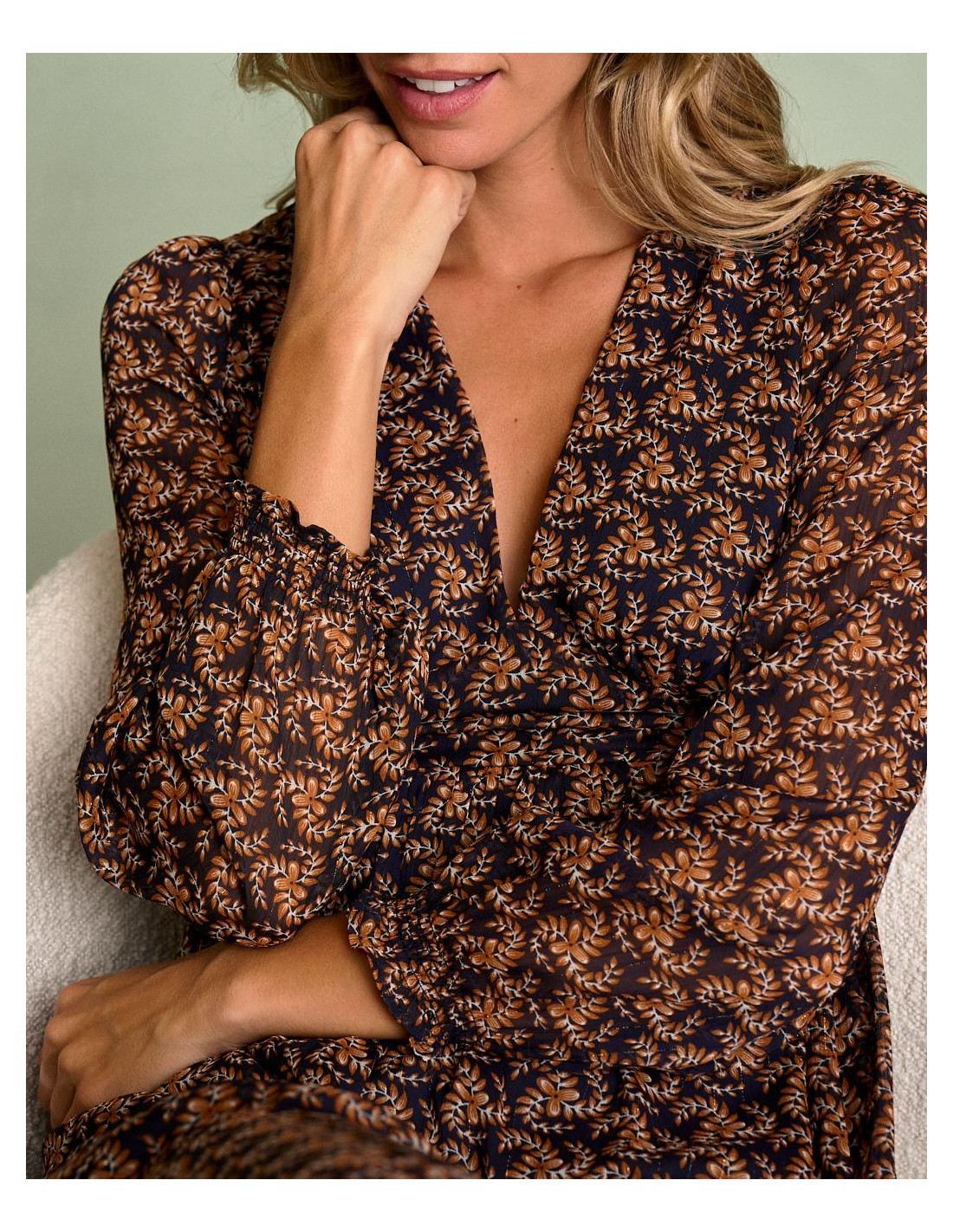 <p><span style="font-size: 10pt; font-family: Arial;">Vestido largo de gasa en color marrón con estampado en tonos azul marino. Su diseño cruzado crea un favorecedor escote en pico, mientras que la goma elástica y un fruncido en la cintura realzan la silueta. Las mangas son largas y ligeramente abullonadas.</span></p>