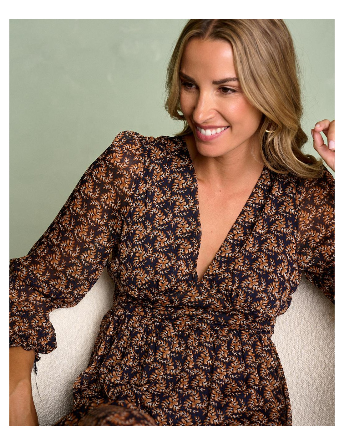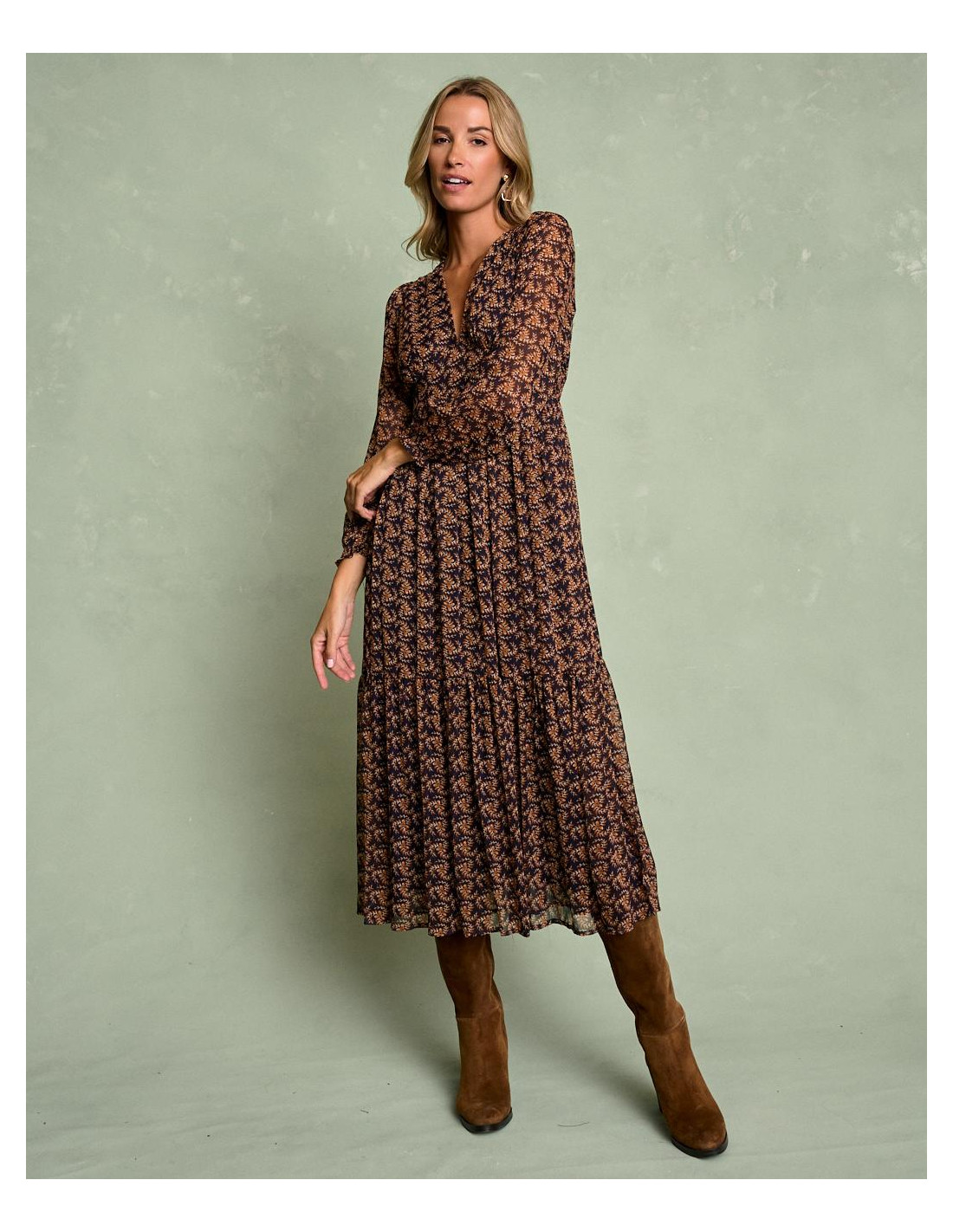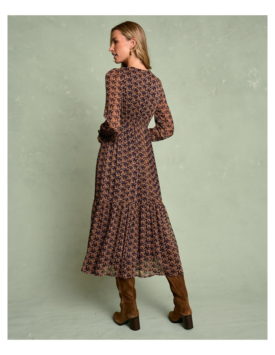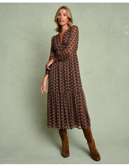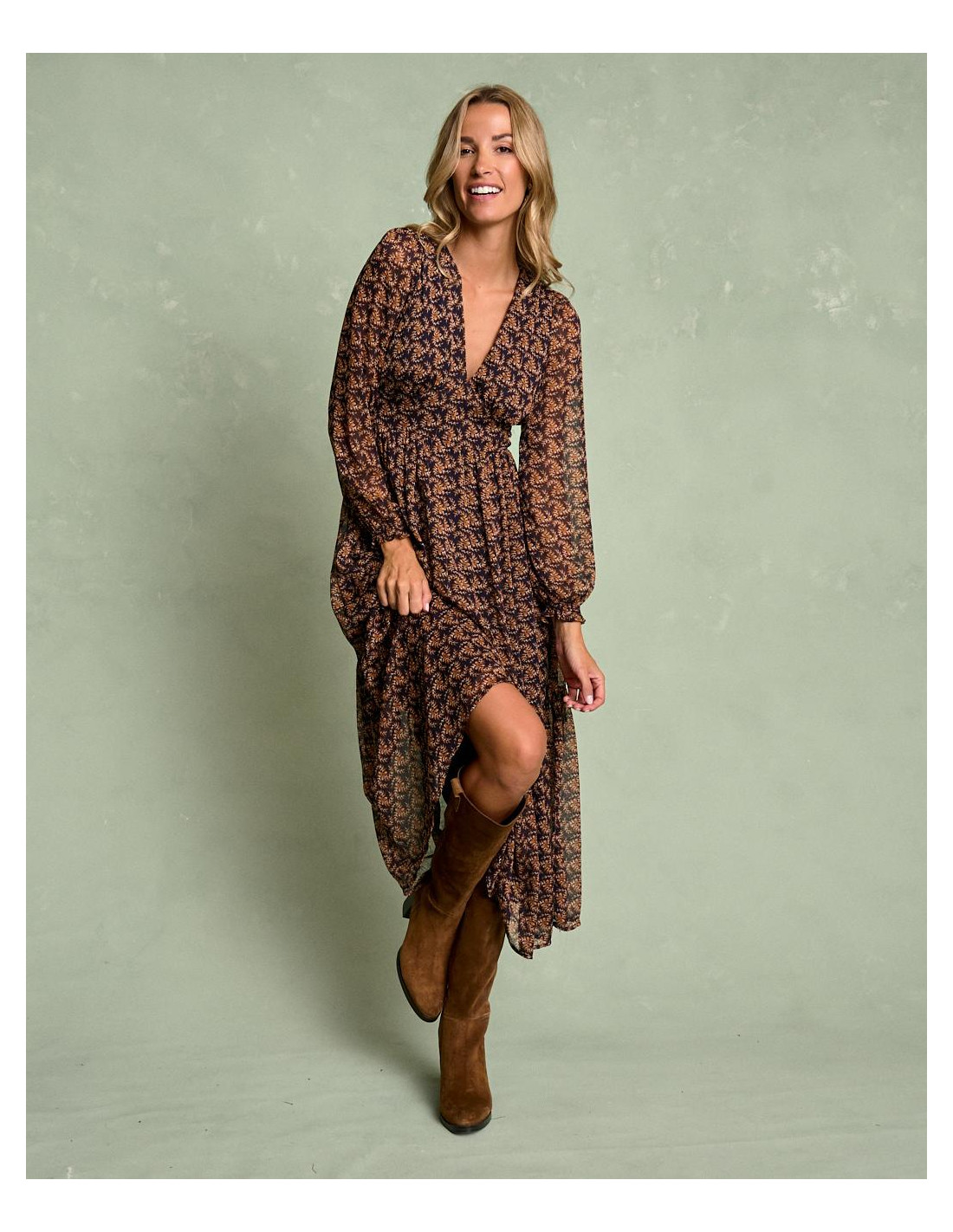 <p><span style="font-size: 10pt; font-family: Arial;">Vestido largo de gasa en color marrón con estampado en tonos azul marino. Su diseño cruzado crea un favorecedor escote en pico, mientras que la goma elástica y un fruncido en la cintura realzan la silueta. Las mangas son largas y ligeramente abullonadas.</span></p>